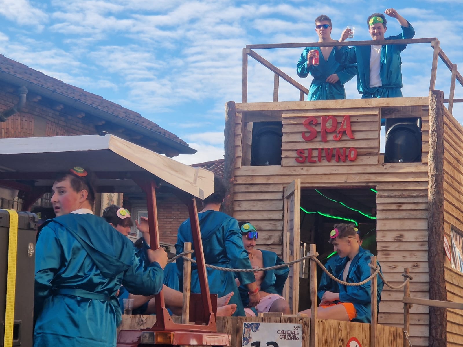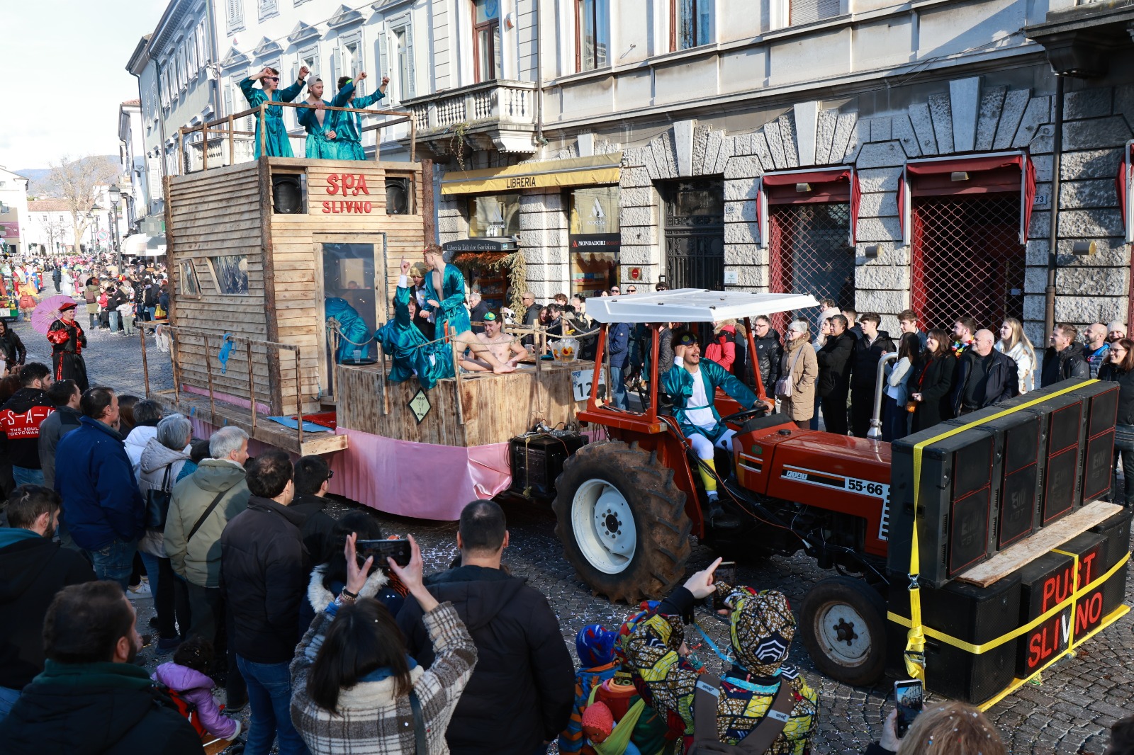 «Quest’anno abbiamo voluto un po’ scherzare sul fatto che prima del 2025 a Gorizia non c’erano feste o movimento – spiega il referente Nicolas Piron – così abbiamo deciso di realizzare i Go! Stbusters, auspicando che dopo il ’25 ci siano ancora queste feste, e quindi siamo arrivati ad acchiappare i fantasmi». Un centinaio gli iscritti, con un’ottantina di figuranti a danzare in tuta e zaino, seguiti dalla Cadillac bianca su cui campeggia un gigantesco Slimer. A trasformarsi in soffioni sono invece gli abitanti di Opatje Selo fra mille bolle di sapone, seguiti dalle laboriose formiche di Santa Croce. Troppo stress e stanchezza vi deprimono? Basta provare il centro benessere di Slivia, dove è possibile rilassarsi e staccare la spina dagli impegni: «Abbiamo scelto di realizzare una spa con sauna Jacuzzi davanti – specifica David Tercon – perché ultimamente il Carnevale sta stressando i vari gruppi, quindi il messaggio è quello di rilassarsi e divertirsi». Come ogni anno non poteva poi mancare il brio già estivo di Livio e Laura con i loro dolcissimi spaventapasseri, dietro i quali incede a passo lento un medico pronto a somministrare una flebo di vino friulano. Se il gruppo di Tolmino suona gli strumenti realizzati negli anni Cinquanta, la parata di Doberdò del Lago regala una spettacolare coreografia di maschere futuristiche dominate dal nero e dall’oro, precedendo un carro di animali geometrici. Ed è stato proprio questo ad aggiudicarsi il primo posto nella classifica finale, seguito dal carro di Sant’Andrea e in terza posizione da quello di San Floriano. Se a rallegrare la scorsa edizione erano i «vrzotari», quest’anno Sant’Andrea ha proposto un carro a “tema inflazione”: