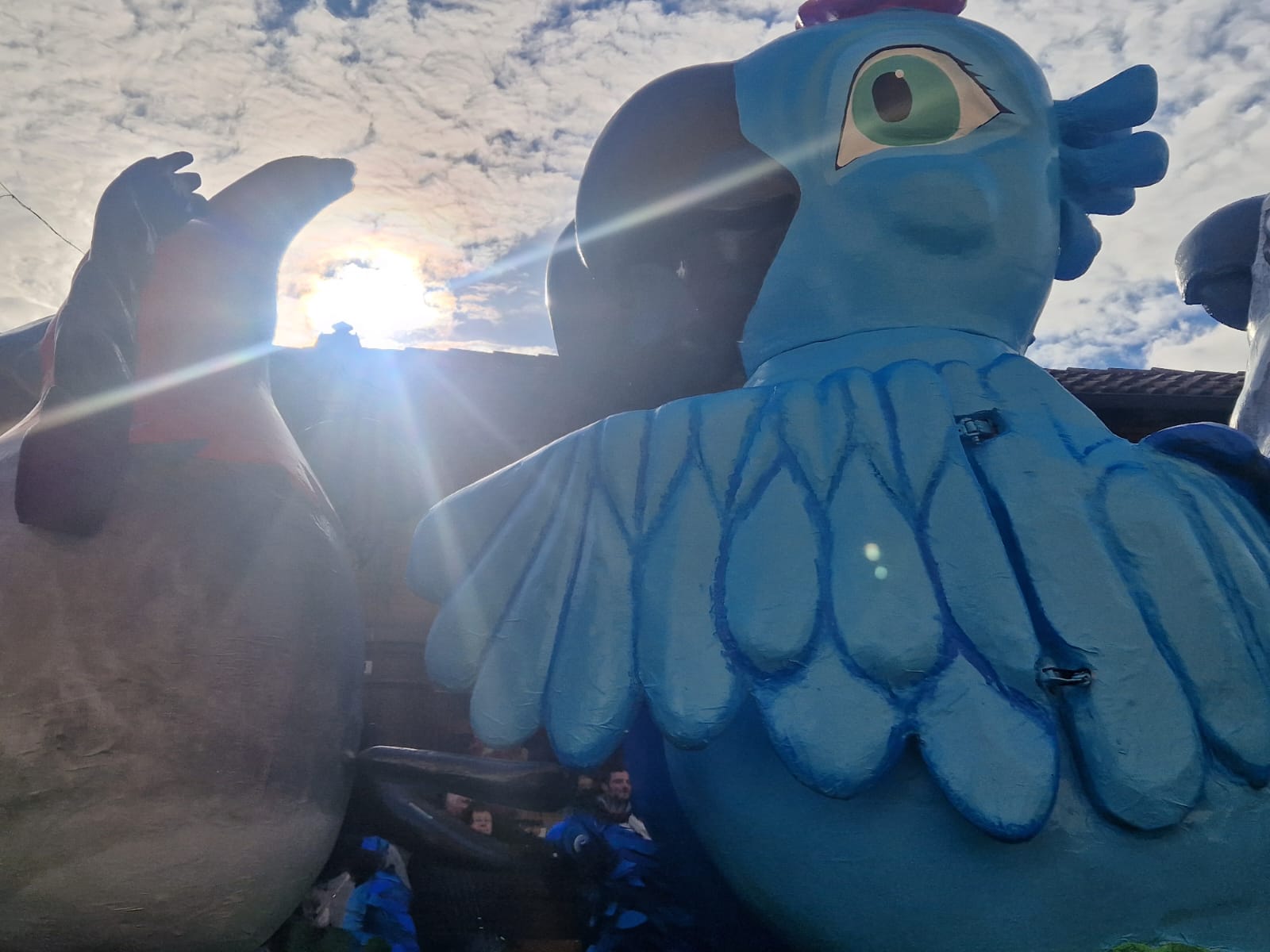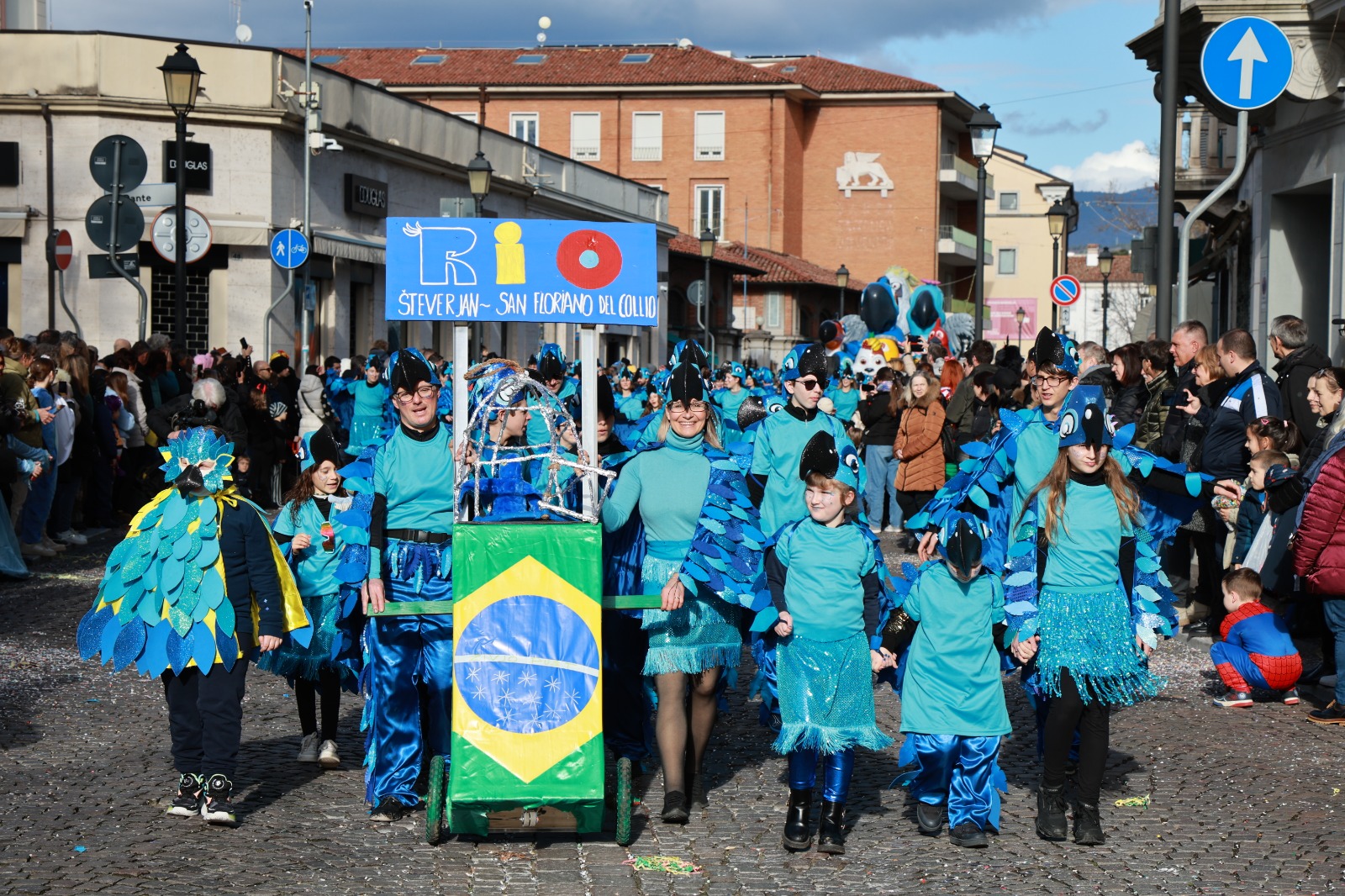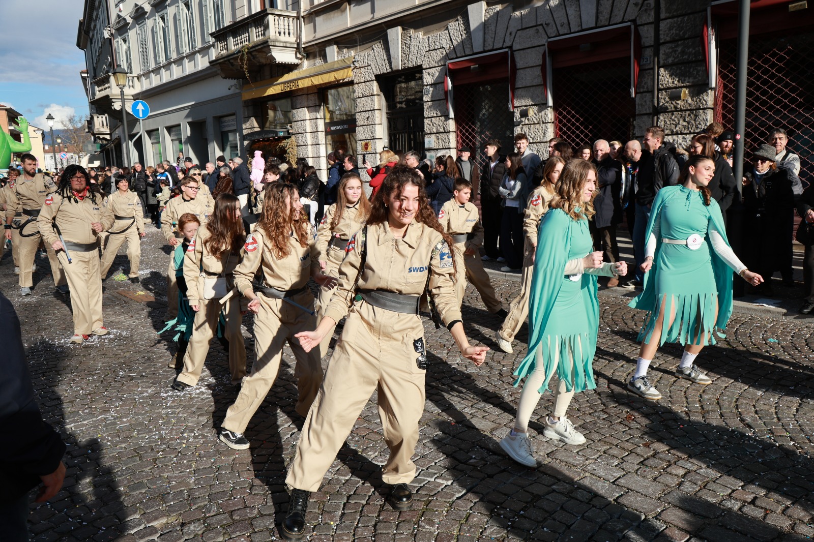 Direttamente da San Pelagio sono sbucati vasi fioriti e farfalle, perché «in un mondo dove tutto sta andando a rotoli abbiamo bisogno di cose semplici e belle». Come i Sette Nani – per l’esattezza trenta – di Colloredo di Prato, presenti con il gruppo allegorico “Fasin Fieste”: «Il nostro scopo è stare assieme e divertirci – assicura il referente Gabriele Del Bianco – condividendo una passione che comincia nel momento in cui decidiamo il tema e lo realizziamo in legna e cartapesta per passare le domeniche». Un carretto di quattro metri seguito dal corpo di ballo con Grandangolo, Trampolo, Birbantolo, Baffolo o il Nano single, a precedere il carro di otto metri con un nano che esce dalla miniera reggendo un diamante. L’associazione culturale Skala di Gabria si presenta invece con Aladino e il motto “Aladin, risolvi ‘sto casin!!” contro «guerre, crisi e occupazioni» di cui «sinceramente gavemo pieni i maroni». Su in cima al carro è montata la lampada, da cui sporge proprio lui, Aladino, che con cuffia da nuoto azzurra e braccia possenti è pronto a realizzare la magia. Brioso e danzante è invece “Blu” di San Floriano del Collio, che fra pappagalli e squadre di ballerini presenta uno strabiliante Carnevale di Rio. Dai pappagalli passiamo agli uomini delle caverne, scienziati ed esploratori, con “La storia del mondo” di Turriaco, seguito dagli attualissimi acchiappa fantasmi di “Go! Stbusters 2025” di Savogna d’Isonzo, che a suon di musica dei “Ghostbusters” ballano dietro a una sorprendente riproduzione del Go!Pharus, ammonendo: «Gorizia ha dimostrato di saper brillare, non lasciamo che finita la festa siano i fantasmi a comandare».