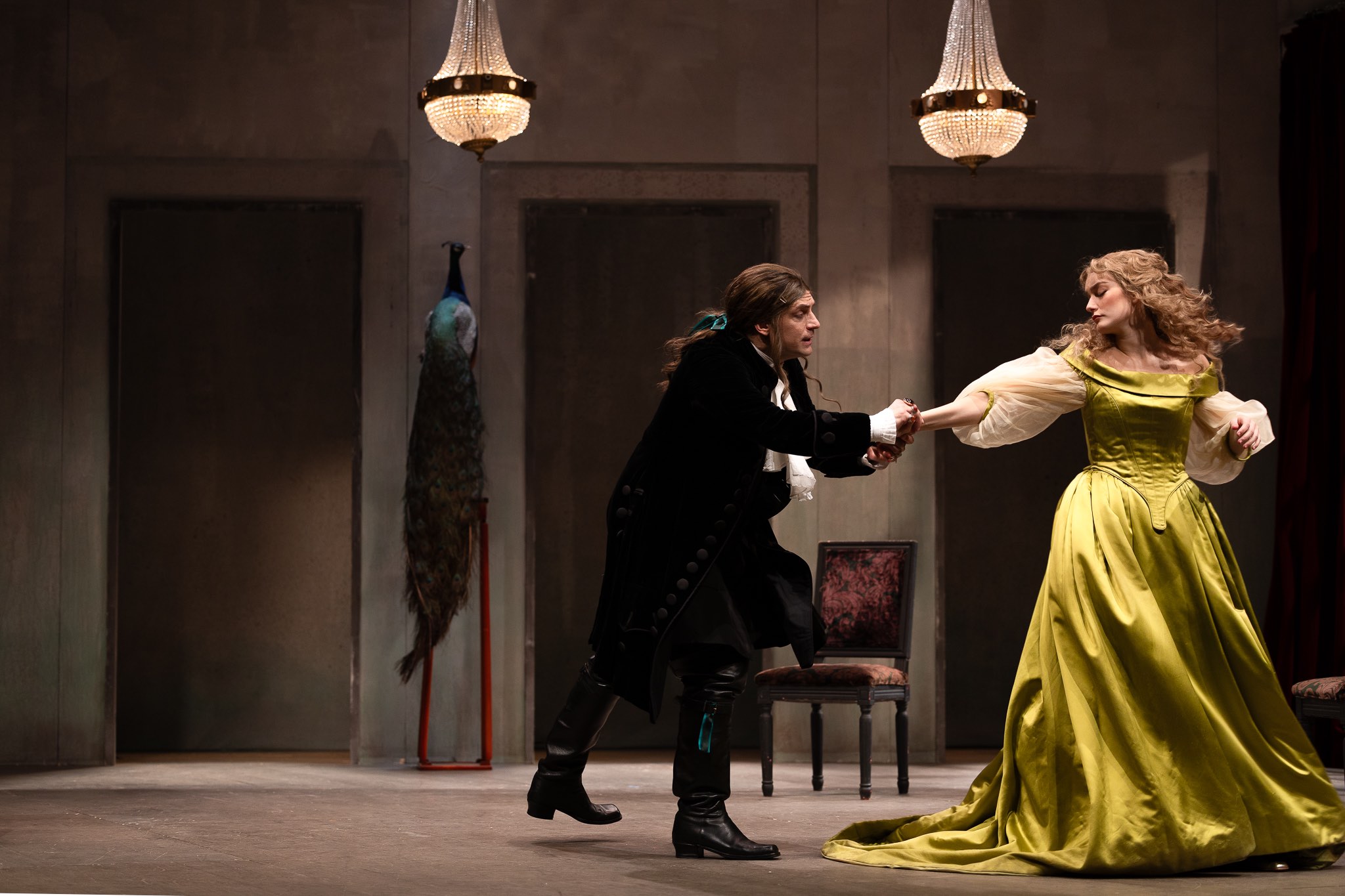 Alceste è Fausto Cabra, che indossa abiti scuri contrastando con gli altri personaggi raffigurati in vivaci colori primaverili. È una simbologia che s’incarna letteralmente sui protagonisti, “cucita su misura” per ciascuno? Per Cabra sicuramente: Alceste era nero con i fiocchi verdi, come si dice che fosse Molière: “L’homme avec un ruban vert” era Molière. Alla fine si dice: “L’uomo con il nastro verde”, lui ne ha qualcuno sugli stivali. L’idea che tutti abbiano la stessa foggia l’abbiamo affrontata con la Buzzi (costumista, ndr): i colori cambiano a seconda di come immaginavamo il personaggio. Per me Arsinoe è molto erotica ed è raffigurata in oro, Éliante rappresenta la purezza con il turchese, mentre Célimène indossa un verde brillante perché è molto energetica, giovanile e per niente ovvia. L’uomo color melanzana è invece Oronte, dove il viola rappresenta il potere e la chiesa. Però i costumi hanno tutti la stessa foggia, a parte quello di Alceste.