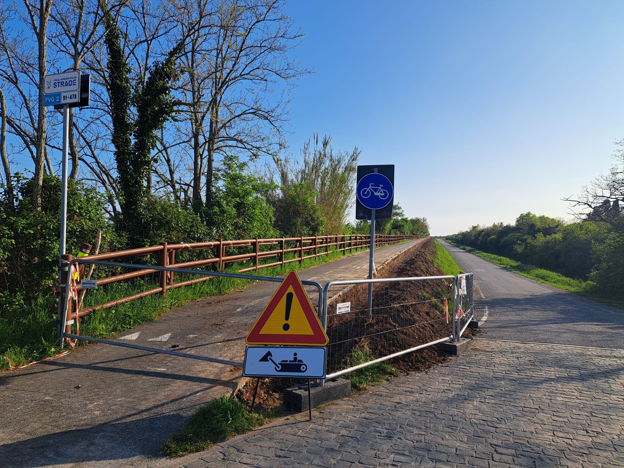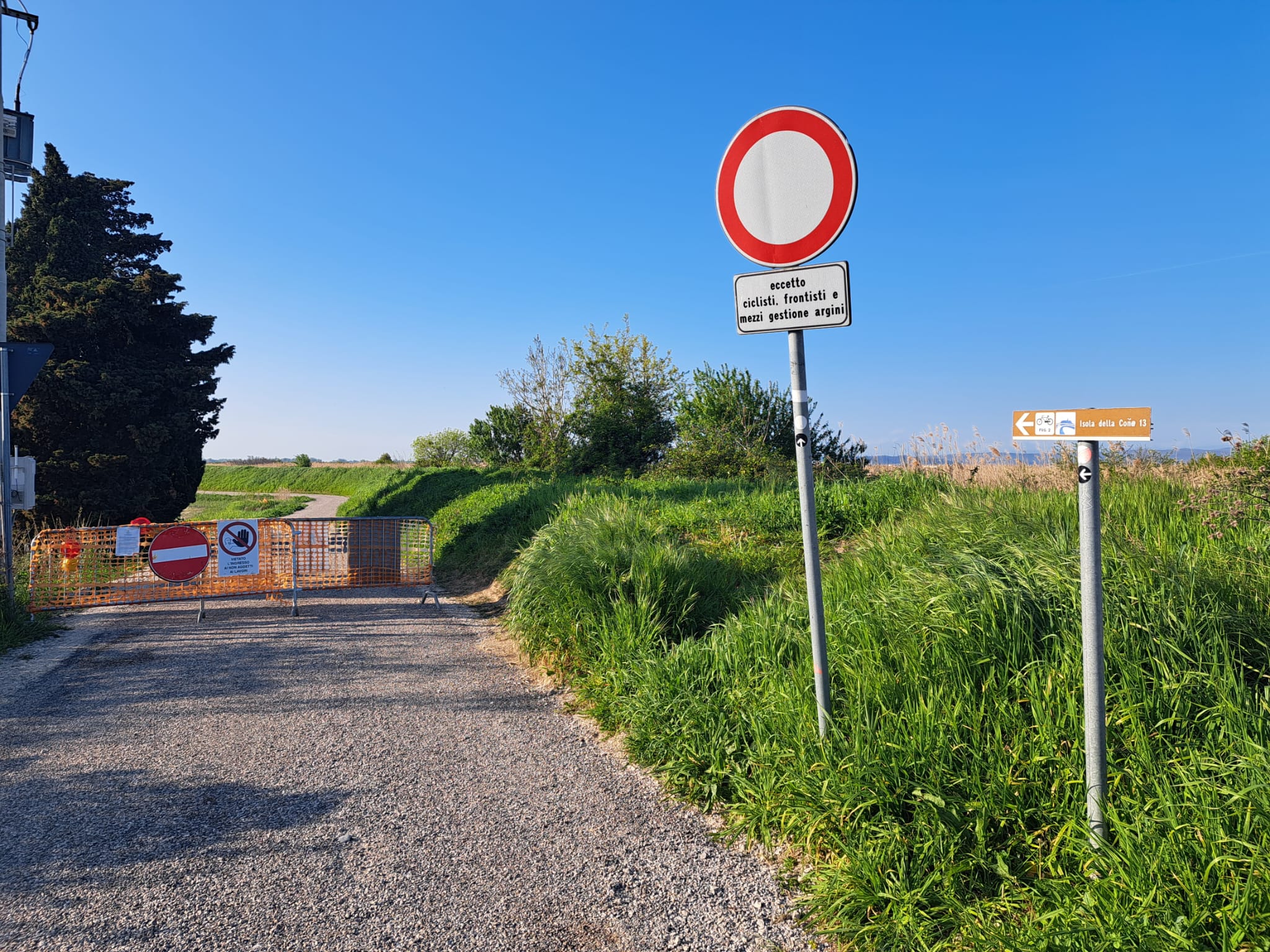 Il primo percorso dinanzi a cui i ciclisti si vedono costretti al dietrofront da transenne e cartelli interessa la Ciclovia FVG-5 dell’Isonzo nel territorio comunale di San Canzian d’Isonzo. Si tratta del tracciato che collega il ponte sul fiume della strada statale 14 tra Pieris e Fiumicello a quello della SP19 in direzione Grado, per proseguire infine verso l’Isola della Cona.