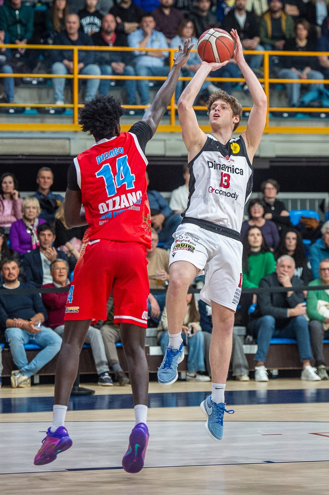 Pillole di match. Avvitamento di Ius, tripla di Carnovali seguita da schiacciata di Odah, risposta dall’arco di Micalich e ancora Ius imbeccato da Perin, poi nove punti in tre azioni per Ozzano che cerca il primo break (7-14 a -4.50) ripresa da Capitan Colli che piazza pure la tripla dall’angolo (grosso modo dalla mattonella di Alberto Ardessi) per il 17-19 della prima pausa. Ecco, per molti aspetti il primo quarto è una veritiera sintesi del resto del match (ospiti che tentano più volte di allungare toccando al massimo il +8, Dinamo che rimane ferocemente aggrappata lottando su ogni singolo pallone) con un cambiamento di spartito nella quarta frazione dove una triplona di Giacchè ha fatto mettere il naso avanti a Gorizia (61-60 a – 7.20) per un avvincente finale da sorpassi e contro-sorpassi che ha premiato il quintetto di casa grazie al tap-in vincente di Ius. Nel corpo centrale della sfida tanti momenti di pallacanestro intensa, a tratti intensissima con la Dinamo che voleva assolutamente regalarsi un’altra serata da incorniciare e i NFB che a loro volta volevano ribadire anche al PalaBigot la loro supremazia. I due migliori attacchi del campionato hanno lasciato le luci della ribalta alle rispettive difese per un match vibrante che ha toccato le corde come sapeva fare la pallacanestro degli Anni Ottanta e Novanta. Come ricordato la capolista ha condotto per lunghi, quasi tutti, tratti i giochi nonostante la prematura uscita per infortunio di Odah confermando di non essere la Regina del girone per puro caso. Il secondo quarto si è sviluppato all’insegna del punto a punto con Ozzano che sfrutta al meglio gli ultimi possessi andando all’intervallo lungo con il massimo vantaggio (31-39) grazie in particolare a Tosini e Piazza. Al rientro dagli spogliatoi la Dinamica ricuce subito lo strappo con Micalich e Perin, la Logimatic risponde con Negri e ancora Tosini e successivamente torna al + 8 (41-49) con Carnovali e Diambo. Ma Gorizia c’è e in questo frangente, oltre a sbloccarsi Giacchè, è in particolare Perin a reggere l’urto emiliano firmando in transizione il 56-58 che riapre definitivamente i giochi alla vigilia dell’ultima frazione. Il 2/2 di Colli dalla “linea della carità” di fatto fà ricominciare il match dall’inizio per 10’ vibranti come non mai, nipoti di quella pallacanestro d’altri tempi vista per decenni in riva all’Isonzo. Dall’arco Giacchè riporta in vantaggio la Dinamo come non capitava dalla prima metà del quarto iniziale, Ozzano non ci pensa nemmeno lontanamente a lasciare strada affidandosi in questa fase a Folli e Diambo. Una tripla di Micalich sommata a un doppio rimbalzo offensivo di Colli premiato dal bersaglio dalla distanza di Giacchè cominciano a far venire giù il PalaBigot (73-69 a -1’.1”), Chiappetti e Piazza infilano un 5-0 esterno che a trenta secondi dal termine riporta avanti la capolista. La Dinamo costruisce il tiro per Perin, il ferro dice no ma piombano sulla palla a spicchi Colli e Ius con il secondo a infilare in tap-in di tabella chiudendo la sfida dopo averla inaugurata con il primo canestro della serata.