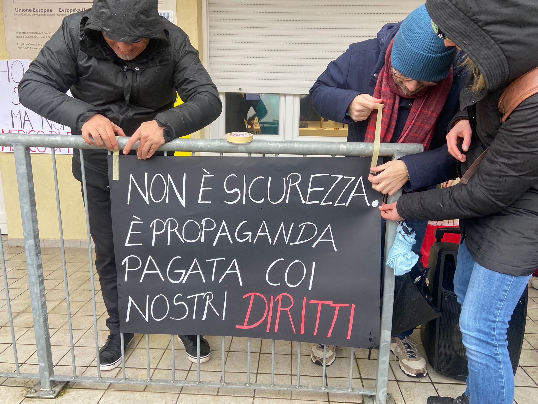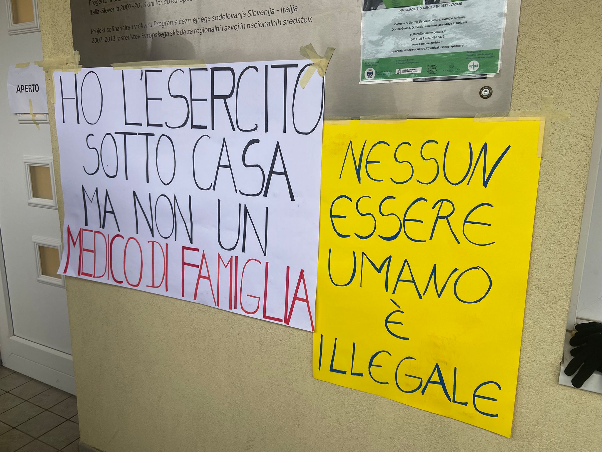 La sospensione di quell’accordo che alla fine del 2007 aveva garantito passaggi liberi tra Italia e Slovenia, ha provocato da due anni e tre mesi – dal 21 ottobre 2023 – una nuova militarizzazione dei confini. Vengono denunciati dei costi giornalieri per l’operatività dei controlli dai 30mila ai 45mila euro. Sono risorse che, come spiega il gruppo dei Giochi, potrebbero essere usate per arginare la crisi della sanità pubblica. “Ho l’esercito sotto casa ma non un medico di famiglia”, recita uno dei cartelloni.