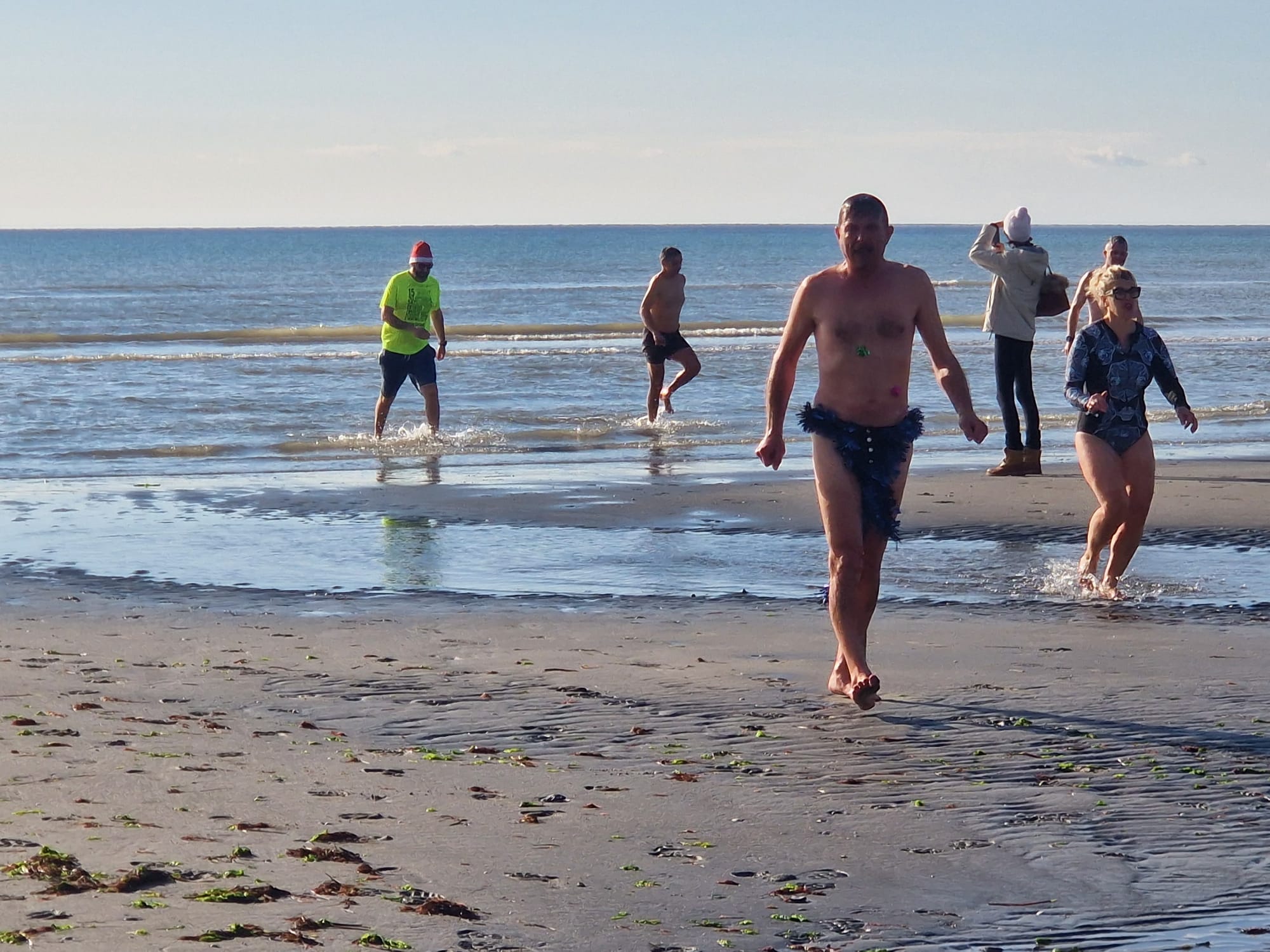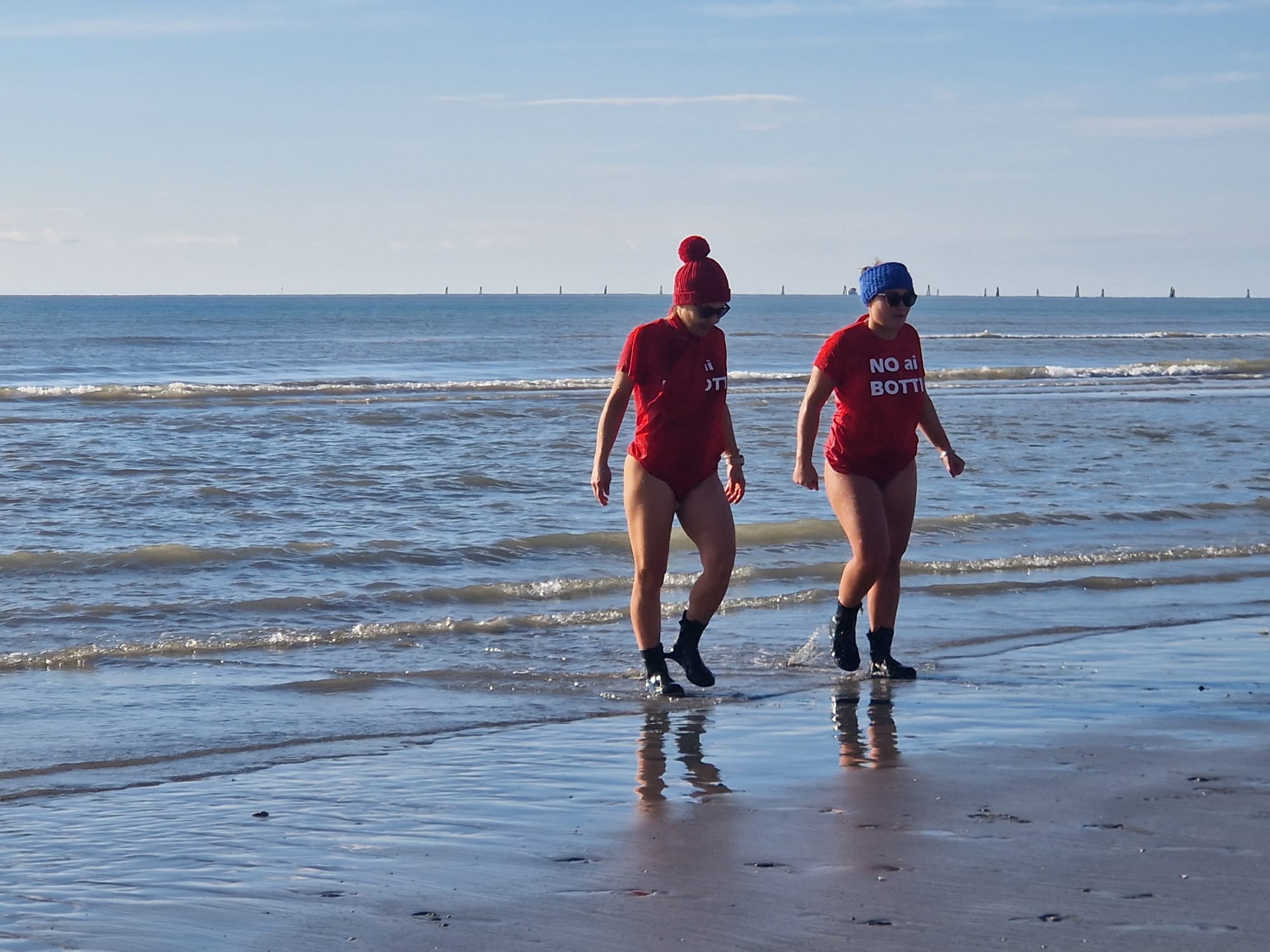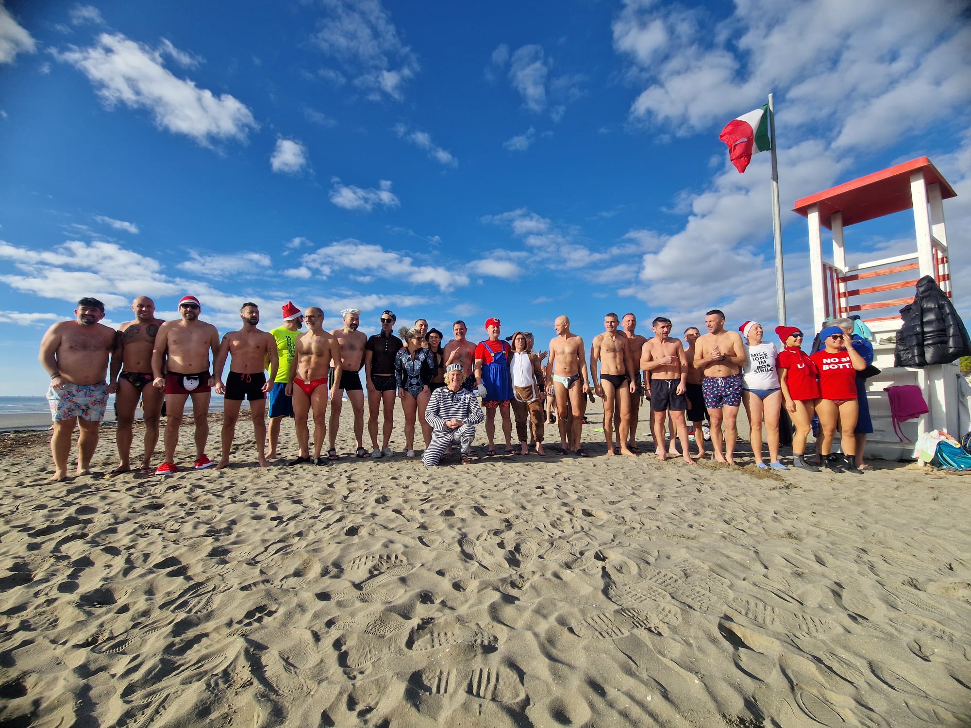 «Durante il periodo del Covid – evidenzia - eravamo in due o tre. È sempre un’emozione che dà la carica, l’energia per partire alla grande con il prossimo anno. L’aspetto divertente è che un evento molto goliardico: ci si traveste, ciascuno indossa un accessorio rosso o altro di simpatico per festeggiare e stare assieme». Così, non poteva mancare la renna-canguro impersonata da Daniele di Mortegliano, che sotto il pellicciotto indossa la tuta termica e partecipa con il gruppo di motociclisti Free Rider’s Spirits: «Abbiamo scelto di partecipare – ammette - per farci conoscere e sostenere l’iniziativa». «Siamo pochi – interviene il segretario del Motoclub Martino – ma coraggiosi. L’idea di partecipare è venuta al nostro socio Michele. Bisogna convincersi che faccia caldo», conclude con un sorriso. Ad attendere il gruppo nel sole d’inverno che bacia la Diga è anche Nicola: «Sono un amico di Marco – rivela - e dal 2015 lo assecondo in questa bellissima tradizione che nel 2019 portò a fare il bagno circa un centinaio di persone. Il nostro sogno sarebbe stato quello di spalmarsi su tutta la lunghezza della spiaggia, ma il Covid e altri eventi hanno portato il gruppo a stabilizzarsi sulle cinquanta o sessanta unità». Sette i gradi dell’acqua di mare registrata da uno dei tuffatori prima del bagno corale. Berretti rossi da Babbo Natale, costumi da Super Mario o festoni natalizi a cingere i fianchi, il gruppo si è diretto in corsa verso le acque cristalline tenendosi per mano.