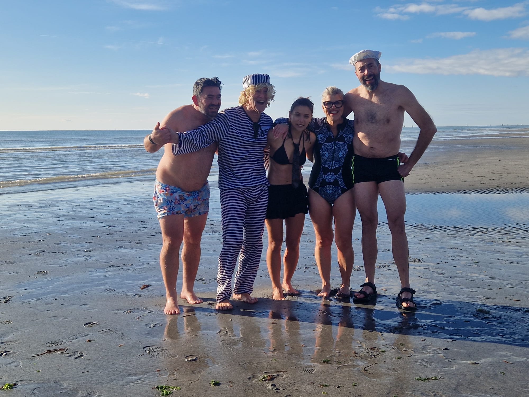 Marco Negrini iniziò a tuffarsi a San Silvestro nel gelido inverno del 2014. Quel giorno era solo come Tom Hanks in “Forrest Gump”, quando il protagonista inizia a correre “fino alla fine della strada” per poi raggiungere l’oceano. Allo stesso modo di Forrest, negli anni Marco ha raccolto adepti creando un gruppo affiatato che ogni anno si ritrova in spiaggia per gli auguri. Si è svolto a mezzogiorno di oggi - in una frizzante giornata di sole - il tradizionale tuffo del 31 dicembre in Costa Azzurra a Grado, giunto alla sua undicesima edizione. «Iniziai undici anni fa – racconta - ed ero da solo. L’anno successivo eravamo una decina e via avanti fino a oggi, che siamo un bel gruppetto: austriaci, udinesi, ma anche gente che viene da fuori regione». Come Lara e Marcello, che per fare il bagno e ritrovare gli amici accorrono da Ferrara. Maurizio è invece di Passons, e il tuffo sull’Isola del Sole lo ha sperimentato anche per il solstizio d’inverno: «Era relativamente calda – osserva con ironia - ormai sono quattro anni che mi tuffo fra Bibione e Trieste, ma questa di San Silvestro è la prima qui a Grado. Finché ce la faccio mi tuffo». Fra loro c’è poi la gradese Francesca, che oltre a partecipare alla marcia del panettone sperimenta l’ebbrezza rigenerante del bagno nelle acque gelide ormai da otto anni: