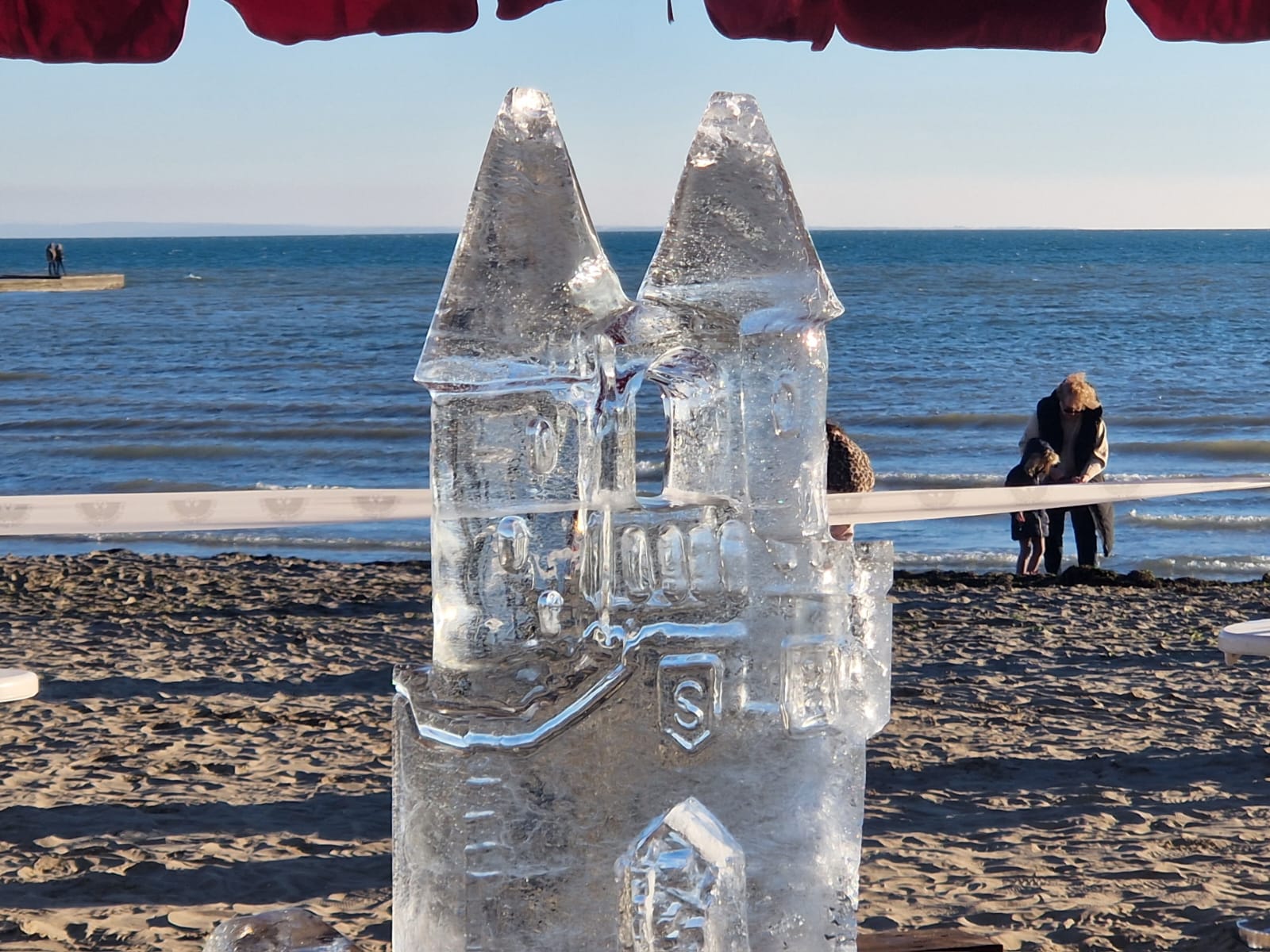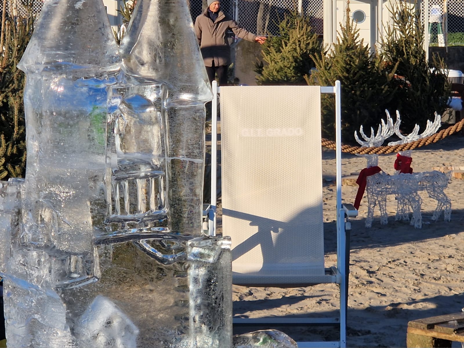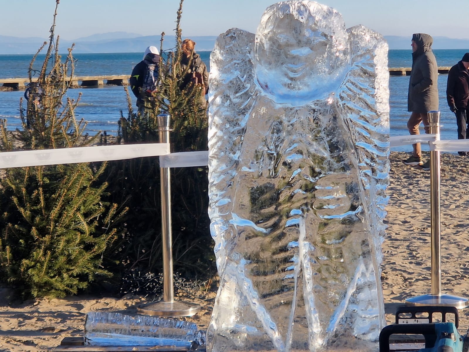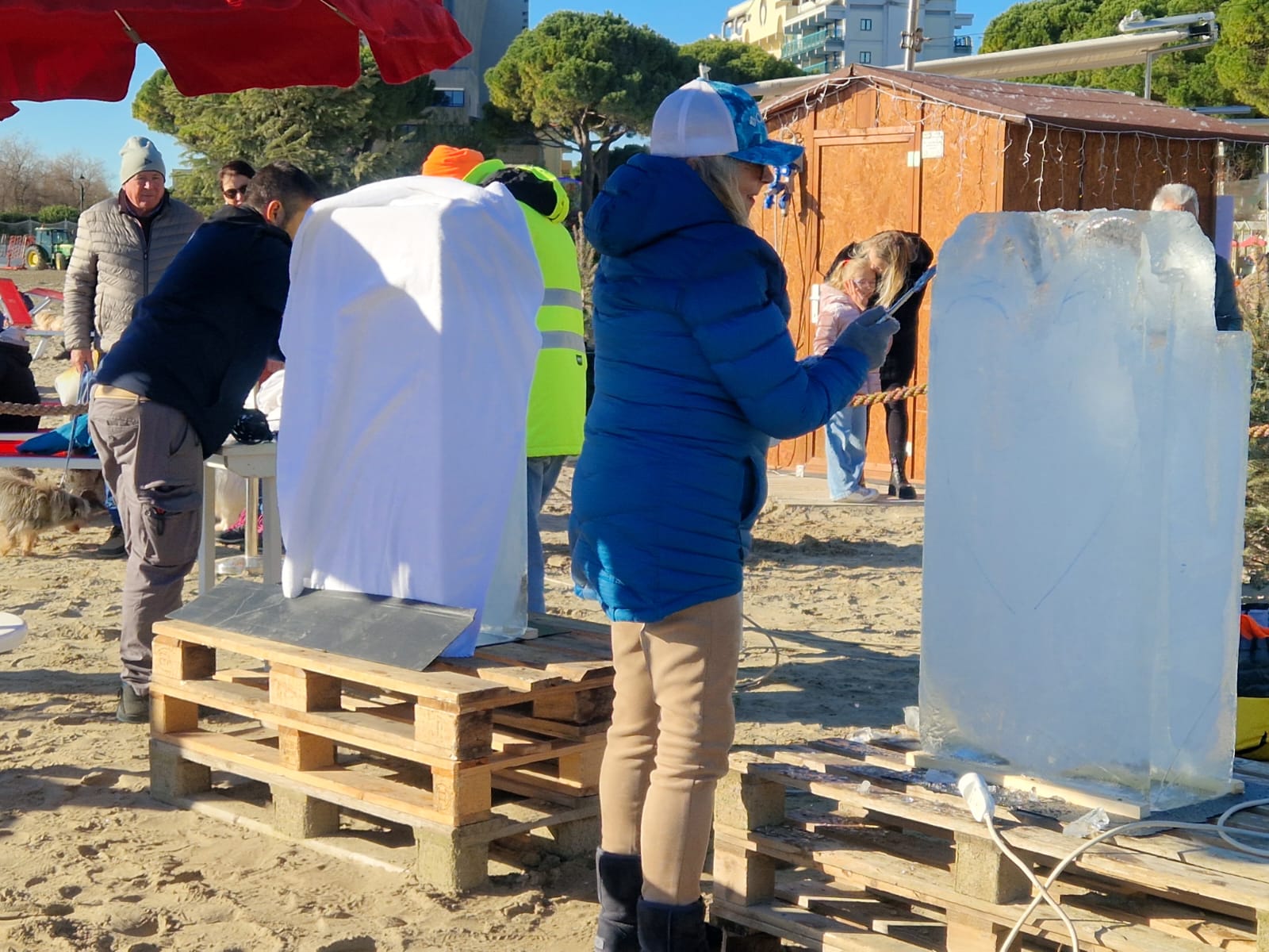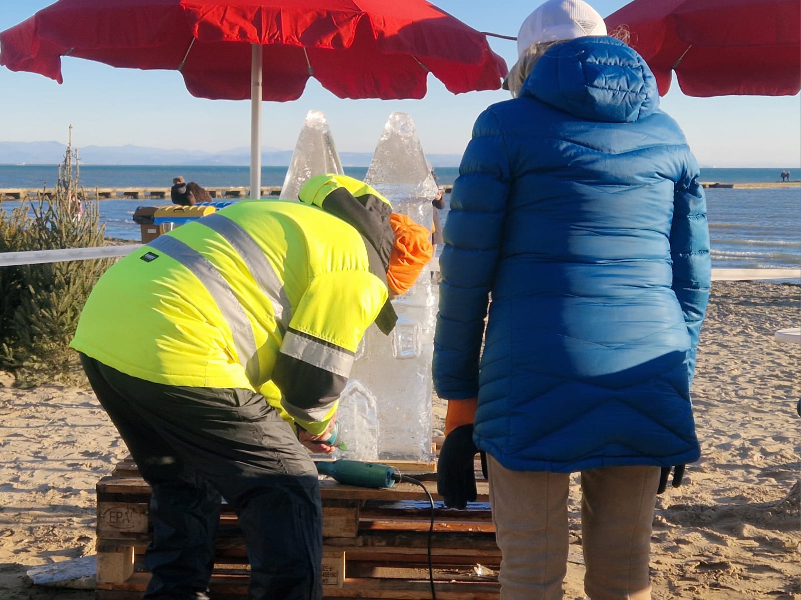 Un monolite di ghiaccio si erge sulla spiaggia di Grado, fra gli abeti di Natale che sorgono in riva al mare. Non siamo sul set di “2001: Odissea nello spazio”, ma nella location della Winter Season al Bar Numero Uno della spiaggia GIT. Vicino al primo blocco la scavatrice ne scarica un secondo, sommando il peso di entrambi si raggiungono i tre quintali. A scolpirli contro il sole e il vento per realizzare un angelo e un castello sono Francesca e Walter, da oltre trent’anni appassionati di “arte effimera”: «Girando per il mondo – ammette Francesca di Sandy Tales – realizziamo sculture in sabbia, neve o ghiaccio». Storie che raccontano di animali, marinai in viaggio o castelli incantati, ma anche abbracci e Natività: parole di rena e simmetrie di cristalli destinate a sciogliersi al sole, non prima di aver dispensato gioia e sorrisi. «La Winter Season – sottolinea il presidente GIT Roberto Marin - è alla sua seconda edizione. Lo scorso anno ci avevano dato dei pazzi e visionari; invece, è stato un grande successo che abbiamo voluto replicare. La soddisfazione più grande è che quasi tutte le spiagge d’Italia hanno colto la nostra idea, in quanto è un grande veicolo di promozione del territorio, ma soprattutto un’offerta del mare d’inverno come soluzione vincente e interessante». «Tutto ebbe inizio – ricorda Francesca - per far giocare i bambini sulla spiaggia. La gente si fermava ad ammirare, da lì abbiamo pensato di partecipare al primo campionato italiano di sculture in sabbia e abbiamo vinto».