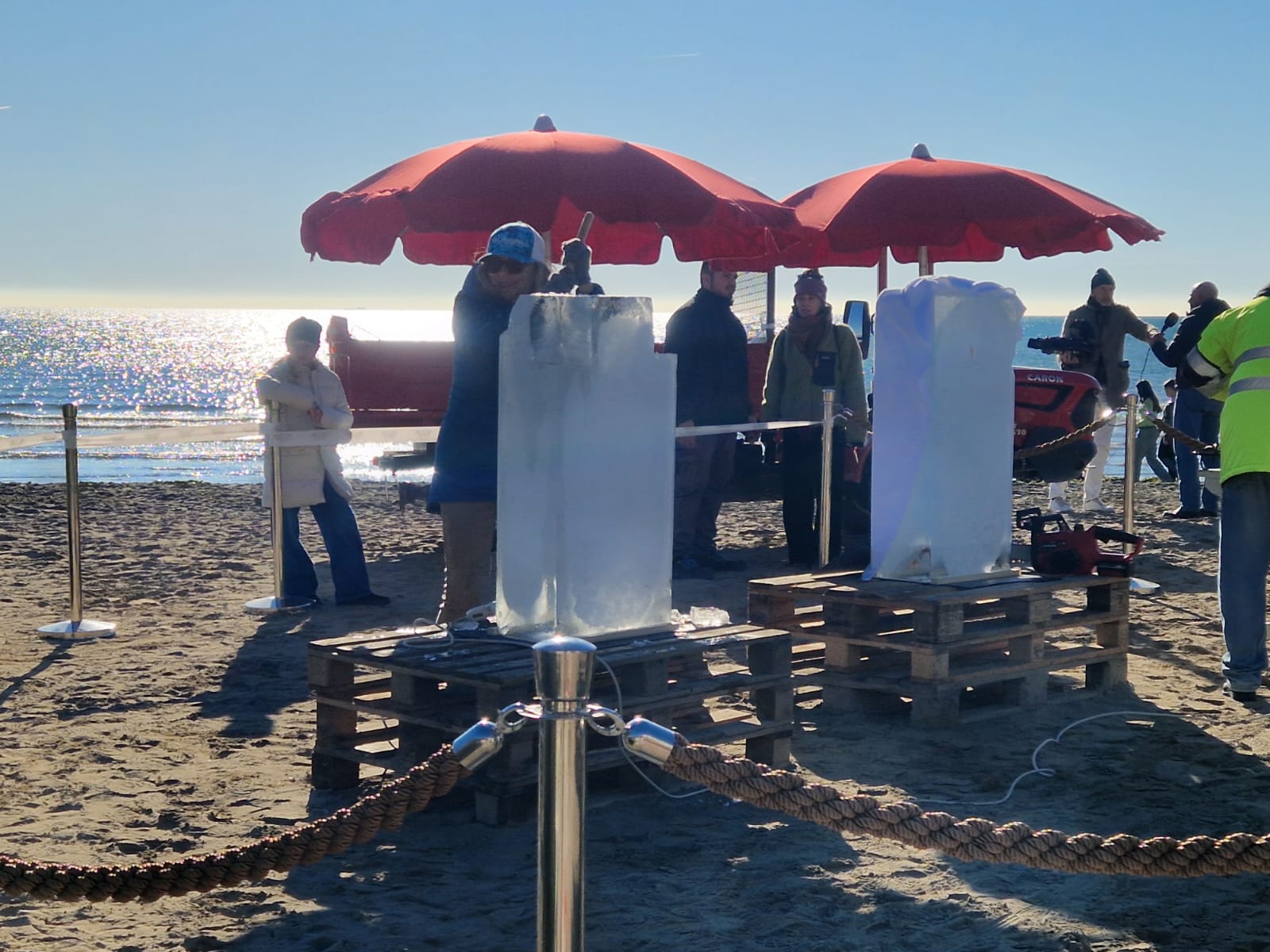 Nella tarda mattinata Walter inizia a tagliare piccoli pezzi dal primo blocco: «Sono i materiali, che ci governano – rimarca Francesca – e si disfano per il sole. Speriamo di riuscire a finirlo prima che si sciolga». «Iniziammo per far giocare i bambini con la sabbia – interviene Walter - e per caso finimmo a Cervia in una manifestazione internazionale, aggiudicandoci il campionato italiano. Poi il presidente degli scultori di ghiaccio – un finlandese – ci propose sculture di neve e ghiaccio e iniziammo a girare il mondo, finché ci ha frenato il Covid. L’emozione più grande è lasciare una sorpresa ai bambini – riconosce - oltre che ai grandi. È un’attività che ci è scappata di mano, che dal gioco è diventata arte, e direi anche una professione». Un’esperienza unica che in Cina li ha condotti a lavorare con ben undici blocchi: «Hanno dovuto aiutarci col muletto – rammenta - perché non ce la facevamo. Noi lavoravamo con la giacca a vento, mentre i due giovani mongoli accanto erano in maniche corte e tiravano su il blocco come fosse una palla». È stato proprio ad Harbin, cittadina di undici milioni di abitanti, che nel 2017 si sono aggiudicati il premio della Giuria come primi italiani: «Anche quest’anno ci hanno invitato – prosegue - ma saremmo dovuti restare una ventina di giorni, e abbiamo rinunciato». Creazioni artistiche che accendono un importante giro d’affari, ancora sottovalutate nel nostro Paese: «In Italia si fa poco – considera - anche se con le spiagge che abbiamo potremmo organizzarne una a settimana.