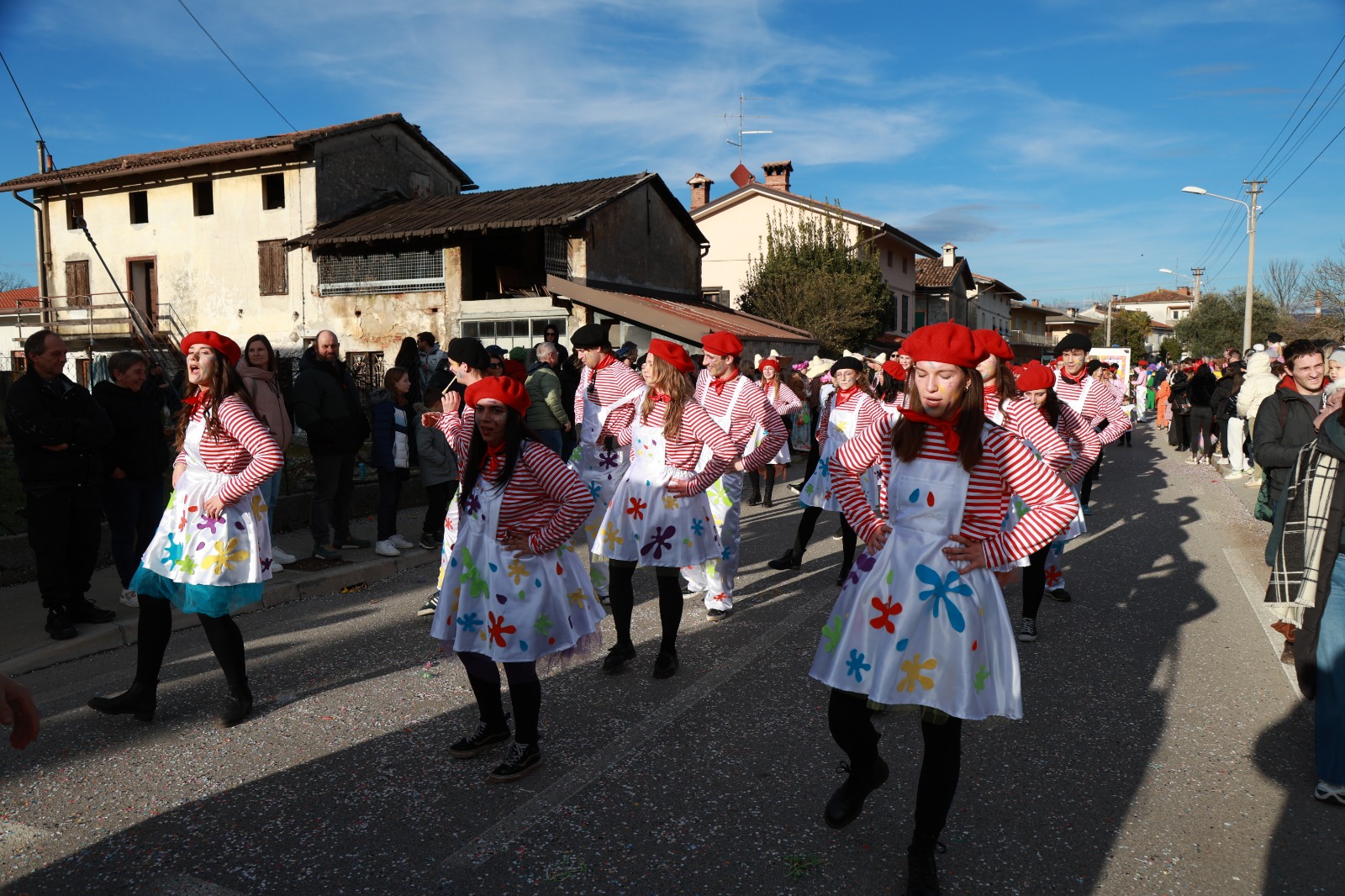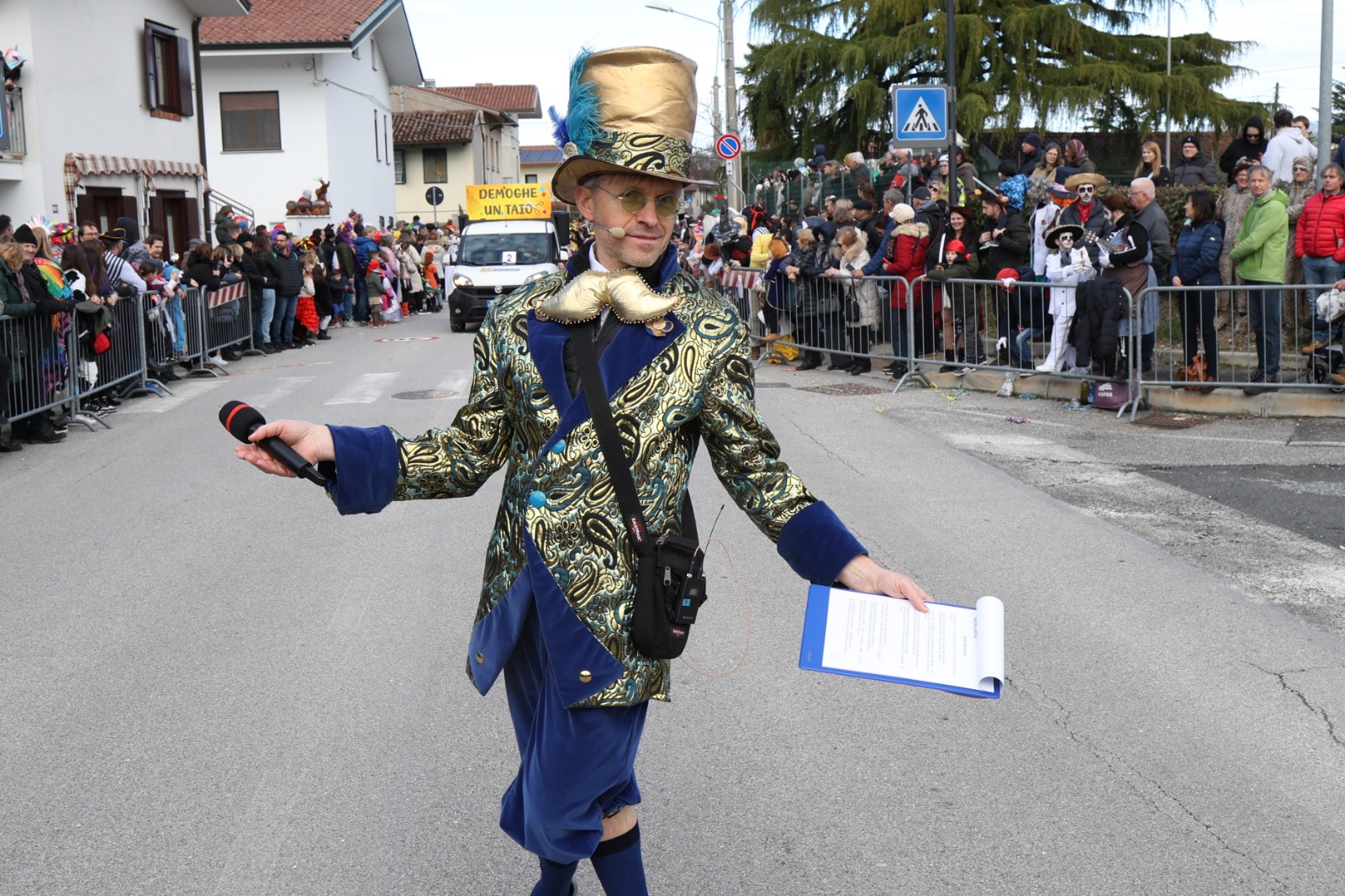 A rompere il ghiaccio è stato il gruppo Ferlugi con “Fantasmi col sorriso”, un tributo ai protagonisti della comicità internazionale. Tra cappelli a cilindro, bombette e baffi iconici hanno preso forma personaggi come Stanlio e Ollio, Bud Spencer, Charlie Chaplin, Don Camillo e Peppone, capaci ancora oggi di coinvolgere pubblici di ogni età. La manualità artigianale è stata al centro anche della proposta dei “Mati pel Carneval” di Monfalcone con “Demoghe un taio”. «Siamo la fantasia della sartoria», ha spiegato Renzo Carone, raccontando come puntaspilli, bottoni, manichini e metri da sarto diventino strumenti scenici per portare in strada l’arte del taglio e cucito.