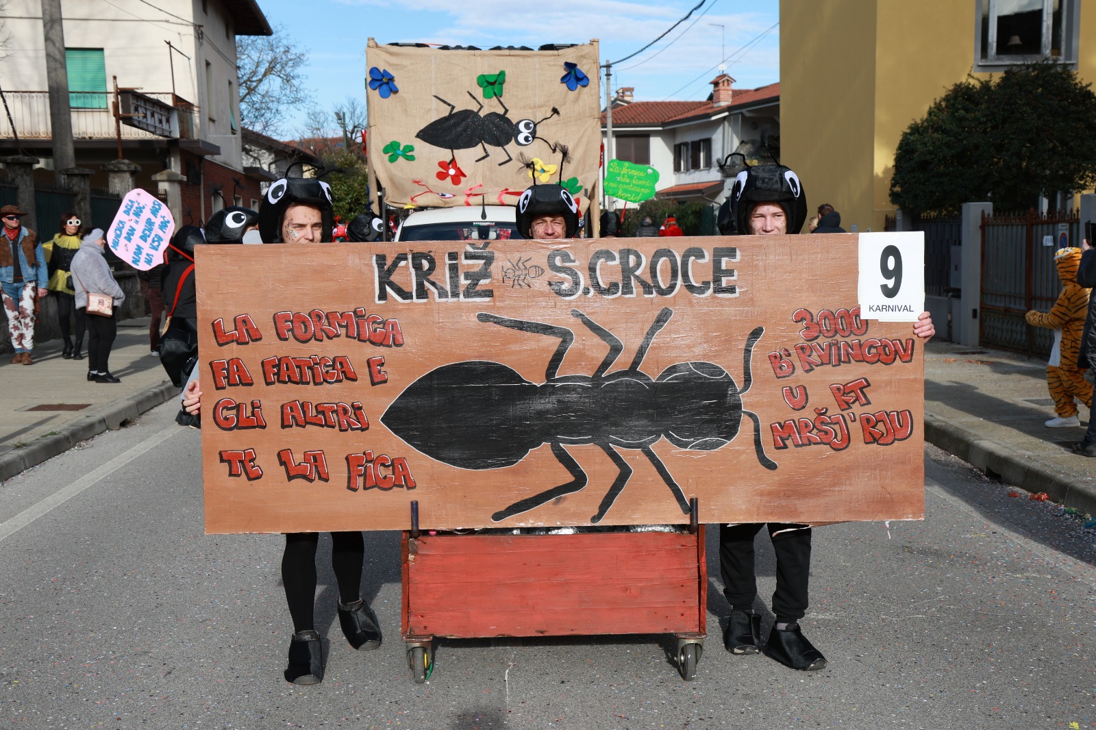 A conquistare il primo premio tra i carri è stato proprio “Carso 3000 – bestie futuristiche” di Doberdò del Lago. Al secondo posto si è classificato “Ma ’sto ponte?” di Prepotto, mentre il terzo premio è andato a “Alle Olimpiadi ci pensa Frozen” del gruppo Medeazza–San Giovanni di Duino, chiaro richiamo all’appuntamento di Milano-Cortina. Tra i gruppi mascherati ha prevalso “3000 formiche in marcia” di Santa Croce, seguito da “Accendi l’anima non solo la lampadina” di Prosecco Contovello.