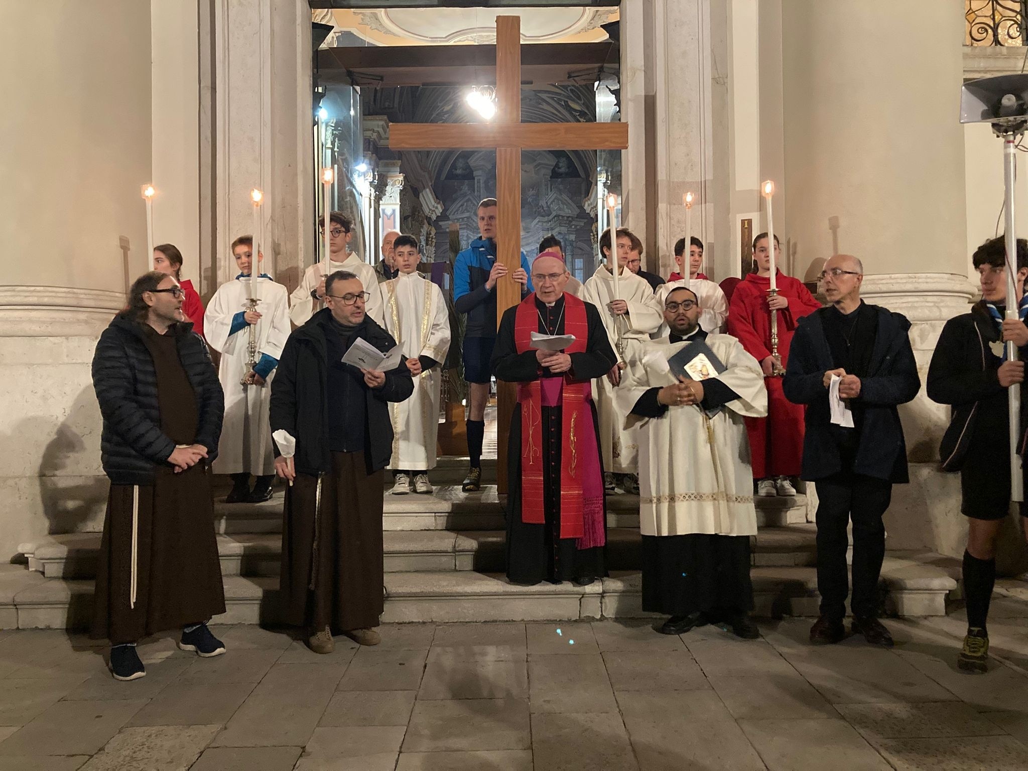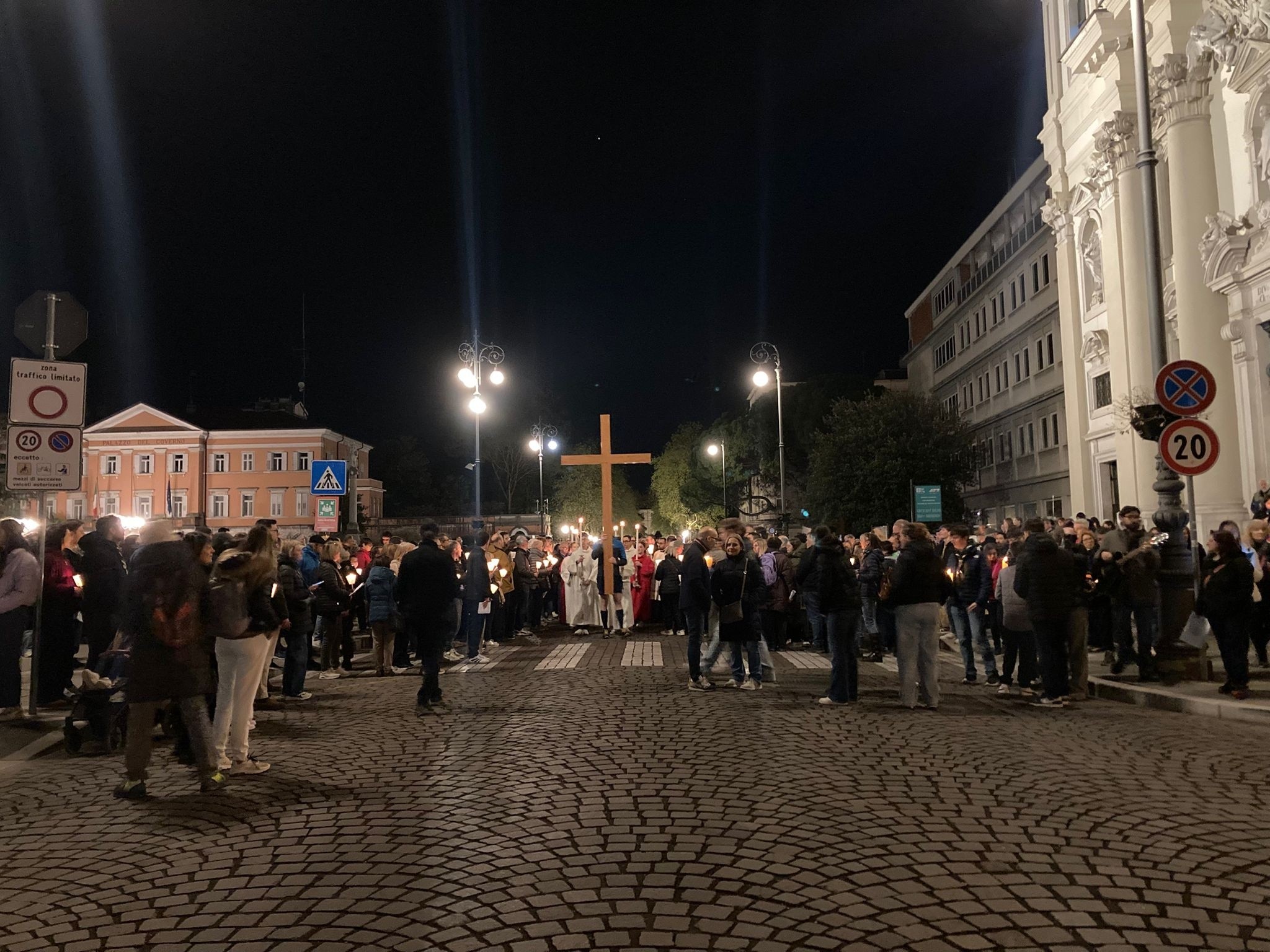 Molto partecipata e sentita, nella serata di ieri, venerdì 3 aprile, la Via Crucis cittadina del Venerdì Santo della Chiesa di Gorizia. Un percorso condiviso e transfrontaliero che, partendo dalla chiesa di Sant’Ignazio in piazza Vittoria a Gorizia, passo dopo passo, stazione dopo stazione - soffermandosi su alcuni dei punti più significativi e spirituali del borgo storico - ha passato il “confine” raggiungendo il Santuario della Castagnevizza a Nova Gorica.