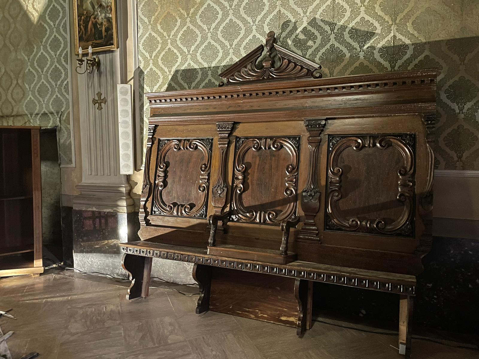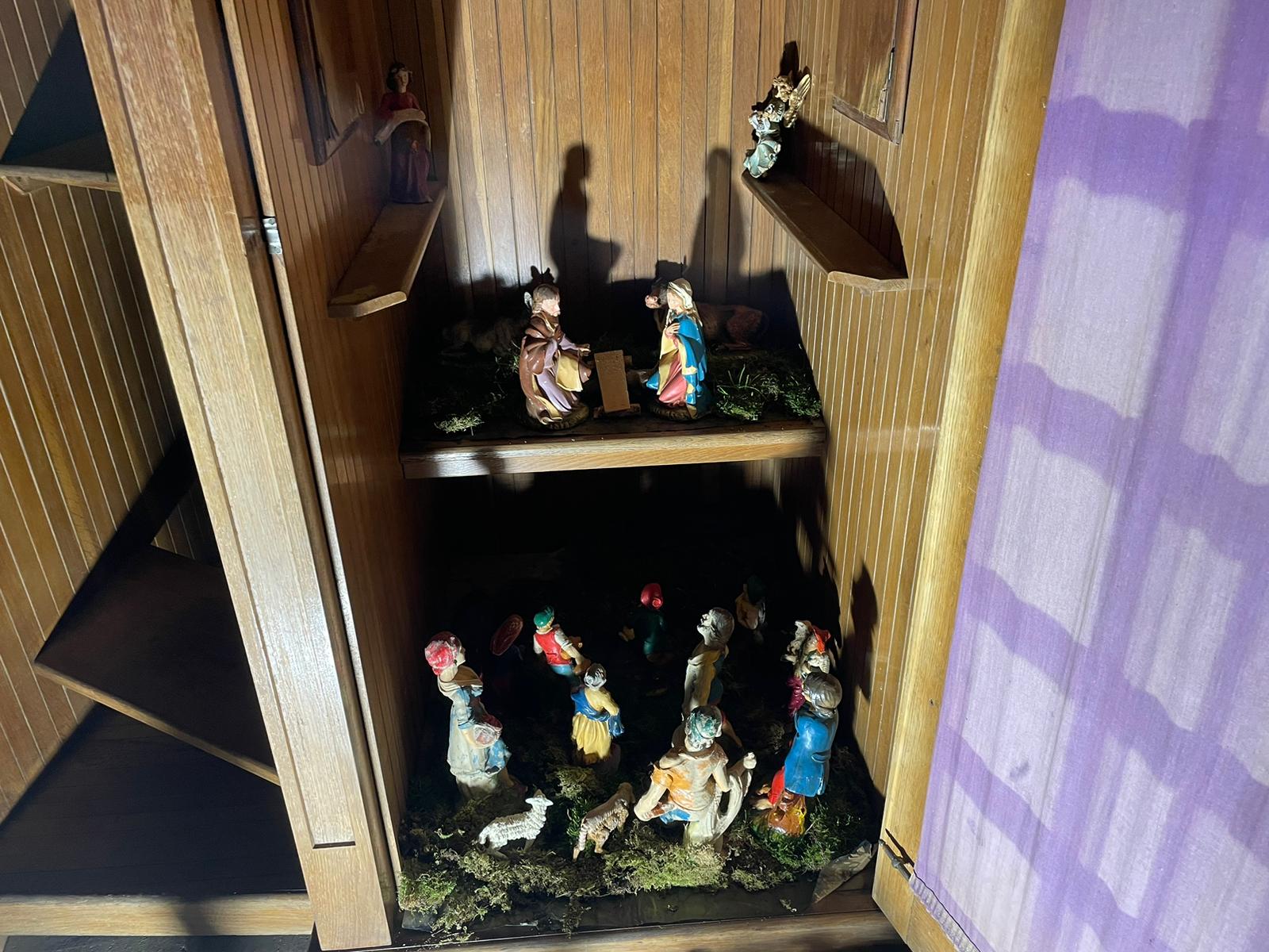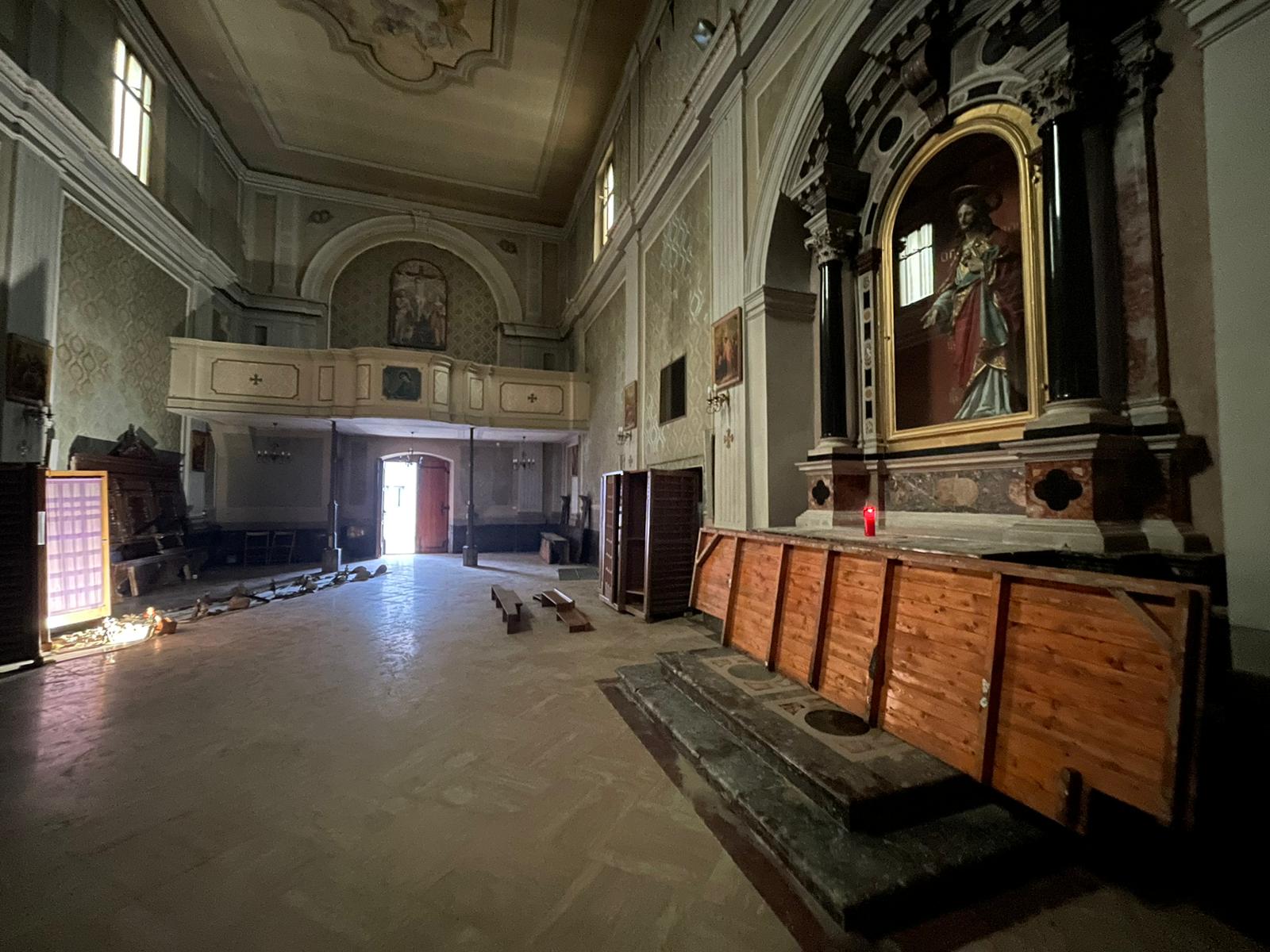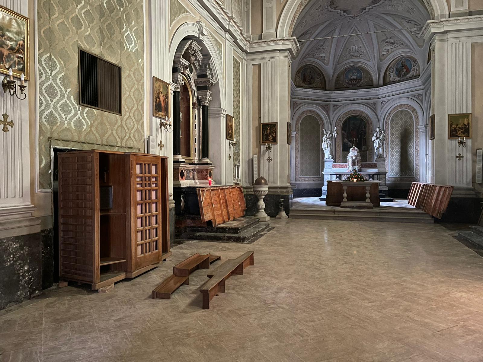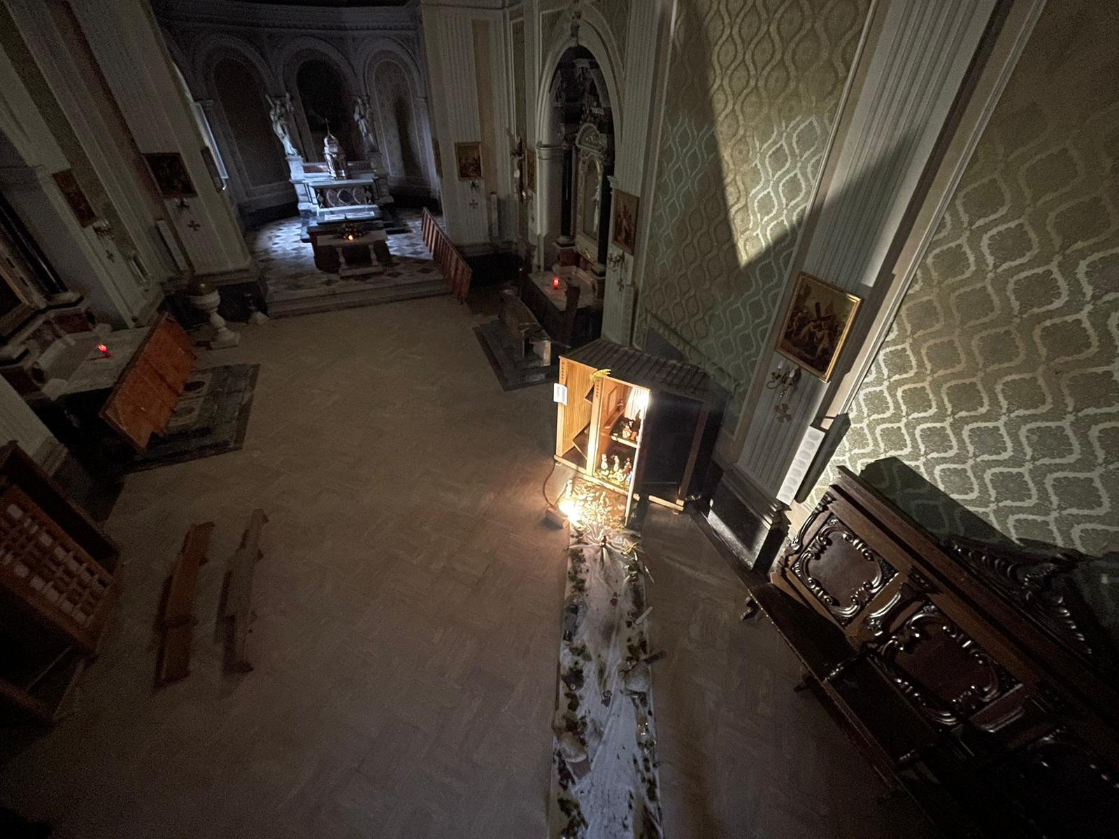 Un presepe, tornando alla realizzazione all’interno della chiesa parrocchiale, costruito all’interno di uno dei due confessionali, attualmente spostati rispetto alla loro collocazione originale per permettere alle murature di asciugarsi. Un percorso, segnato da pezzi di arredi liturgici distrutti dalla furia dell’acqua, conduce pastori e fedeli alla Sacra famiglia. Un'idea nata e realizzata dai giovani della locale Azione Cattolica Ragazzi con i propri animatori. All’interno della chiesa, svuotata dai banchi e dalle suppellettili, con gli altari senza tovaglie ma solamente tre lumini, gli stalli del coro sono rimossi dal proprio posto in presbiterio e posti ai lati, mentre la carta da parati è ormai lentamente in disfacimento.
