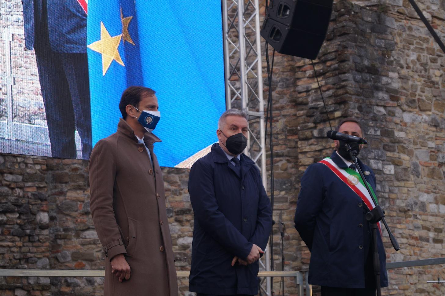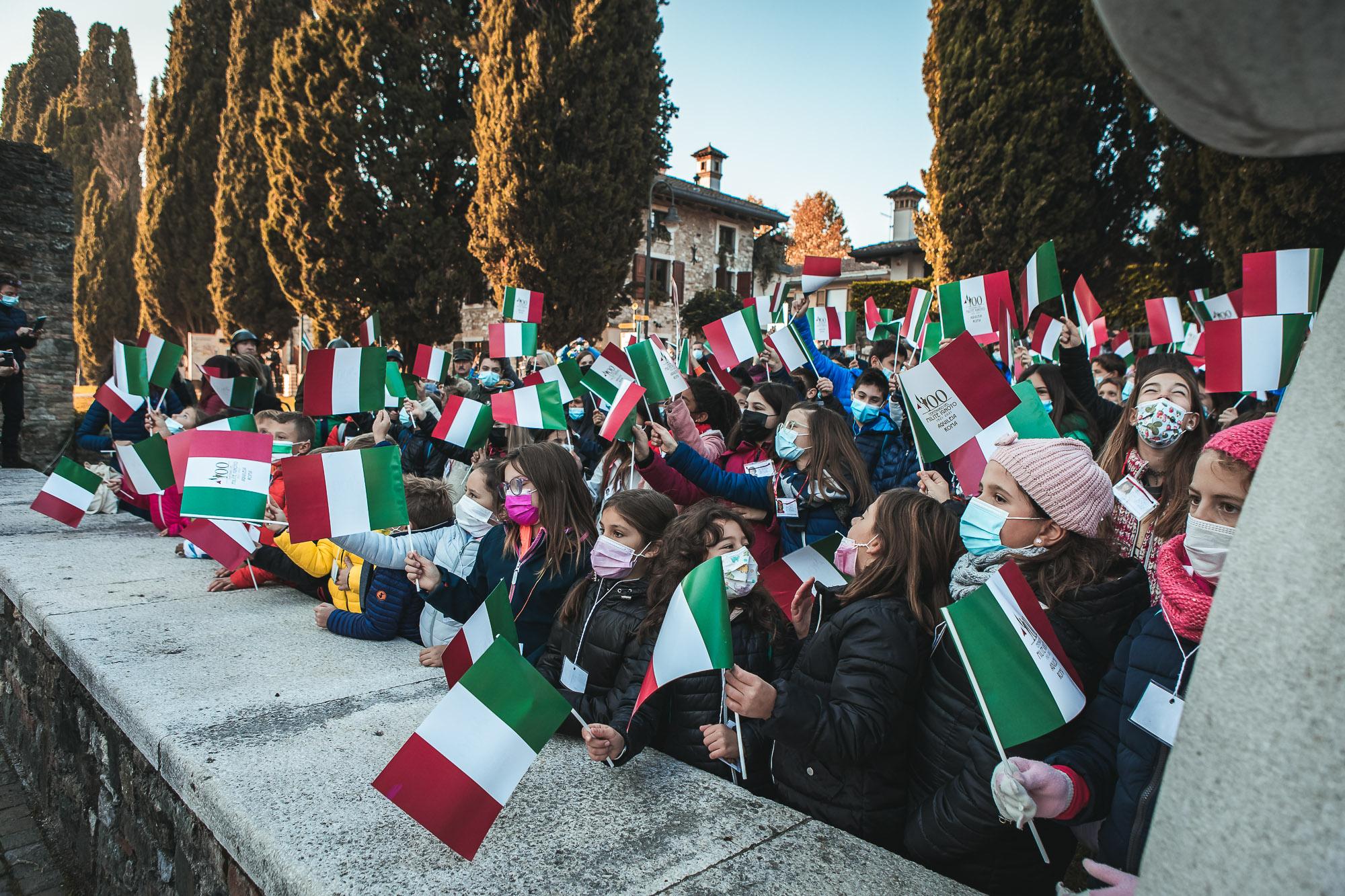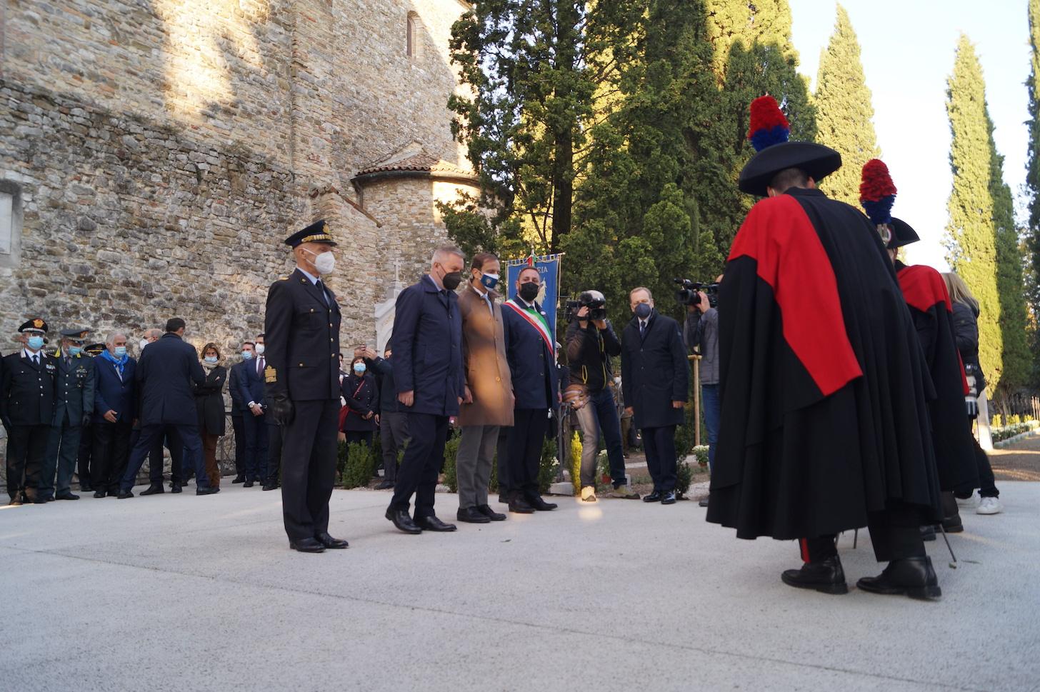 L’area, che accoglie le spoglie dei dieci militi senza nome rimasti in Friuli mentre l’ultimo è andato a Roma, vede anche la presenza della tomba di Maria Bergamas. Fu proprio lei, madre rimasta senza il figlio morto al fronte, a scegliere la salma destinata all’Altare della patria. Nell’area densa di significato storico, il ministro della difesa, Lorenzo Guerini, ha ricordato il ruolo svolto da tutti quei giovani soldati mandati a morire a Nordest, unendo poi l’Italia intera attorno al convoglio del Milite. Nel frattempo, il cielo è stato solcato dalle acrobazie delle Frecce tricolori.