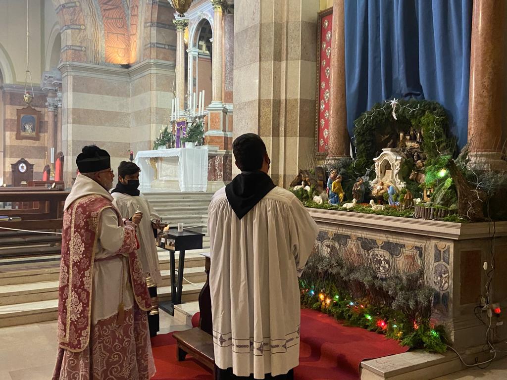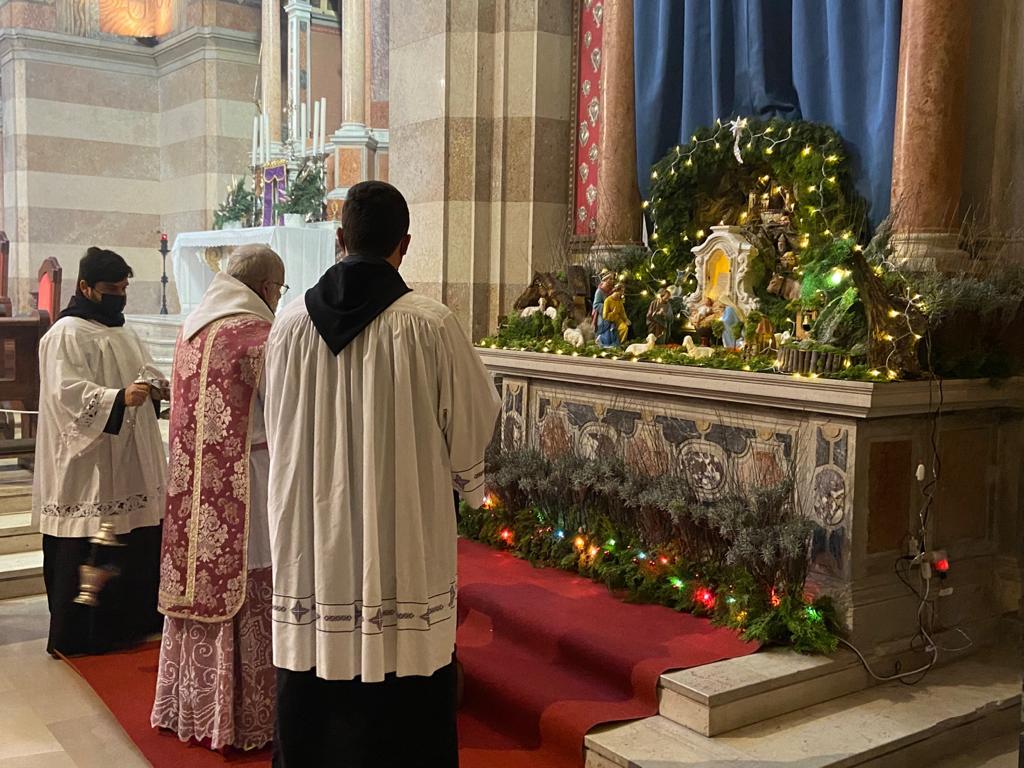Benedetto e inaugurato al santuario mariano di Barbana il presepe. Ideato a realizzato da dom Giovanni Paolo, con la supervisione del monaco sacrista dom Giacomo Bertuzzi e il priore dom Benedetto Albertin, è ospitato sull’altare laterale dedicato a Sant’Antonio. Un’idea, quella della rappresentazione della Sacra Famiglia, che in così grandi dimensioni mancava da qualche anno nel santuario mariano. La benedizione, impartita proprio dal padre priore, è avvenuta in quella che liturgicamente è definita la Dominica Gaudete, ovvero la terza domenica di Avvento, riconoscibile dai paramenti sacri di color rosa, che prende il nome dall’introito “Gaudete in Domino Semper”, ovvero “Gioite sempre nel Signore”. Un invito ripreso in questi giorni anche dalla pagina Facebook del Santuario, impegnata in collaborazione con la parrocchia di Grado nella divulgazione dei messaggi quotidiani per l’Avvento curati dall’arciprete monsignor Michele Centomo.