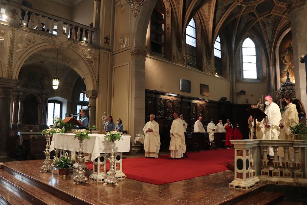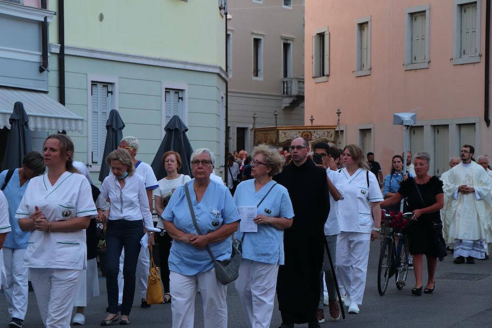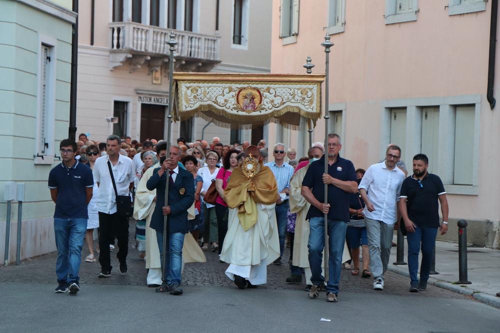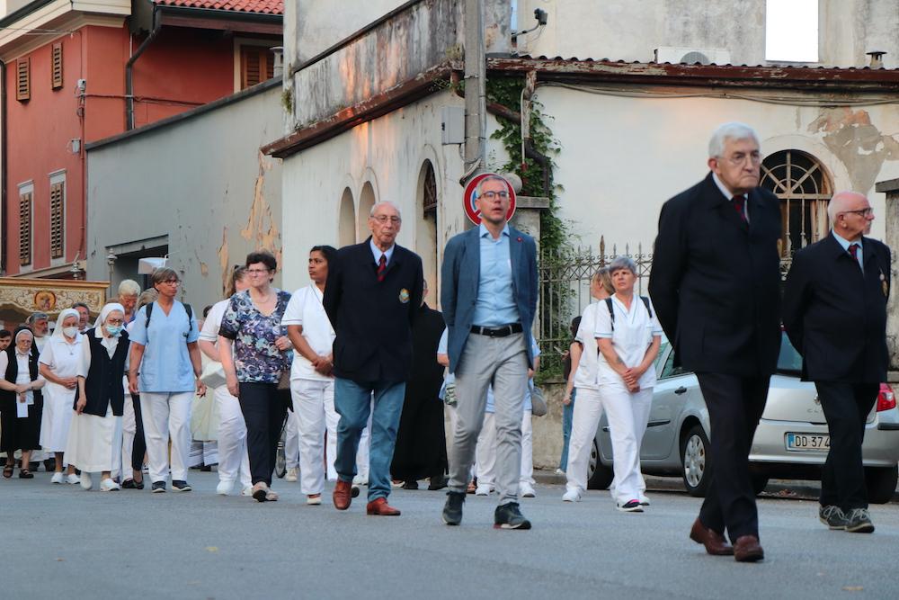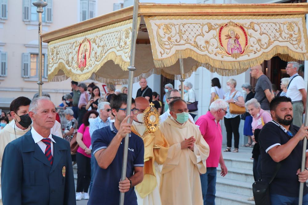 Il significato della festa si riassume già nel nome, Corpus domini. La celebrazione cristiana che cade a 60 giorni dopo la Pasqua ha portato oltre un centinaio di fedeli in Cattedrale a Gorizia, per la santa messa di ieri sera che si è conclusa con la processione fino alla chiesa di San Francesco. Un cammino che ha toccato alcuni punti simbolo della comunità religiosa in città, a partire dal centro parrocchiale del Pastor angelicus, ma anche le istituzioni cittadine e sociali quali il municipio e il carcere.