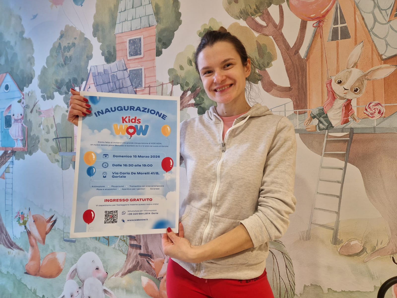 Il trampolino con l’area di arrampicata, un playground con palline colorate e giochi interattivi con il proiettore. Oltre le porte scorrevoli di via Morelli 41/B ecco aprirsi un mondo incantato popolato da coniglietti e volpi gentili, uno spazio pronto a catapultare bambini da zero a dodici anni nell’universo del divertimento in sicurezza. È il neonato Kids WOW che verrà inaugurato domenica 15 marzo dalle 16.30 alle 19 con ingresso gratuito. Un pomeriggio speciale dove ad attendere i più piccoli ci saranno anche stuzzichini, pizza e deliziose sorprese, oltre che un aperitivo per i genitori. «Sono ucraina – racconta la titolare Daria Pavlishynets - quando il nostro Paese venne invaso mi trovavo là ed ero anche incinta. Penso che nessuno possa davvero comprendere cosa significhi la guerra finché non la vede con i propri occhi». Dall’alba di quel 24 febbraio del 2022 passarono quasi sei mesi, prima che Daria decidesse di abbandonare Chmel’nyc’kyj per dare alla luce la piccola Emilia in un Paese in pace. «All’inizio io e il mio compagno restammo lì – racconta - nella speranza che tutto finisse. Finché prendemmo la decisione di far nascere nostra figlia in un posto sicuro, e così venni in Italia, dove vive e lavora mia mamma». Impiegata nel settore dell’Information Technology e marketing online, oltre che nella creazione di siti web, Daria fu costretta a rassegnare le dimissioni e fuggire dai bombardamenti per rifugiarsi a Gorizia.