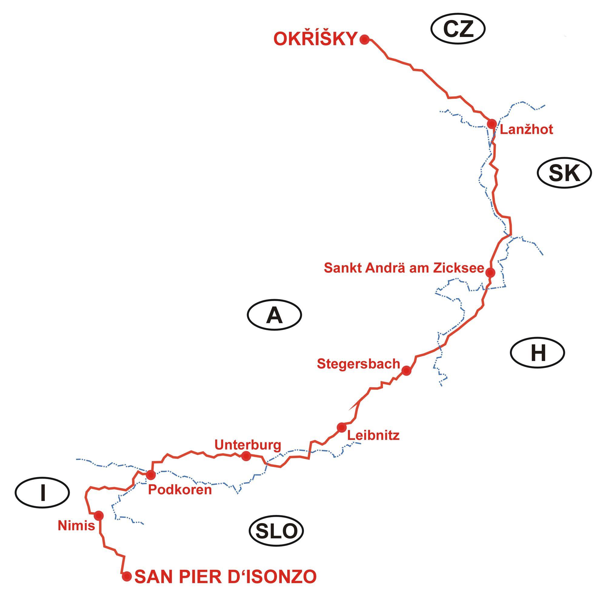 Il percorso, nello specifico, ha visto otto tappe. Dopo Okříšky il gruppo ha proseguito verso Landžhot in Slovacchia, quindi Santkt Andrä am Zickersee in Austria e, dopo un breve tragitto in Ungheria, la sosta a Stegersbach. Altra tappa Leibnitz, quindi Unterburg, entrambe in Austria, Podkoren in Slovenia, la nostrana Nimis e, infine, San Pier d’Isonzo. Non sono mancati, durante le varie soste, momenti per poter anche degustare, dopo la fatica, meritati piatti tipici locali.