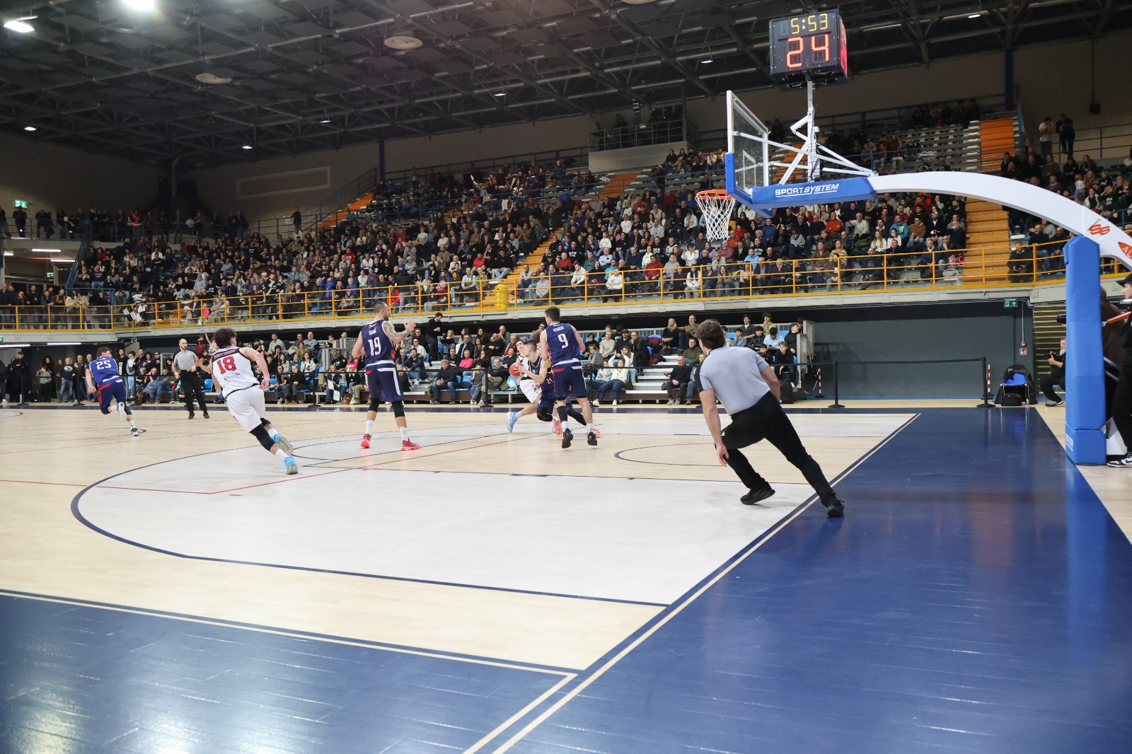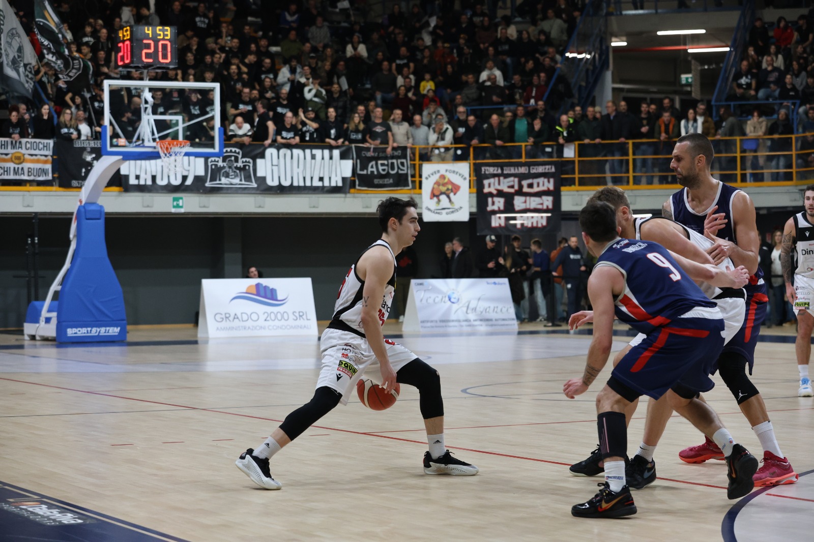 Coach Tomasi parte con Giacchè, Micalich, Perin, Ius e Fall, coach Jogan risponde con Batich, Demarchi, Gobbato, Vecchiet e Diminic. Tocca al centro croato, ex di turno, l’onore di segnare da sotto il primo canestro della gara con Perin e Fall (da tre) a rispondere per una prima frazione subito scoppiettante. Ius (il più ispirato tra i padroni di casa), Fall, Micalich e Giacchè al 6' firmano il vantaggio goriziano in doppia cifra sul +11 (22-11). Lo Jadran per rientrare si affida in particolare a Demarchi e risponde a una Dinamo ispirata dal perimetro (8 triple di squadra nella prima frazione) e alla sirena del 10' il punteggio è molto alto (36-29). Dopo la mini-pausa lo Jadran aumenta la pressione difensiva, Diminic è più incisivo a costo e una tripla di Vecchiet pareggia l'incontro (42-42). La Dinamica rialza il ritmo, è precisa dalla lunetta e al tiro in transizione con Perin e Fall che con la quarta tripla personale manda le due squadre all'intervallo sul +10 Dinamo (59-49). Al rientro dagli spogliatoi Gobbato e Batich riportano sotto gli ospiti con il primo che segna addirittura il vantaggio Jadran (66-67). Giacchè risponde subito dalla lunga distanza per un derby avviato verso un equilibrio strutturato con Gorizia avanti 80-76 all’ultima pausa. Sara dall’arco firma il + 6 (85-79) che illude la Dinamica di tornare in possesso delle chiavi del match. Al 34' torna però a farsi vivo Demarchi che riporta lo Jadran in parità chiudendo un parziale di 6-0 e aprendo la strada alla sinfonia personale di Gobbato. Due triple consecutive del numero 25 e al 38' è +4 Jadran (94-90) per un mini-allungo decisivo vidimato anche da Vecchiet e Rolli che gela un ancora volta gremito PalaBigot.