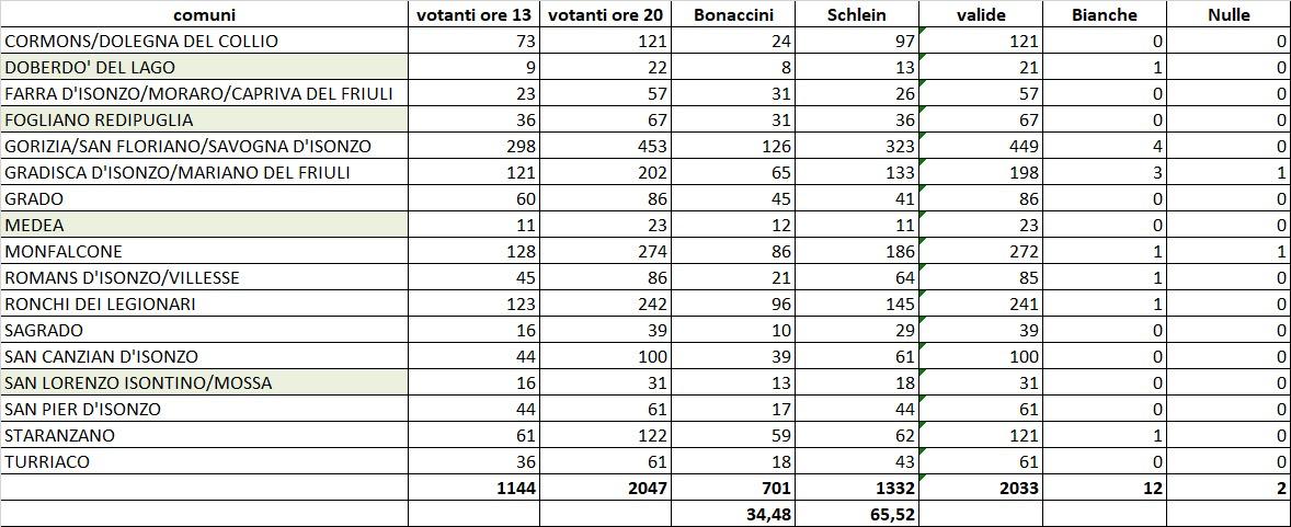 Il risultato più marcato è stato a Gorizia, dove al seggio allestito nella sala interna del Kulturni dom si sono recati tesserati e simpatizzanti cittadini, di Savogna d’Isonzo e San Floriano del Collio: 323 voti contro 126 per il presidente della Regione Emilia-Romagna. Quest’ultimo ha ottenuto la maggioranza solo a Medea, Farra e Grado, a Staranzano solo pochi punti di distacco. Confermato così il desiderio dei circoli goriziani, chiamati al voto due settimane fa.