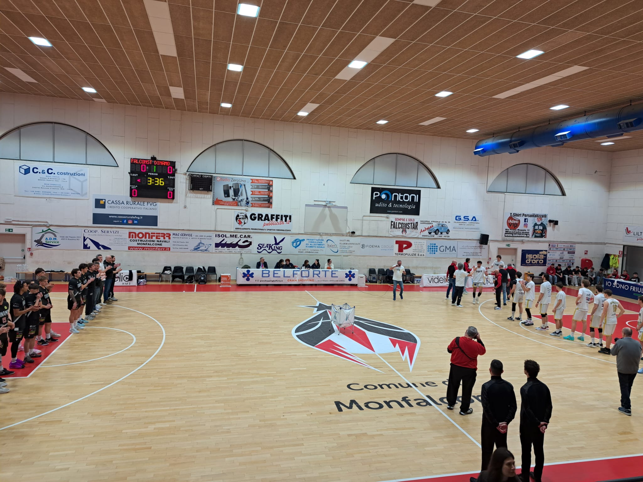 Più equilibrato l’avvio della seconda frazione di gioco, con biancorossi e bianconeri che in termini di parziale si sono mantenuti vicini, ma da parte degli ospiti non ci sono state scintille che hanno permesso di accorciare le distanze. I numerosi tifosi hanno visto giocare una Dinamo sottotono e un po’ nervosa, che ha dovuto scontare le assenze di Fall per infortunio e di Micalich per febbre; dall’altro lato, una Falconstar tonica che ha sfoggiato tutta la fisicità della propria difesa e la forza in attacco di Gallo nei 23 punti totali e nelle 7 su 8 triple da lui messe a segno in tutta la gara. Si è chiuso infatti con un divario ancor maggiore il secondo quarto: 47-25 per i monfalconesi.