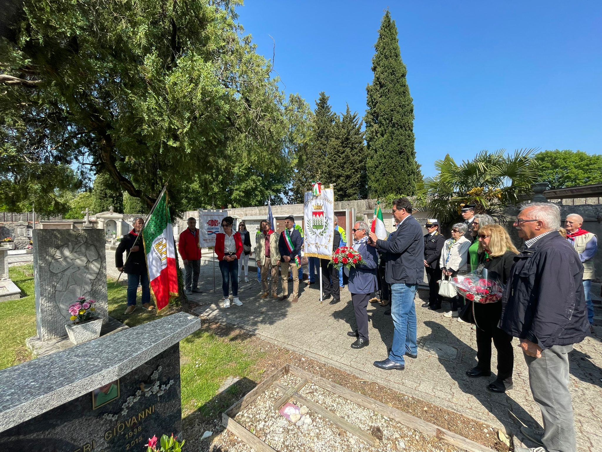 Al Cimitero Civile, Gastone Martinuzzi ha ricordato la storia dietro all’Ossario dei Caduti Partigiani, costruito anche con fondi privati per ricordare tutti i caduti ronchesi – di cui 24 riposano proprio lì – e le discussioni politiche che ne ritardarono l’inaugurazione. Poco lontano, sempre nel cimitero civile, riposa anche Vjekoslav Andrijic, partigiano dalmata ucciso in un’imboscata a seguito di una soffiata a Soleschiano. «Come dalmata ha sofferto molto come suoi conterranei la violenza fascista», ha ricordato Libero Tardivo, presidente della locale sezione dell’Anpi. «Qui a Ronchi aveva trovato una differenza tra fascisti e italiani. La nostra è una terra di frontiera, di culture e tradizioni e usi che si compenetrano. Il suo sangue assieme a quello dei nostri nonni ha nutrito questa terra della quale noi siamo figli. Dobbiamo valorizzare le memorie che ci hanno dato ricordando da dove veniamo per continuare nel loro messaggio di libertà, democrazia e partecipazione».