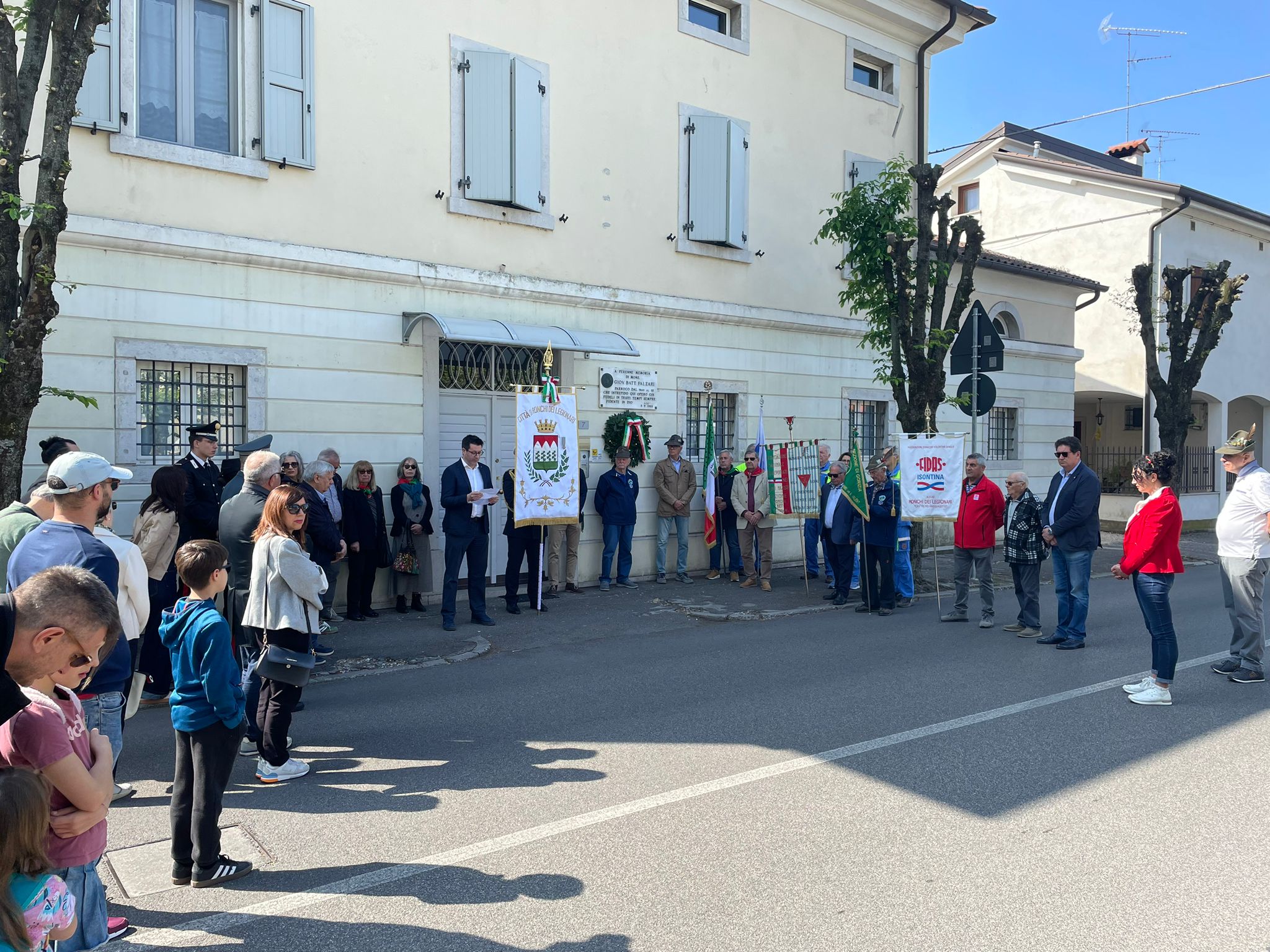 Una mattinata che, come da tradizione per il comune bisiaco, è iniziata alle 9.30 con la Santa Messa celebrata nella chiesa parrocchiale di San Lorenzo martire dal vicario parrocchiale, don Gigi Fontanot, ed è proseguita con il consueto omaggio alle varie lapidi e monumenti. Il primo, di fronte la casa canonica in via San Lorenzo, e dedicato a don Giovanni Battista Falzari, parroco di Ronchi negli anni della Seconda Guerra mondiale che accolse i soldai sbandati che giungevano dai Balcani e coloro che uscivano dai campi di concentramento per le popolazioni slave nella Bassa Friulana, ha visto il discorso del presidente dell’Azione Cattolica di Ronchi dei Legionari, Massimiliano Natali.