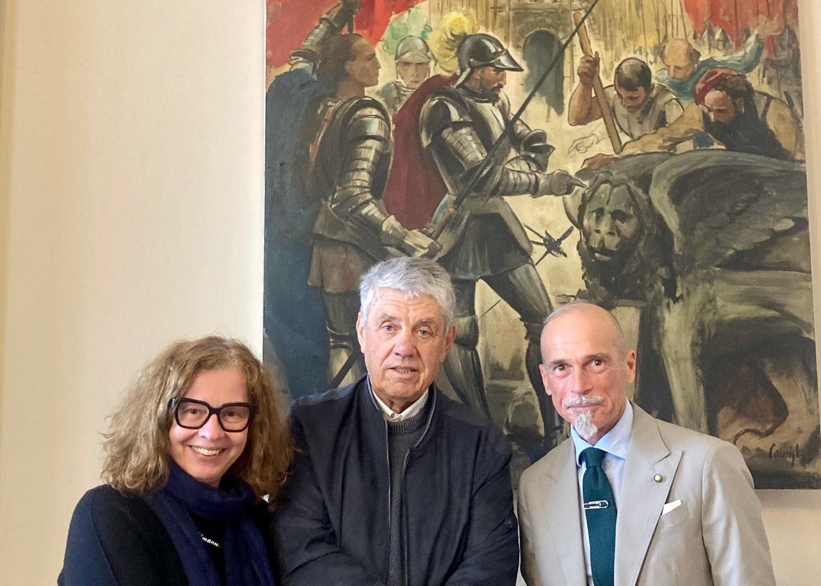 «È un grande onore per me che due opere realizzate da mio padre siano ospitate in questo palazzo così ricco di arte e storia. Ritengo che Gorizia sia il luogo naturale della loro sede» queste le parole con cui Francesco Caucigh ha commentato il posizionamento sulle pareti della Sala Giunta del Municipio di due tele firmate dal padre Emilio, pittore, insegnante di tecniche artistiche e storia dell’arte, disegnatore, decoratore, grafico e illustratore. Una donazione che rappresenta un ulteriore prestigioso arricchimento artistico per Palazzo Attems Santa Croce, come ha rimarcato l’assessore comunale alla Cultura, Fabrizio Oreti, dopo aver ringraziato di cuore per la generosità e il gesto encomiabile. Francesco Caucigh è stato oggi, 10 aprile, in municipio e ha avuto l’occasione di vedere di persona la collocazione dei quadri. Oltre all’assessore Oreti, lo ha accolto Emanuela Uccello, funzionario d’area culturale ed esperta di storia dell’arte. Le due opere appartengono a una serie di 15 episodi, composta da Caucigh (Udine 1905-1972) in occasione della Mostra regionale del 1948, volta a raccontare la storia del Friuli. La prima, “Capitolazione del Castello di Gorizia 22 aprile 1508”, rappresenta Bartolomeo d’Aviano, capitano veneto, che fa cadere il maniero difeso dagli austriaci e innalza il simbolo del leone sulla porta principale. La seconda è “Ingresso delle truppe italiane nella città di Gorizia il 6 novembre 1918”, ambientata in piazza Vittoria piena di folla e con Sant’Ignazio sullo sfondo.