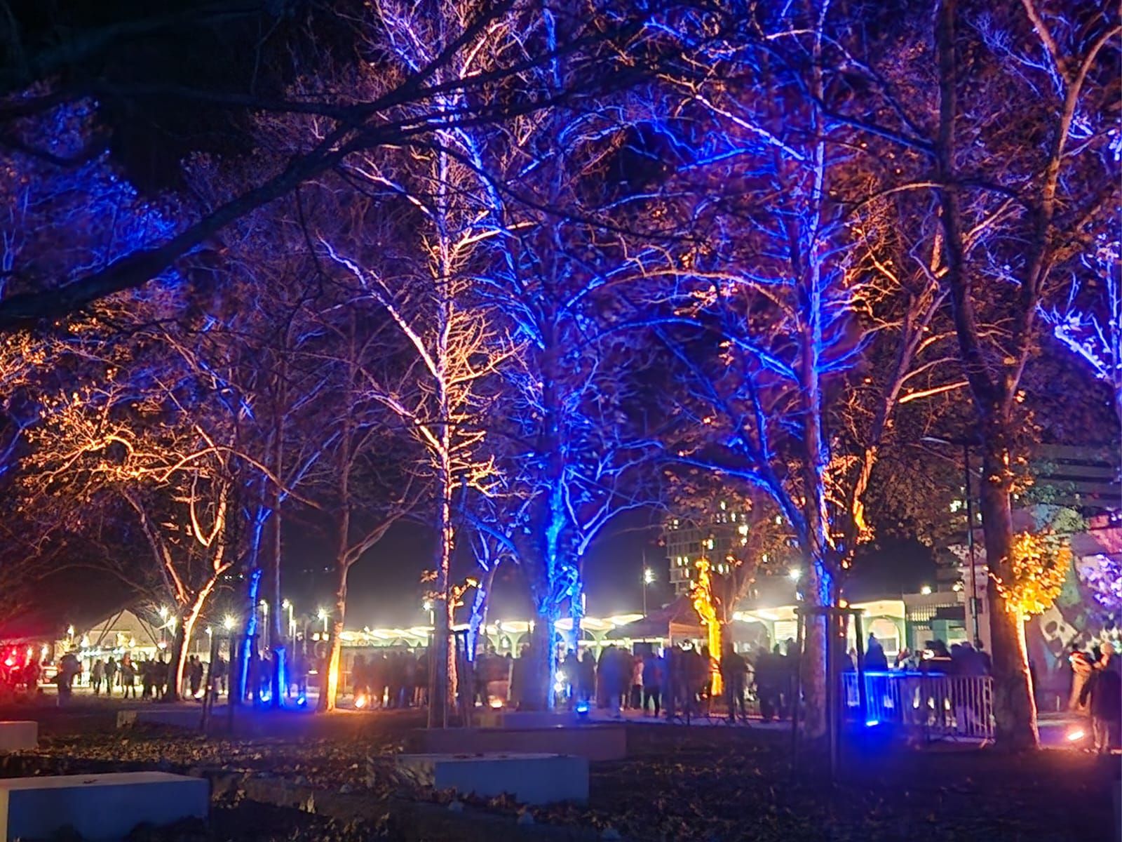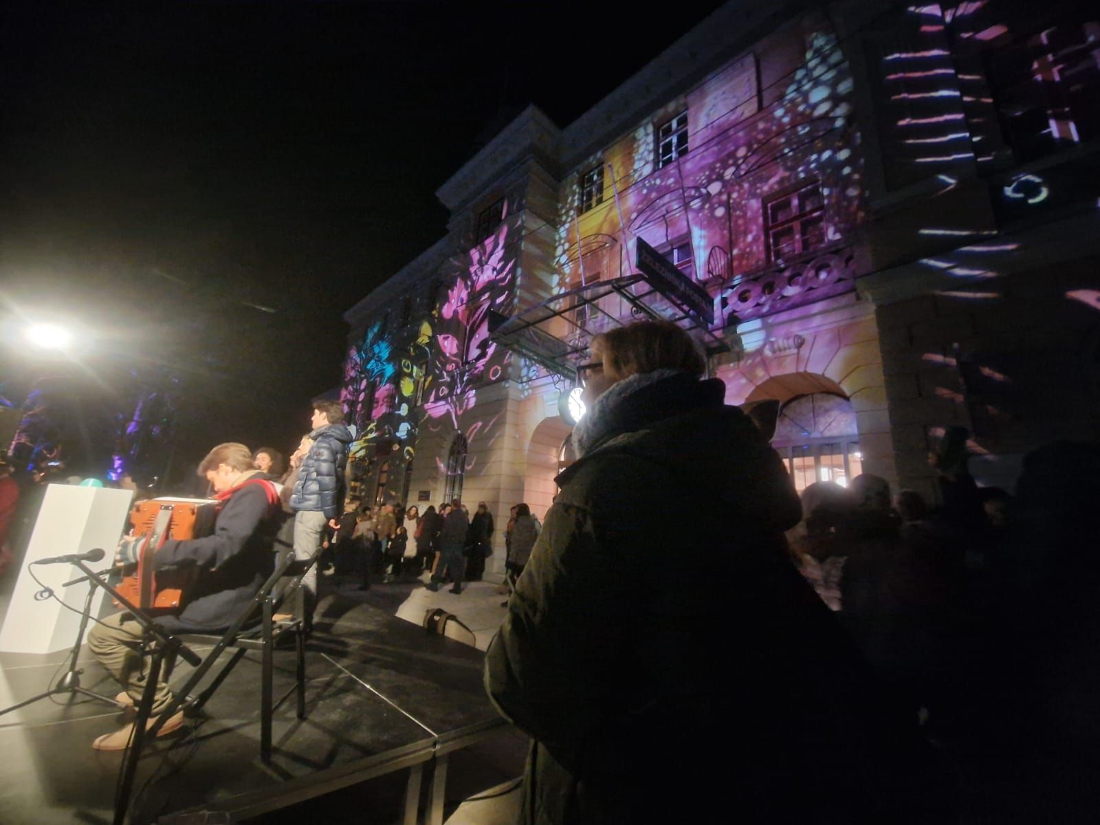 Il viale alberato della Kolodvorska Pot prende a illuminarsi d'oro e celeste. La decorazione musiva ideata dall'artista Franco Vecchiet - cuore di piazza Transalpina - s'accende per unire due popoli in un arcobaleno che travalica ogni confine, mentre sulla facciata della stazione di Nova Gorica sbocciano motivi floreali di un bosco nato per incanto. Si è svolta nella serata di oggi – 29 novembre – la cerimonia di accensione delle luci natalizie dello spettacolo “Luci senza confini” che ha visto per la prima volta battere due cuori all'unisono: quelle di due città gemelle, che stanno per avviarsi alla conclusione dell'anno della Capitale Europea della Cultura insieme a Chemnitz. «Ci ritroviamo qui in un momento atteso da tanto – interviene la direttrice di Go! 2025 Mija Lorbek – perché si tratterà di una conclusione che prevede un'intera settimana di festeggiamenti».