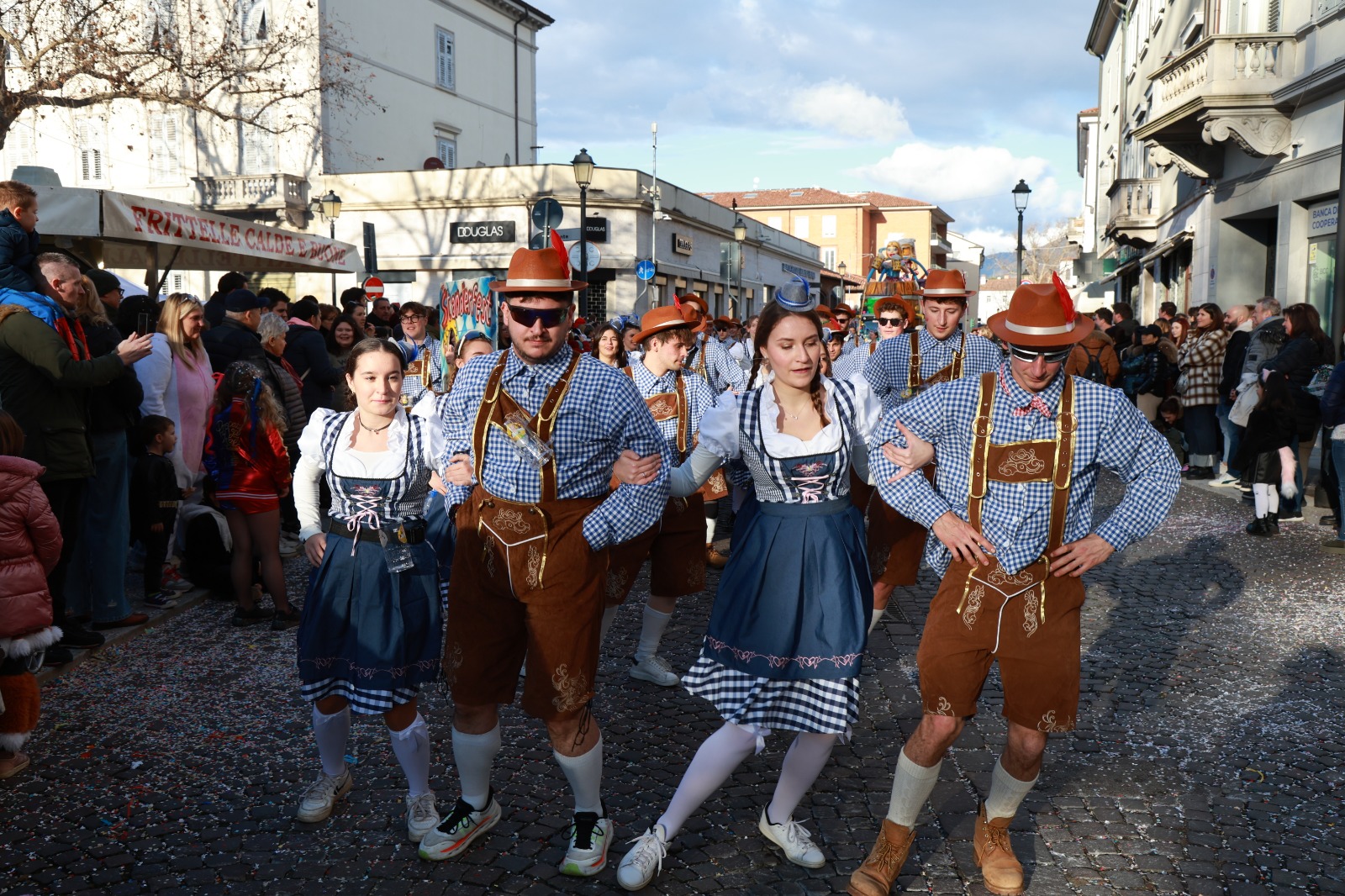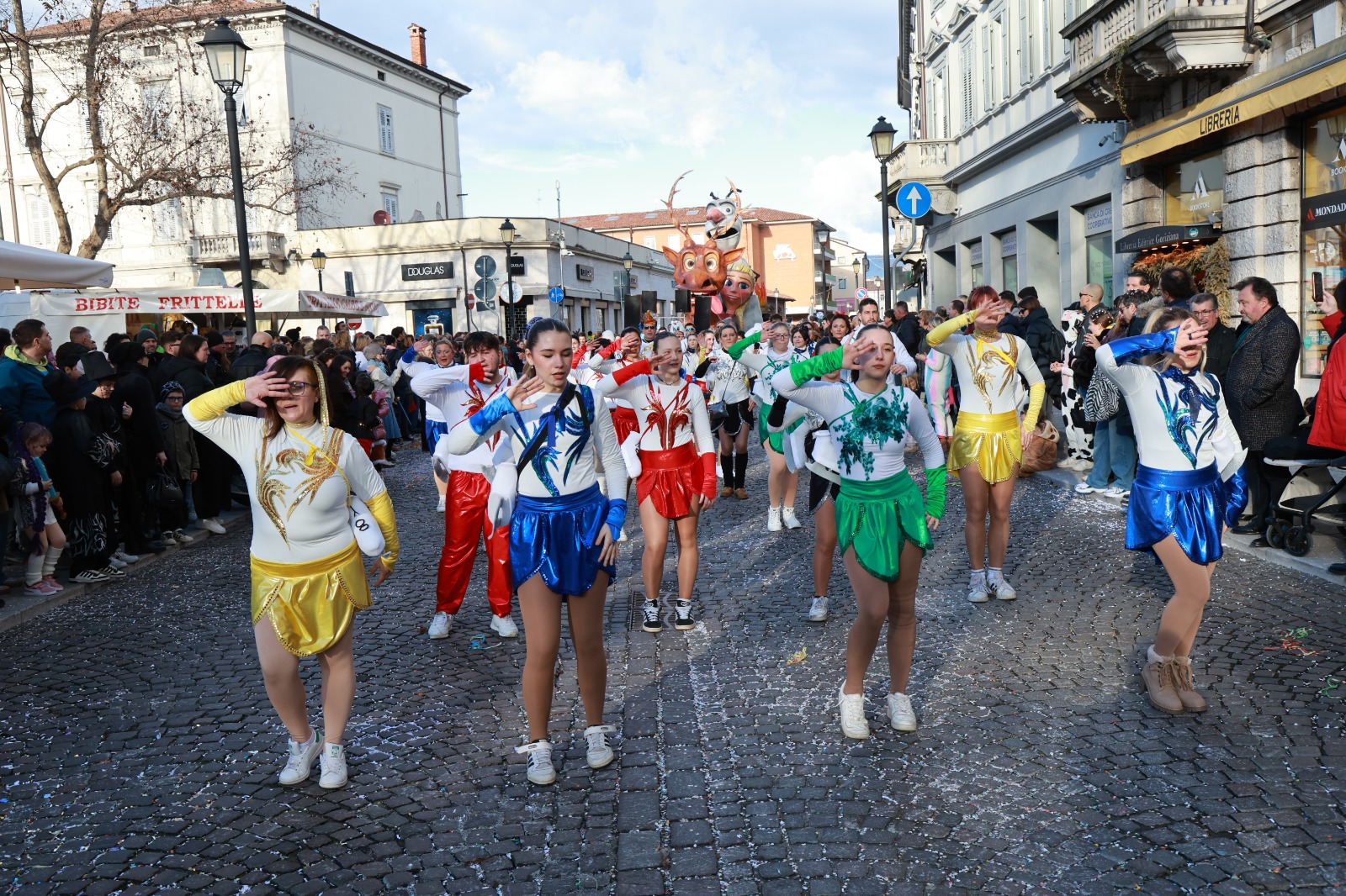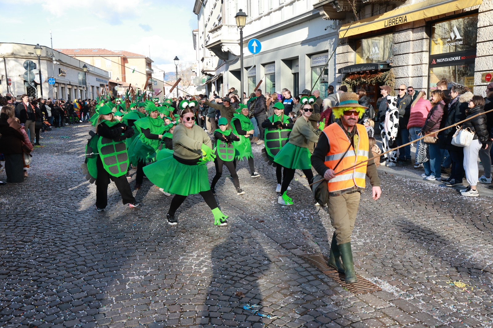 È stata un’autentica pioggia di gioia e coriandoli baciata dal sole, quella che si è riversata in città per la 36esima edizione del Carnevale Goriziano. Una sfilata iniziata alle 14 di oggi – 8 febbraio – e confluita infine all’ex mercato, nella cui rinnovata veste sono stati realizzati di recente i bagni pubblici. Quasi duemila i figuranti impegnati nei balli o a manovrare le opere di cartapesta, che fra girotondi e lanci di caramelle hanno portato un corale messaggio di pace e riconciliazione per dire “no” a tutte le guerre. Il caleidoscopio di allegria si è arricchito con gruppi provenienti dal vicino Friuli, ma in primis dalla comunità slovena confinante e dal Carso: «Come di consueto, anche quest’anno abbiamo registrato un record di presenze, con diciotto gruppi e dodici carri anche provenienti dalla Slovenia – conferma l’assessore alle Attività produttive Luca Cagliari – ripetendo l’esperienza del carnevale transfrontaliero dello scorso anno. Un grande successo ottenuto anche grazie all’organizzazione con la Pro Loco Gorizia, che dedica tanta attenzione a famiglie e bambini». Il giro è partito da via Boccaccio – dove i carri si sono sistemati già in mattinata – per poi proseguire su corso Verdi, sfilando innanzi alla giuria collocata ai Giardini Pubblici.