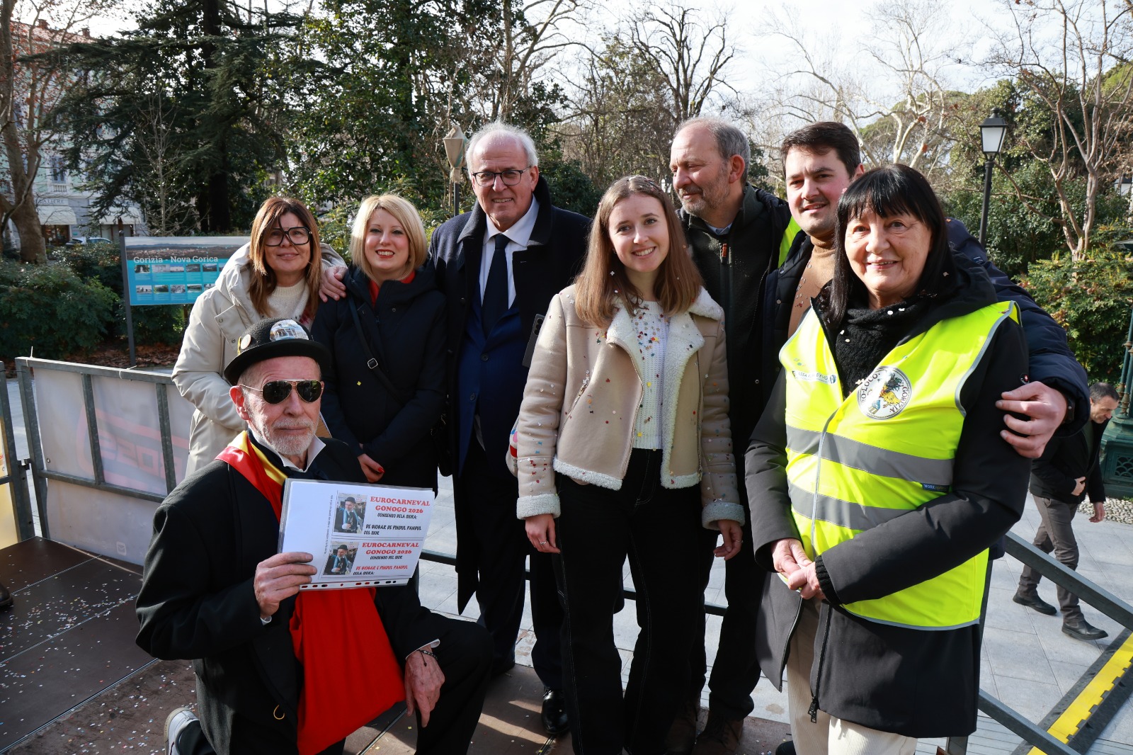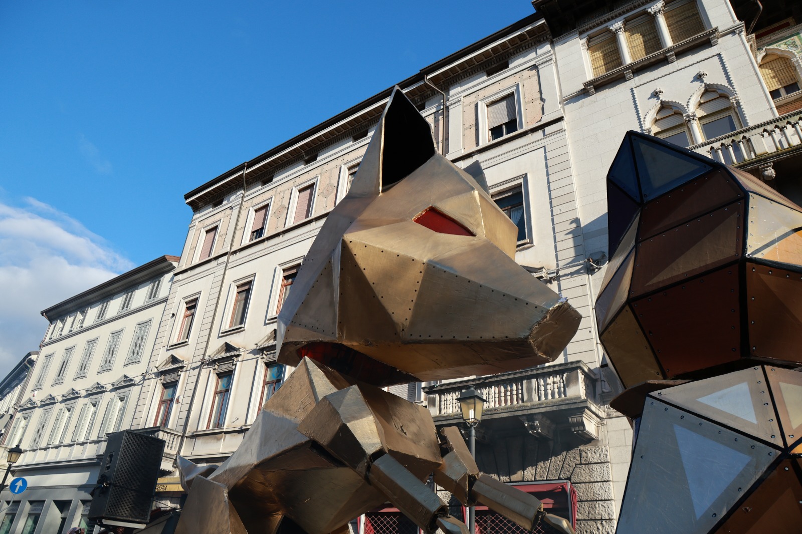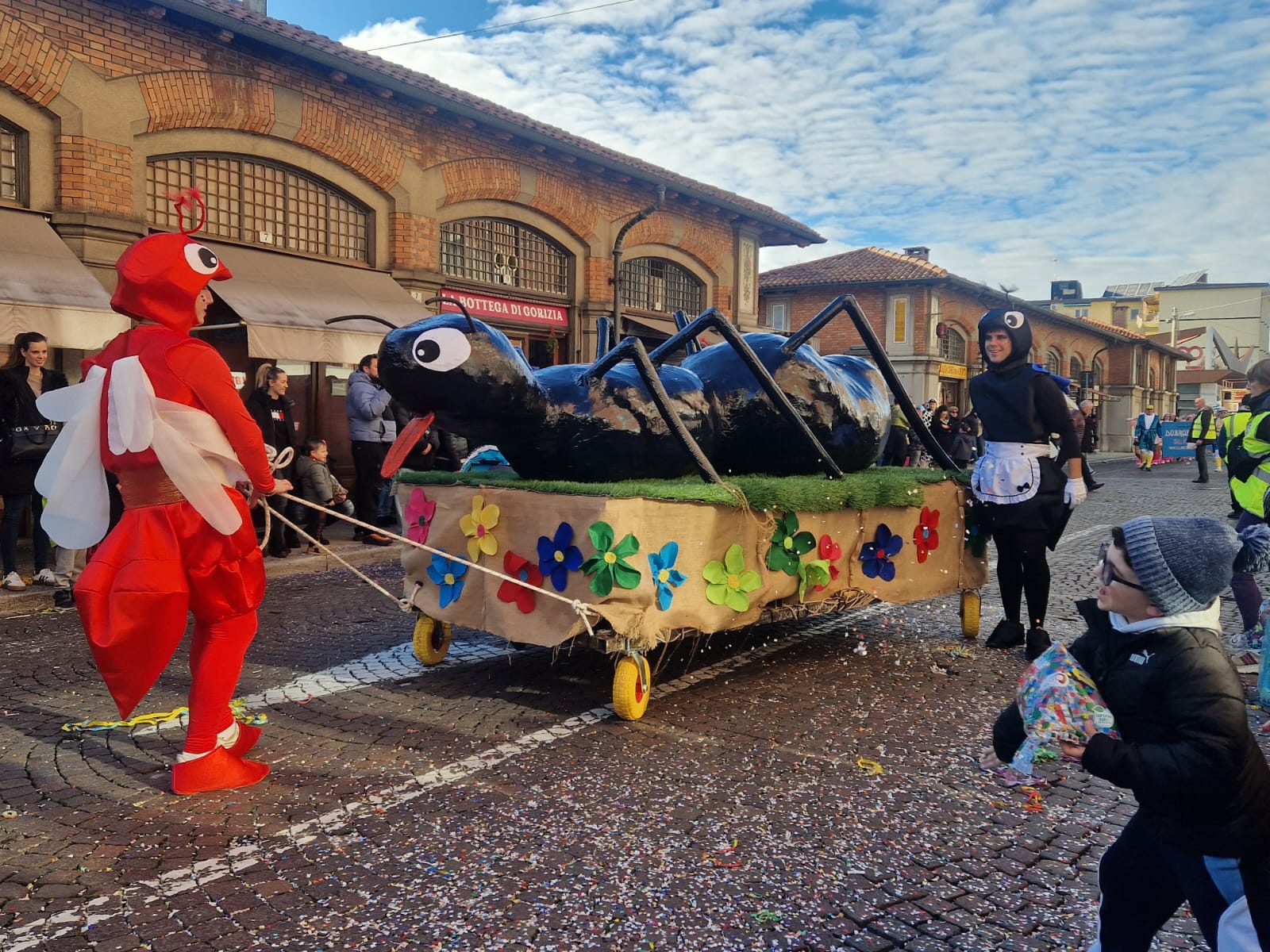 È stata un’autentica pioggia di gioia e coriandoli baciata dal sole, quella che si è riversata in città per la 36esima edizione del Carnevale Goriziano. Una sfilata iniziata alle 14 di oggi – 8 febbraio – e confluita infine all’ex mercato, nella cui rinnovata veste sono stati realizzati di recente i bagni pubblici. Quasi duemila i figuranti impegnati nei balli o a manovrare le opere di cartapesta, che fra girotondi e lanci di caramelle hanno portato un corale messaggio di pace e riconciliazione per dire “no” a tutte le guerre. Il caleidoscopio di allegria si è arricchito con gruppi provenienti dal vicino Friuli, ma in primis dalla comunità slovena confinante e dal Carso: «Come di consueto, anche quest’anno abbiamo registrato un record di presenze, con diciotto gruppi e dodici carri anche provenienti dalla Slovenia – conferma l’assessore alle Attività produttive Luca Cagliari – ripetendo l’esperienza del carnevale transfrontaliero dello scorso anno. Un grande successo ottenuto anche grazie all’organizzazione con la Pro Loco Gorizia, che dedica tanta attenzione a famiglie e bambini». Il giro è partito da via Boccaccio – dove i carri si sono sistemati già in mattinata – per poi proseguire su corso Verdi, sfilando innanzi alla giuria collocata ai Giardini Pubblici.
