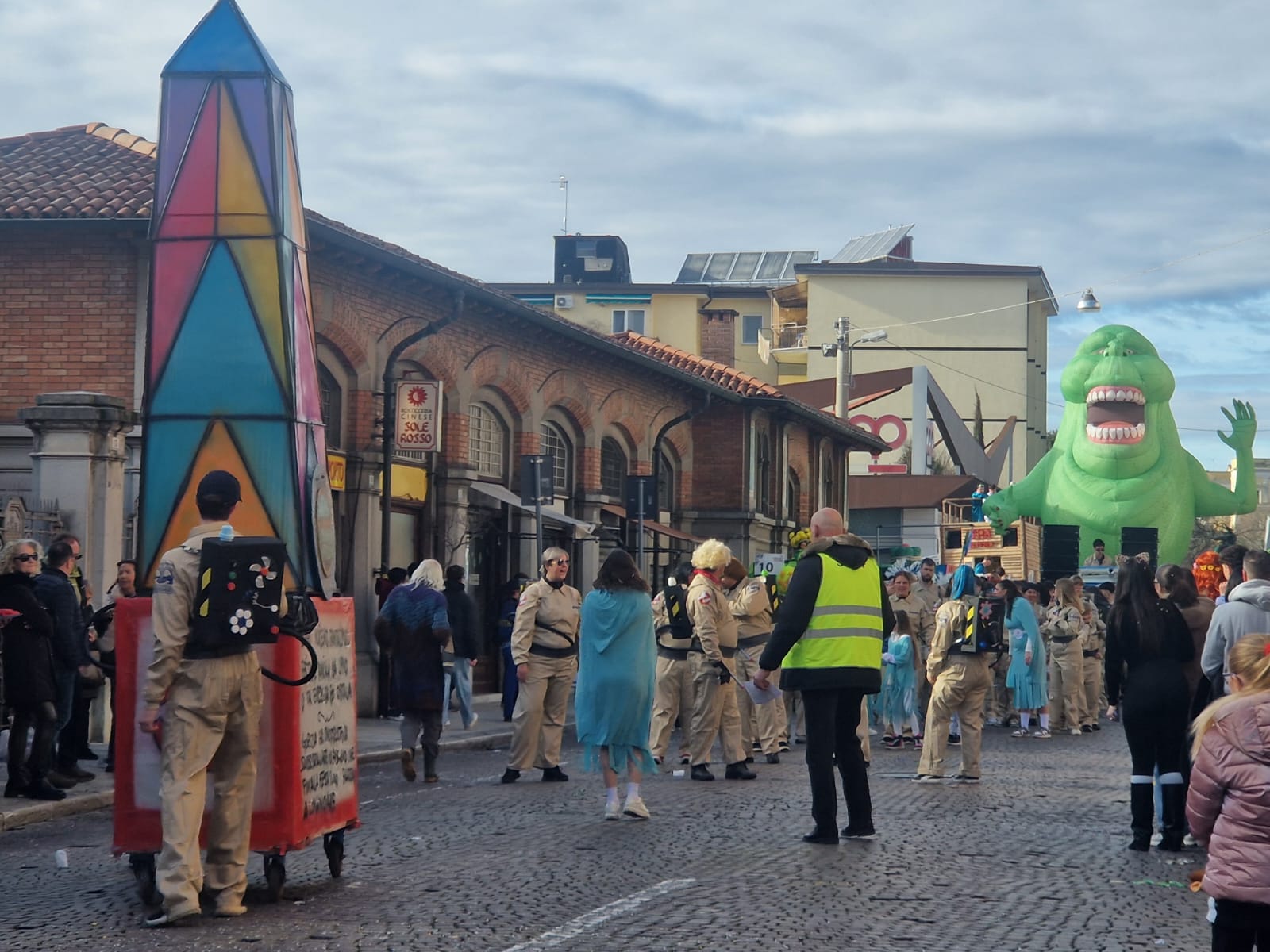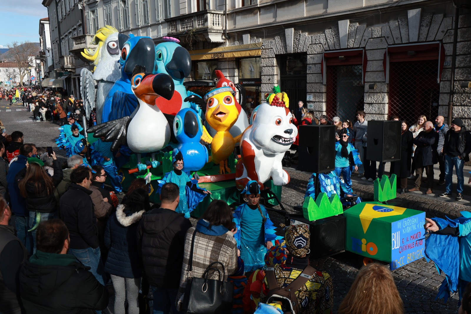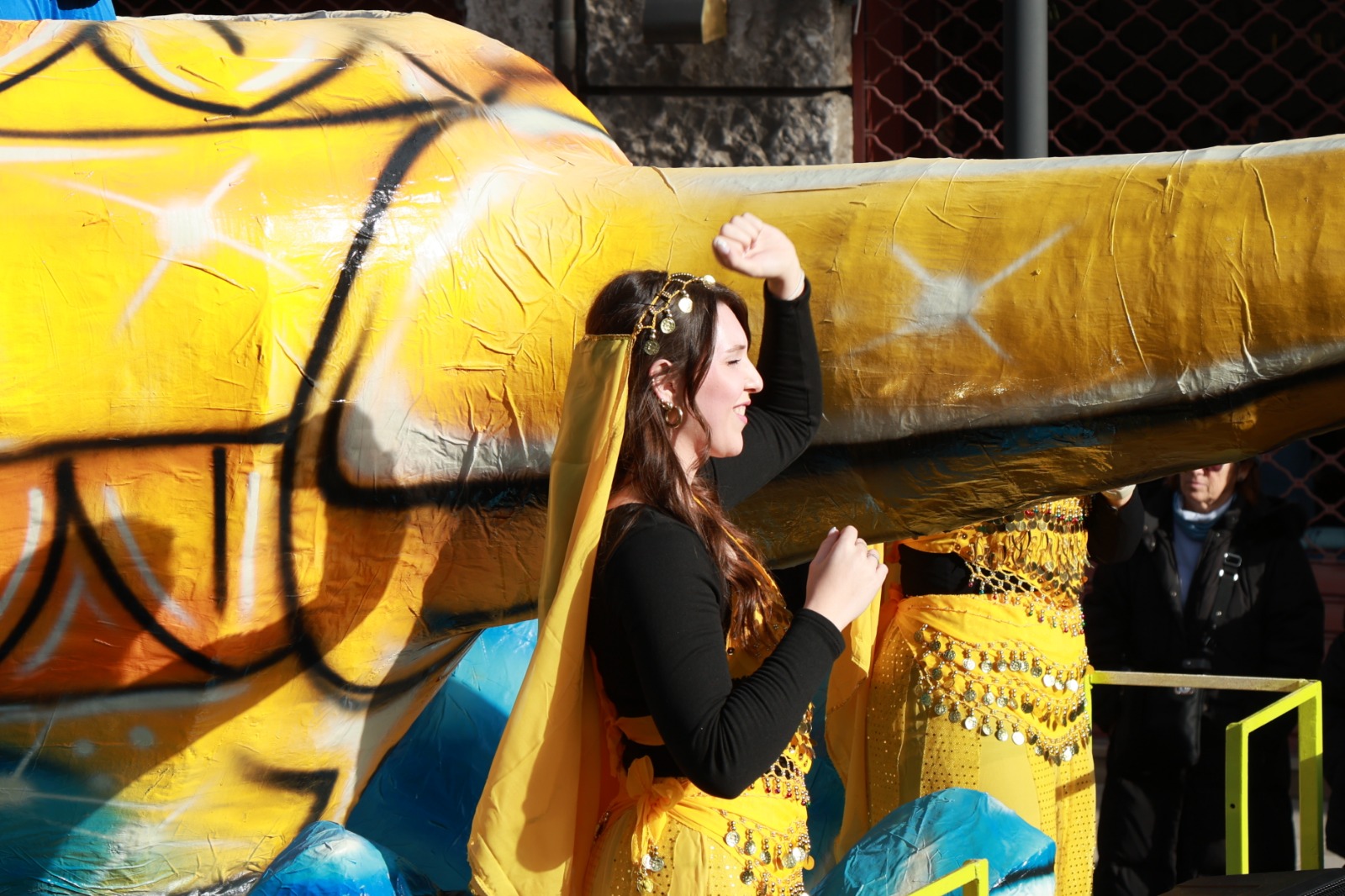 Direttamente da San Pelagio sono sbucati vasi fioriti e farfalle, perché «in un mondo dove tutto sta andando a rotoli abbiamo bisogno di cose semplici e belle». Come i Sette Nani – per l’esattezza trenta – di Colloredo di Prato, presenti con il gruppo allegorico “Fasin Fieste”: «Il nostro scopo è stare assieme e divertirci – assicura il referente Gabriele Del Bianco – condividendo una passione che comincia nel momento in cui decidiamo il tema e lo realizziamo in legna e cartapesta per passare le domeniche». Un carretto di quattro metri seguito dal corpo di ballo con Grandangolo, Trampolo, Birbantolo, Baffolo o il Nano single, a precedere il carro di otto metri con un nano che esce dalla miniera reggendo un diamante. L’associazione culturale Skala di Gabria si presenta invece con Aladino e il motto “Aladin, risolvi ‘sto casin!!” contro «guerre, crisi e occupazioni» di cui «sinceramente gavemo pieni i maroni». Su in cima al carro è montata la lampada, da cui sporge proprio lui, Aladino, che con cuffia da nuoto azzurra e braccia possenti è pronto a realizzare la magia. Brioso e danzante è invece “Blu” di San Floriano del Collio, che fra pappagalli e squadre di ballerini presenta uno strabiliante Carnevale di Rio. Dai pappagalli passiamo agli uomini delle caverne, scienziati ed esploratori, con “La storia del mondo” di Turriaco, seguito dagli attualissimi acchiappa fantasmi di “Go! Stbusters 2025” di Savogna d’Isonzo, che a suon di musica dei “Ghostbusters” ballano dietro a una sorprendente riproduzione del Go!Pharus, ammonendo: «Gorizia ha dimostrato di saper brillare, non lasciamo che finita la festa siano i fantasmi a comandare».