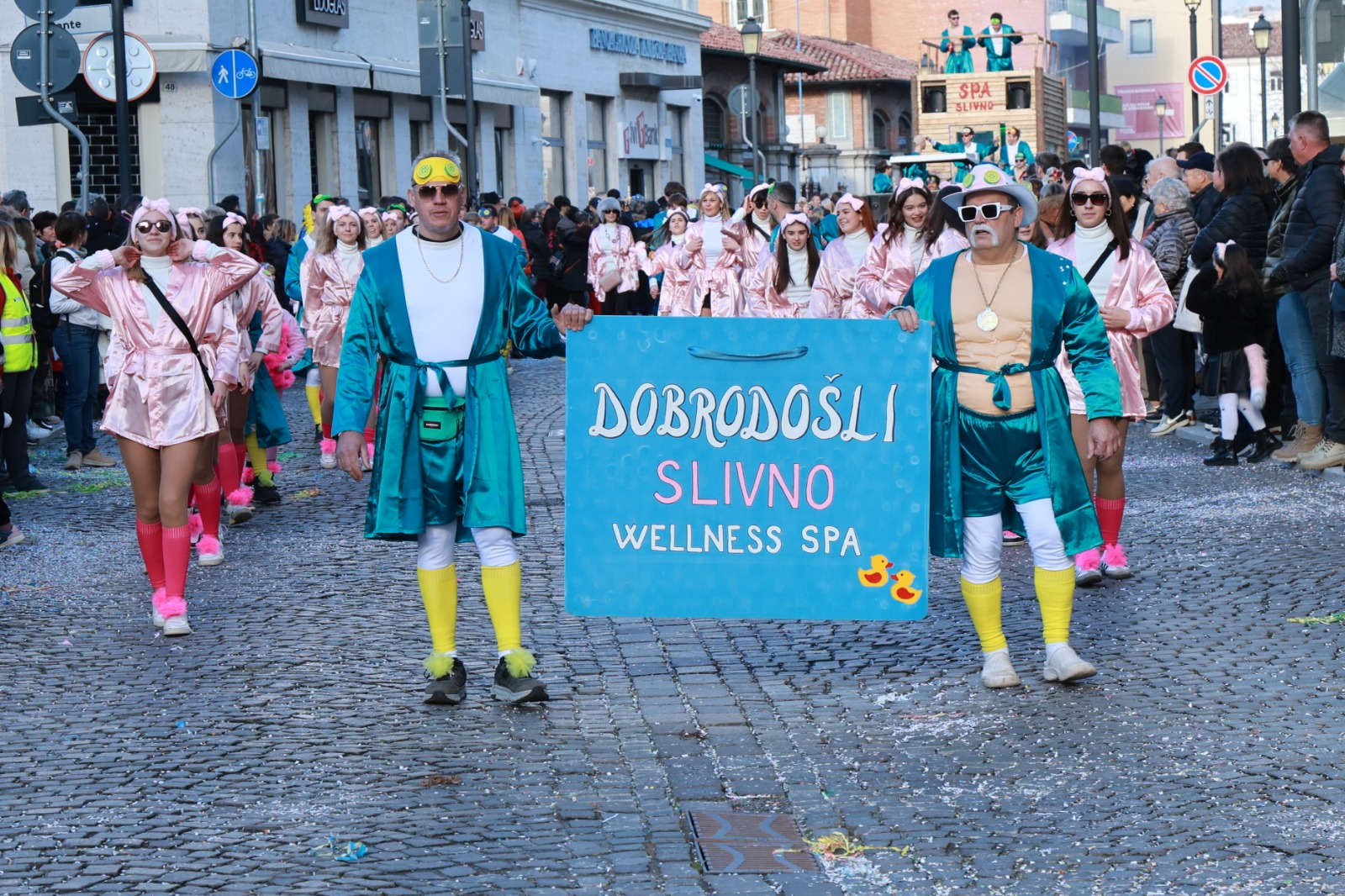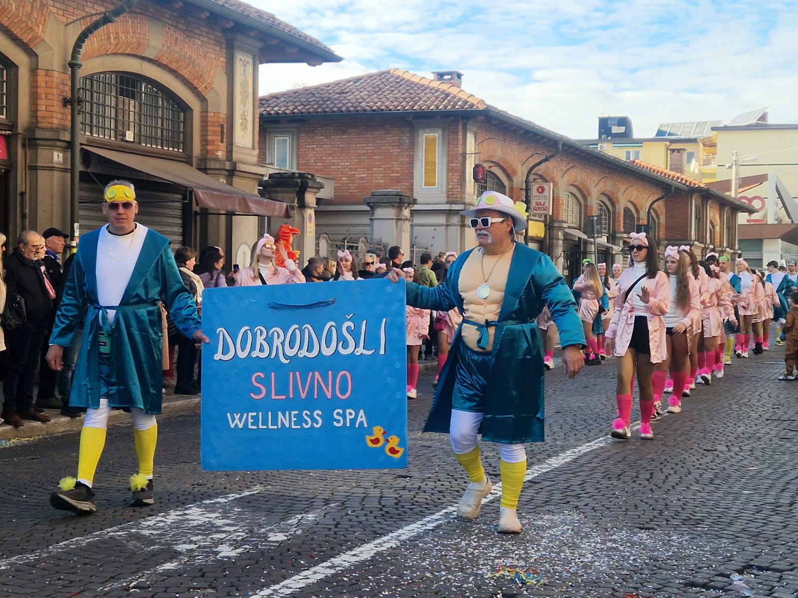 «Quest’anno abbiamo voluto un po’ scherzare sul fatto che prima del 2025 a Gorizia non c’erano feste o movimento – spiega il referente Nicolas Piron – così abbiamo deciso di realizzare i Go! Stbusters, auspicando che dopo il ’25 ci siano ancora queste feste, e quindi siamo arrivati ad acchiappare i fantasmi». Un centinaio gli iscritti, con un’ottantina di figuranti a danzare in tuta e zaino, seguiti dalla Cadillac bianca su cui campeggia un gigantesco Slimer. A trasformarsi in soffioni sono invece gli abitanti di Opatje Selo fra mille bolle di sapone, seguiti dalle laboriose formiche di Santa Croce. Troppo stress e stanchezza vi deprimono? Basta provare il centro benessere di Slivia, dove è possibile rilassarsi e staccare la spina dagli impegni: «Abbiamo scelto di realizzare una spa con sauna Jacuzzi davanti – specifica David Tercon – perché ultimamente il Carnevale sta stressando i vari gruppi, quindi il messaggio è quello di rilassarsi e divertirsi». Come ogni anno non poteva poi mancare il brio già estivo di Livio e Laura con i loro dolcissimi spaventapasseri, dietro i quali incede a passo lento un medico pronto a somministrare una flebo di vino friulano. Se il gruppo di Tolmino suona gli strumenti realizzati negli anni Cinquanta, la parata di Doberdò del Lago regala una spettacolare coreografia di maschere futuristiche dominate dal nero e dall’oro, precedendo un carro di animali geometrici. Ed è stato proprio questo ad aggiudicarsi il primo posto nella classifica finale, seguito dal carro di Sant’Andrea e in terza posizione da quello di San Floriano. Se a rallegrare la scorsa edizione erano i «vrzotari», quest’anno Sant’Andrea ha proposto un carro a “tema inflazione”: