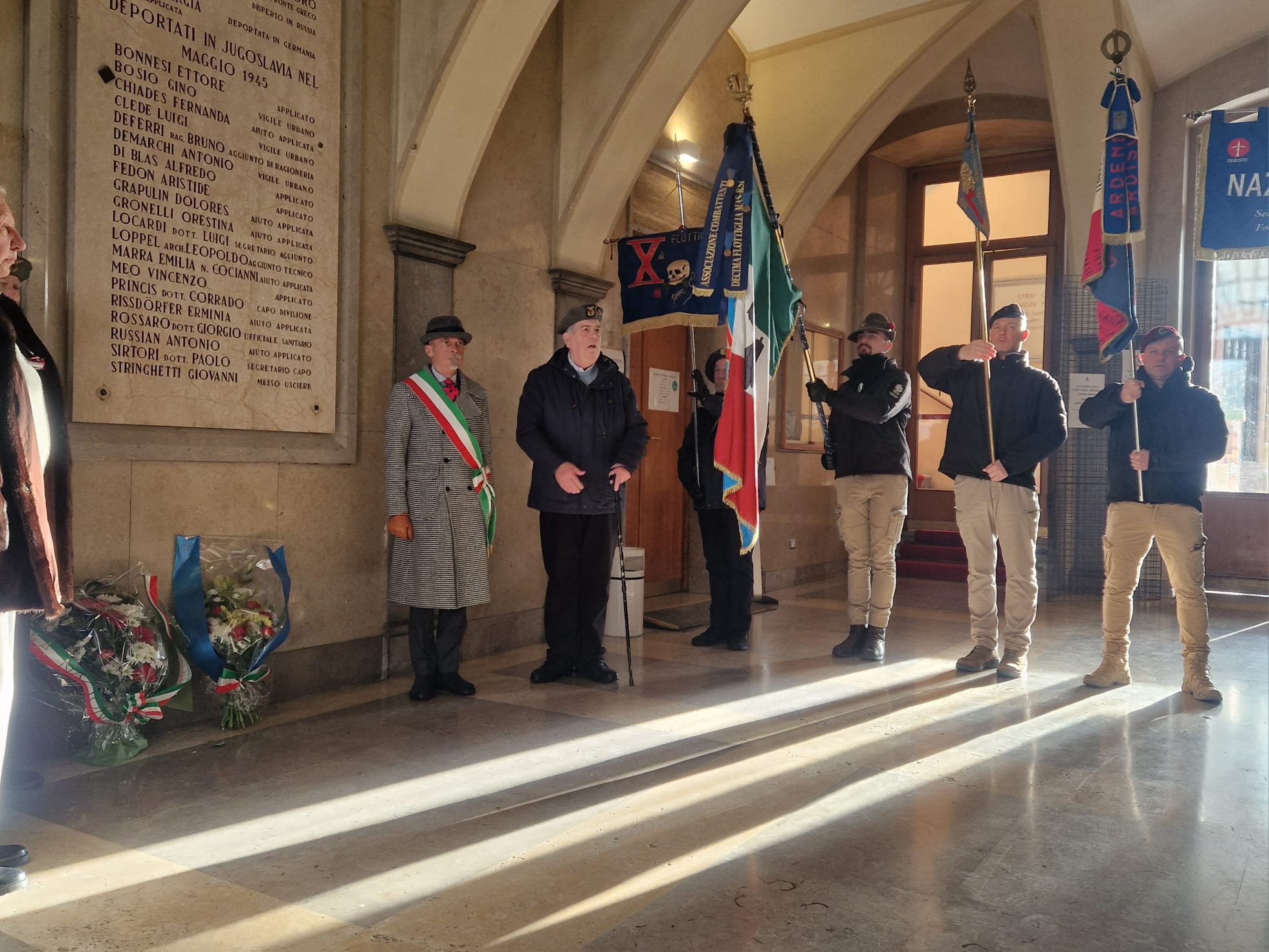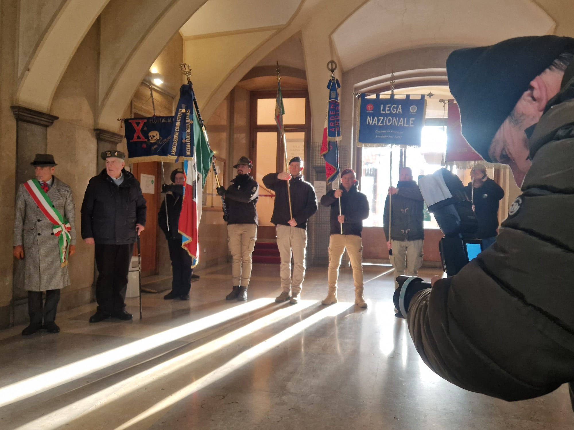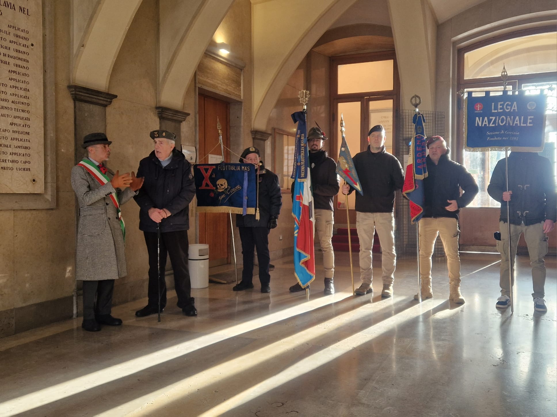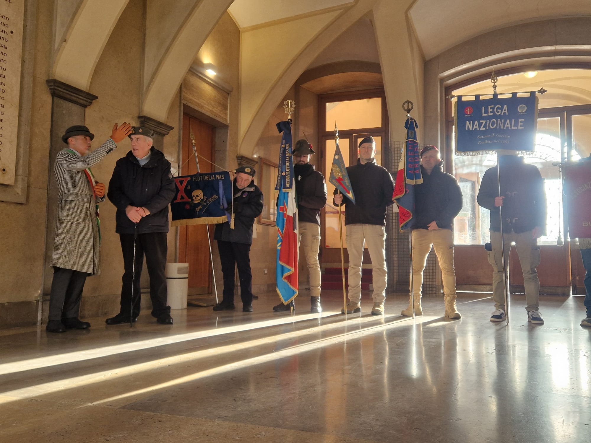 Le mitragliatrici nella neve, il freddo pungente ad attanagliare il battaglione Fulmine, inviato a Tarnova dopo breve formazione a La Spezia. Stava a presidiare l’avamposto, ma finì accerchiato da truppe jugoslave e i superstiti vennero recuperati dalle colonne italotedesche di Gorizia. Per ricordare la battaglia di Tarnova del gennaio 1945, oltre che commemorare i dipendenti comunali «deportati dagli jugoslavi» a maggio dello stesso anno, anche in questo 2026 l’associazione XMas ha voluto portare un tributo nel municipio del capoluogo isontino. Ad accoglierli è stato però quello che Marino Clemente di ANPI definisce «un episodio folcloristico», in quanto prima delle nove di oggi - sabato 17 gennaio – mani ignote hanno scaricato una secchiata di liquami, di colore marrone, all’ingresso del comune, e solo dopo aver ripulito i sampietrini si è potuto procedere con la manifestazione.