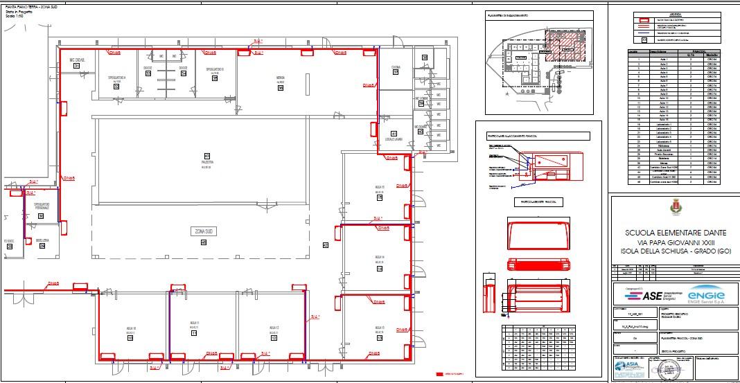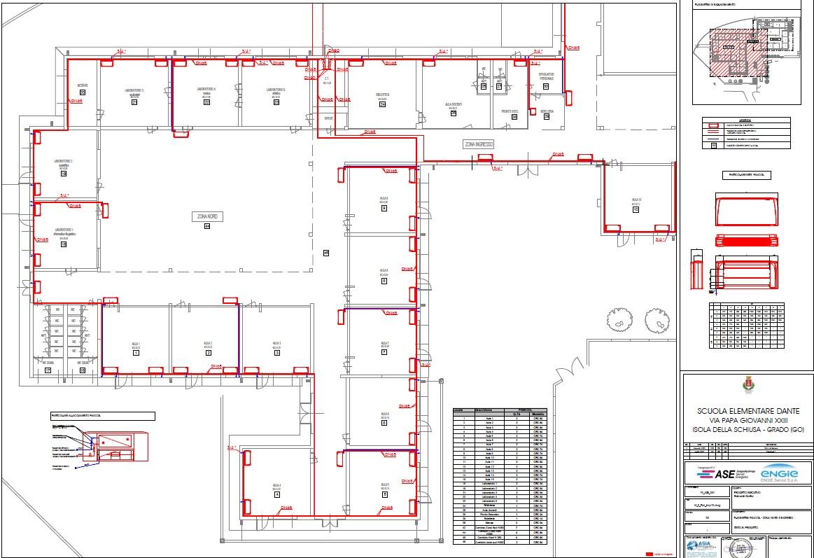 La quasi totalità della volumetria dell’edificio verrà trattata con il nuovo impianto a ventilconvettori per il riscaldamento invernale e il condizionamento estivo. Alcuni locali di servizio verranno invece serviti da un impianto di solo riscaldamento invernale a radiatori. L’impianto di condizionamento sarà suddiviso in due zone, in modo da poter utilizzare l’edificio in modo parziale, in funzione dell’effettiva esigenza. Il progetto prevede che ogni aula sia dotata di due ventilconvettori, per distribuire meglio l’aria in ambiente. I ventilconvettori avranno ventilatori tangenziali, particolarmente silenziosi e quindi idonei per l’impiego scolastico.