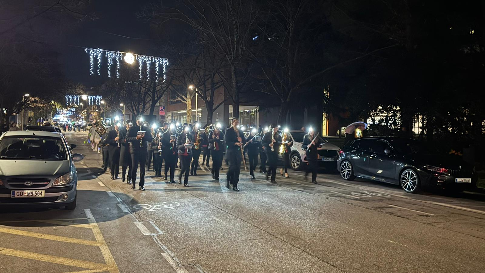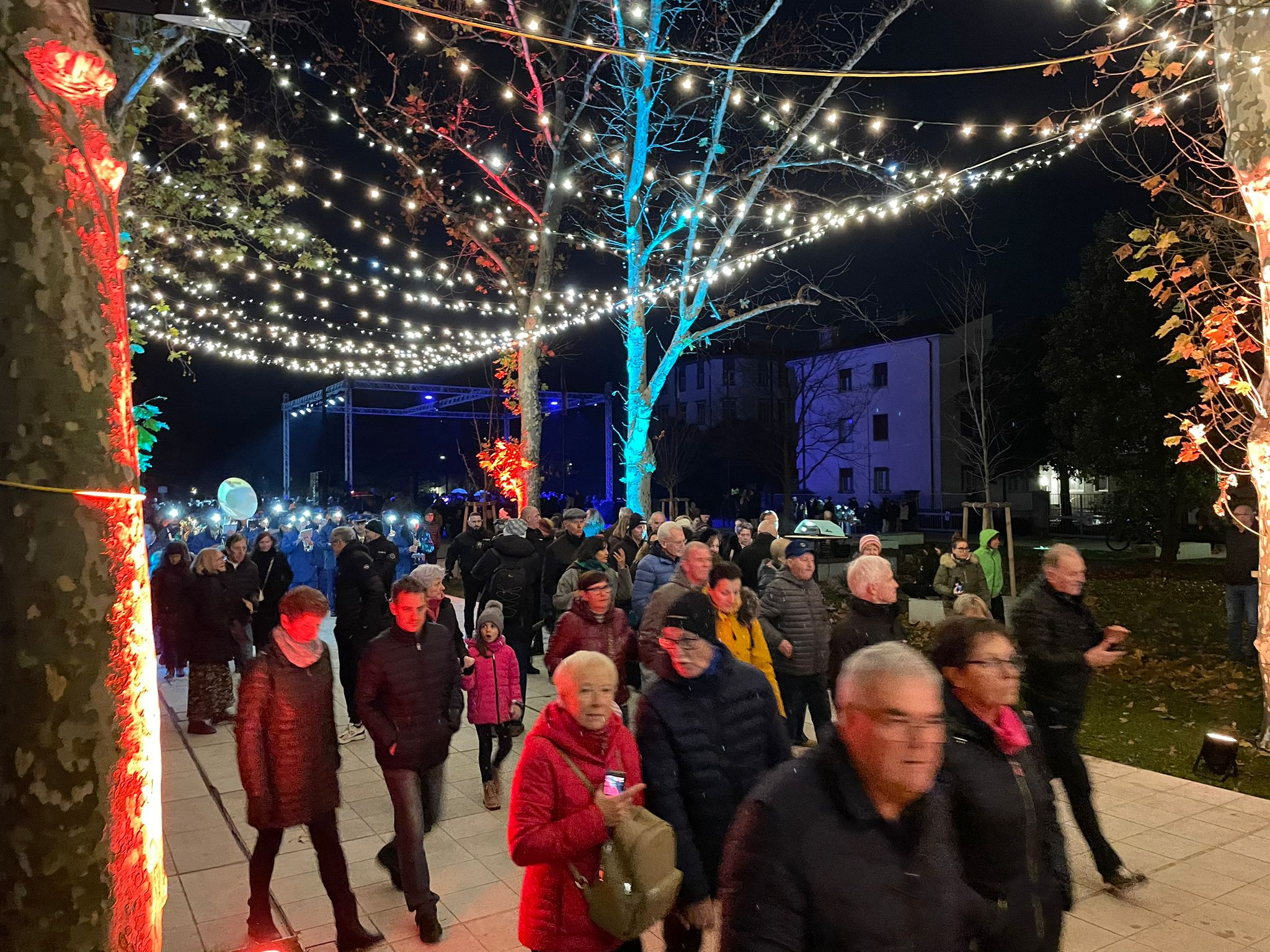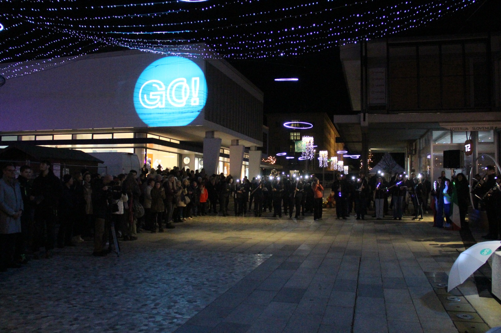 Due cortei luminosi, colorati, sonori. Due cortei come le due città, Nova Gorica e Gorizia, che si sono simbolicamente incontrate in Piazza Transalpina/Trg Evrope, accolti dal coro dei bambini e dalla stazione di Nova Gorica illuminata per il periodo natalizio.