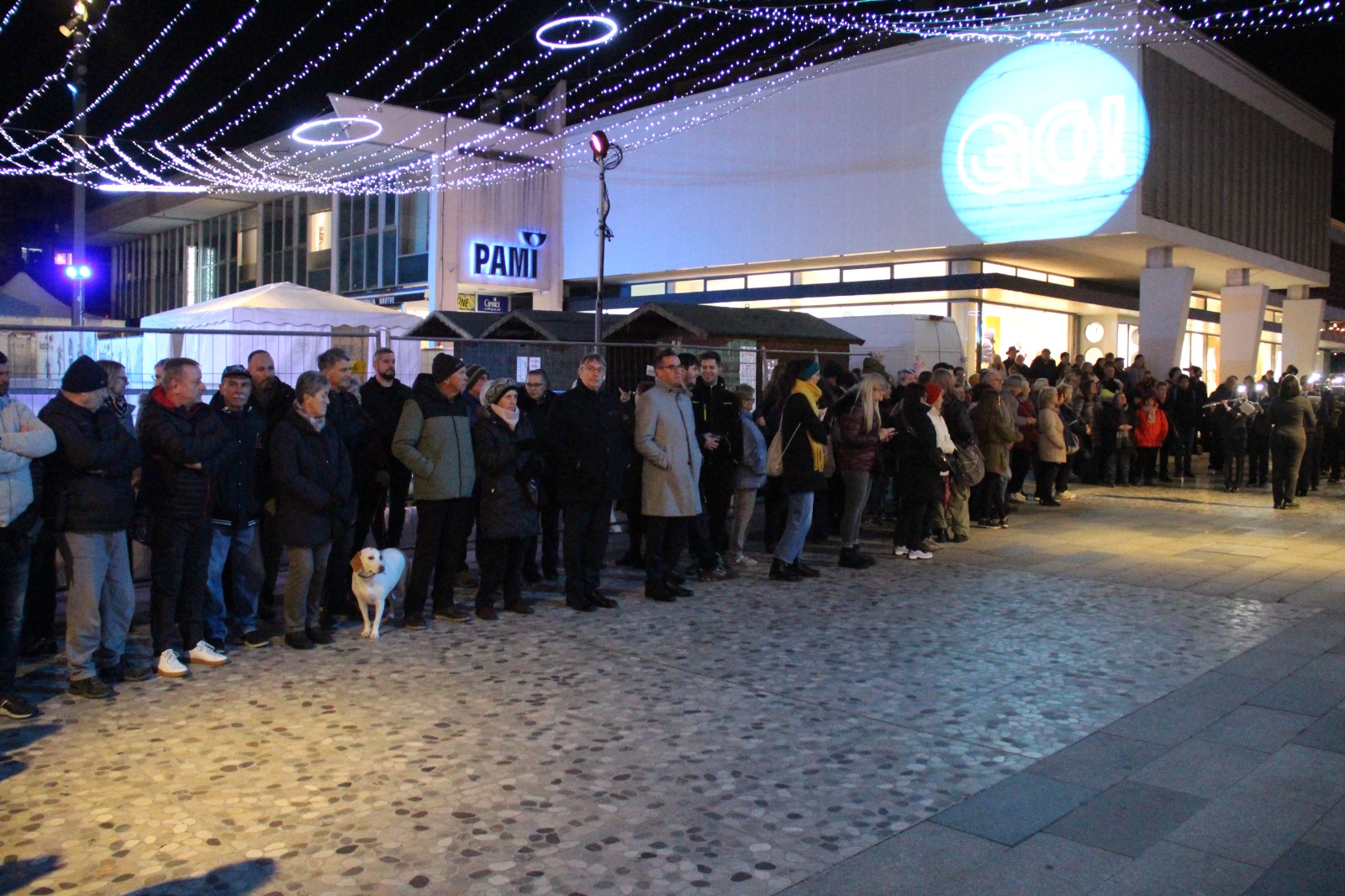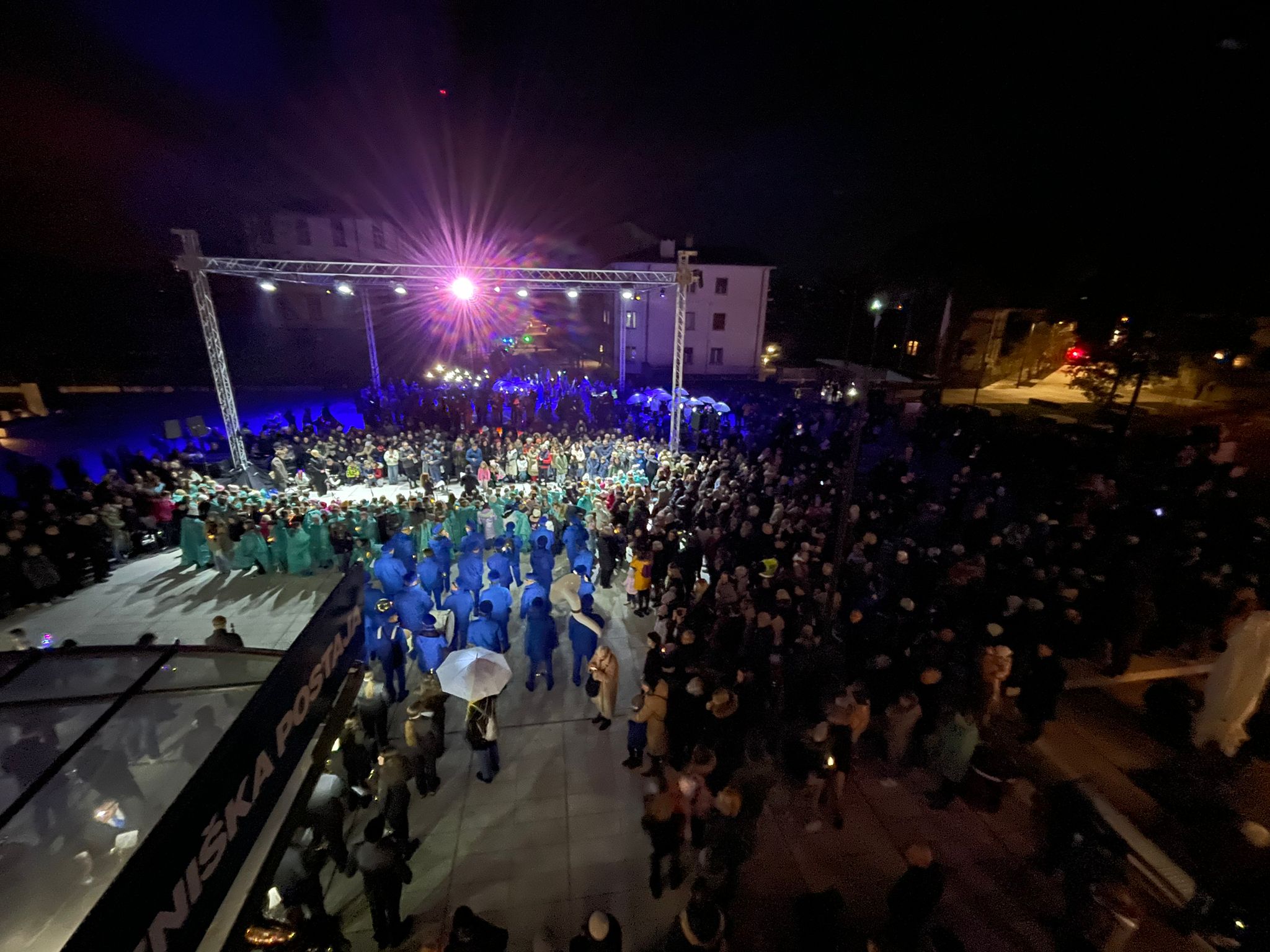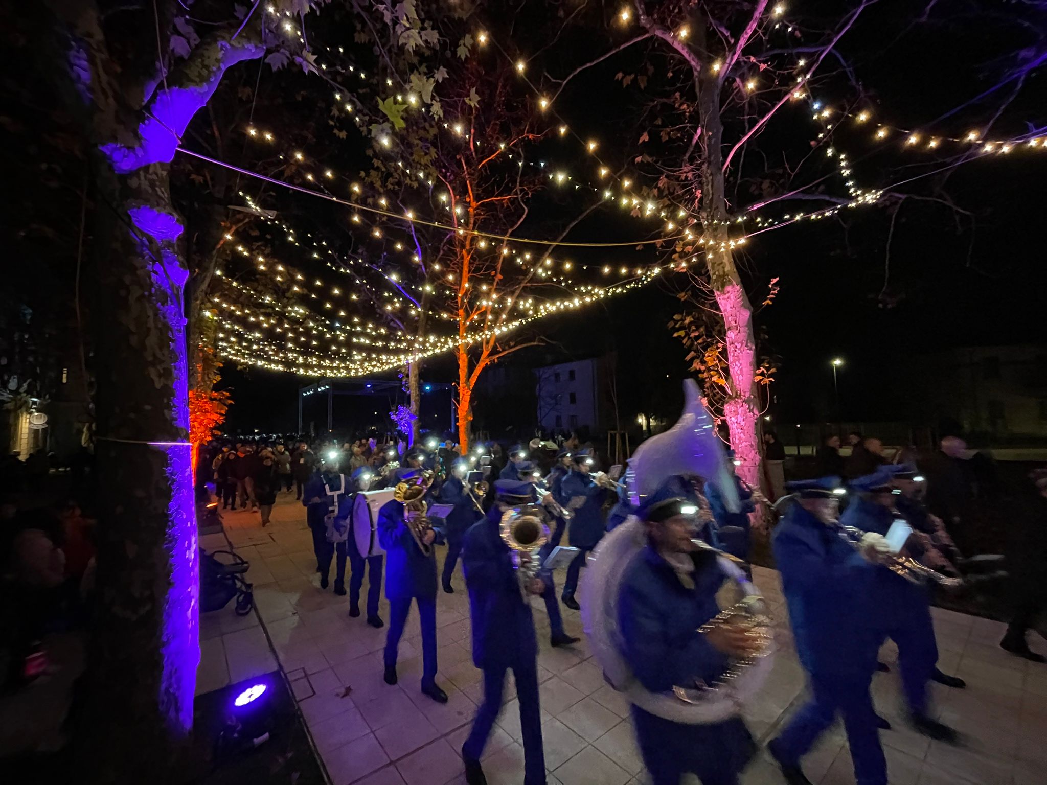 Due cortei luminosi, colorati, sonori. Due cortei come le due città, Nova Gorica e Gorizia, che si sono simbolicamente incontrate in Piazza Transalpina/Trg Evrope, accolti dal coro dei bambini e dalla stazione di Nova Gorica illuminata per il periodo natalizio.