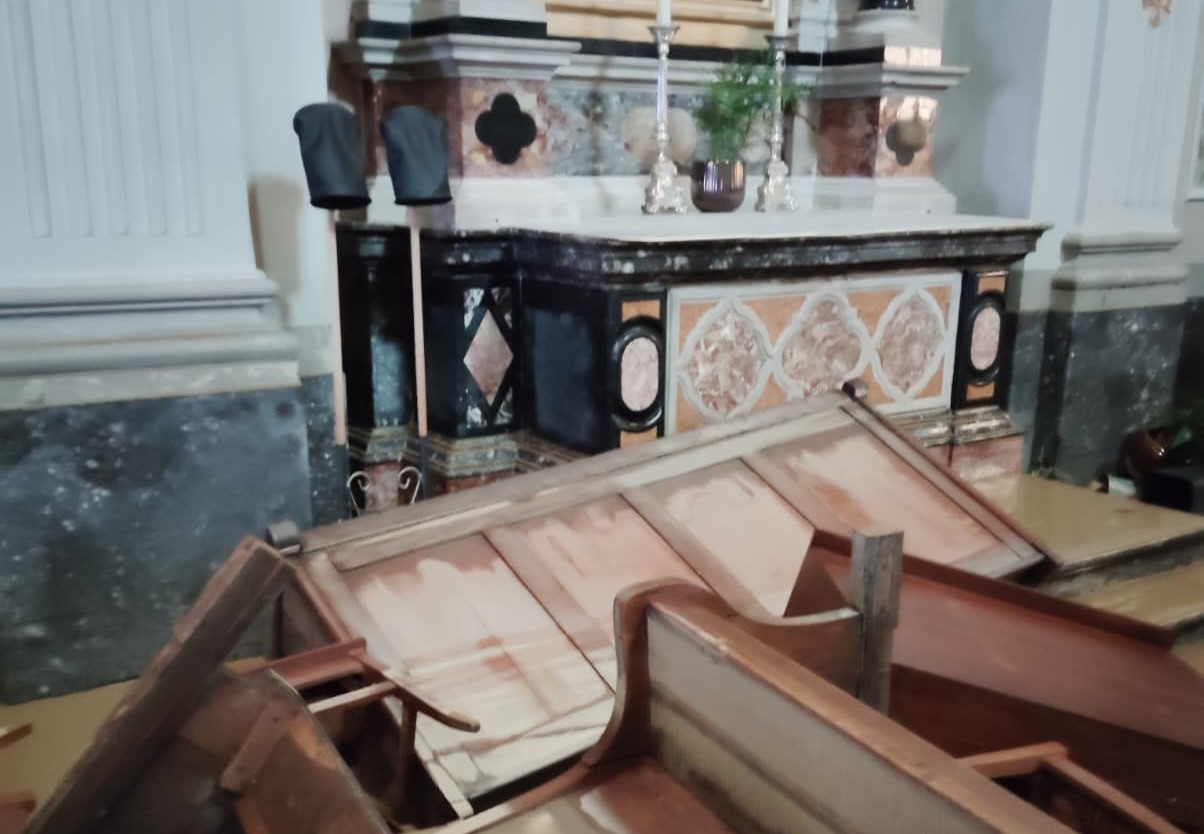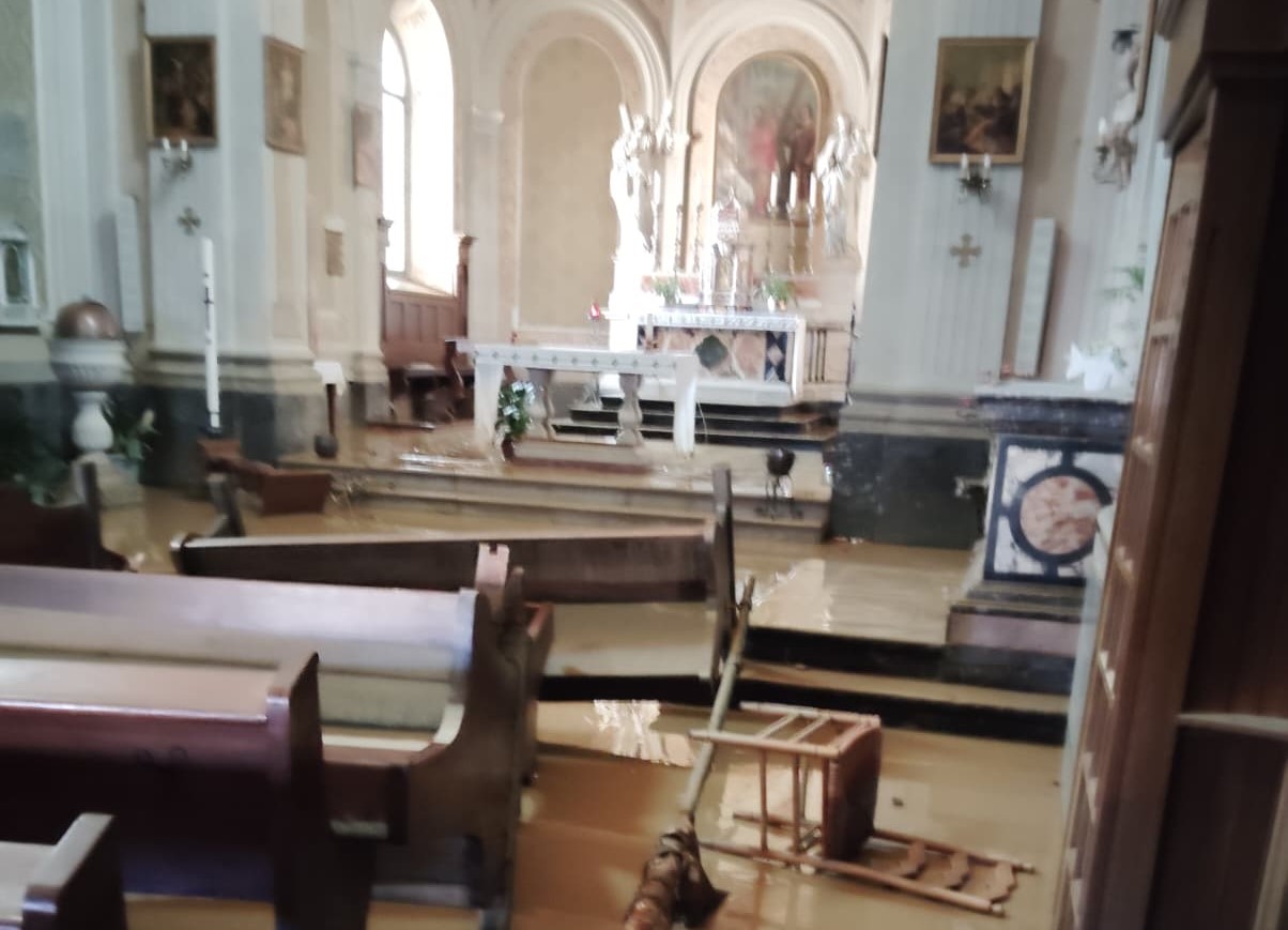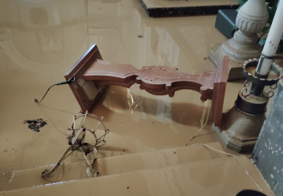 La devastazione dell’acqua nella chiesa di Versa, sospeso il Ringraziamento 2025
