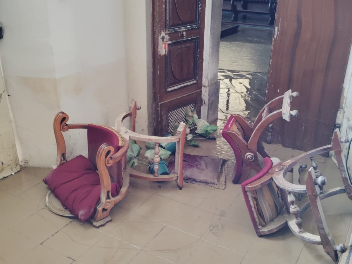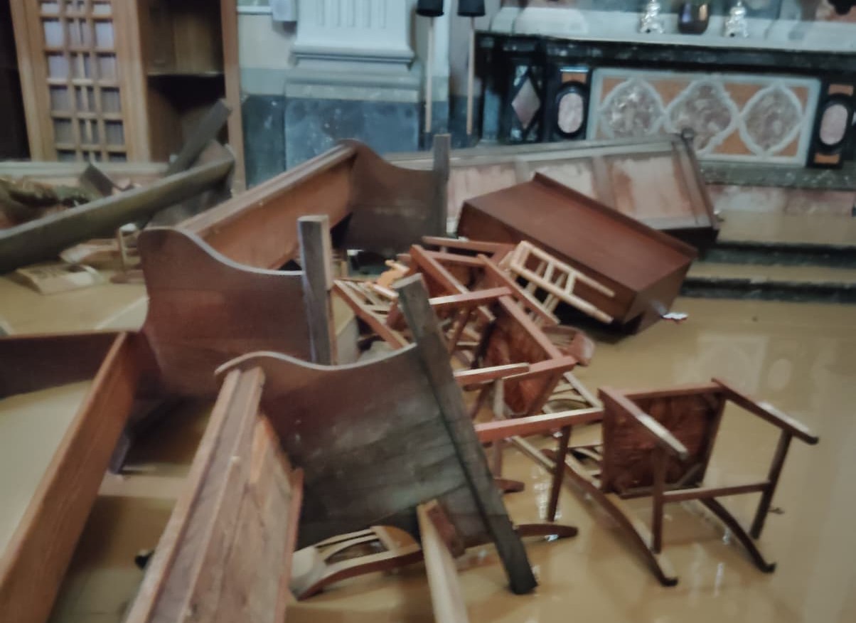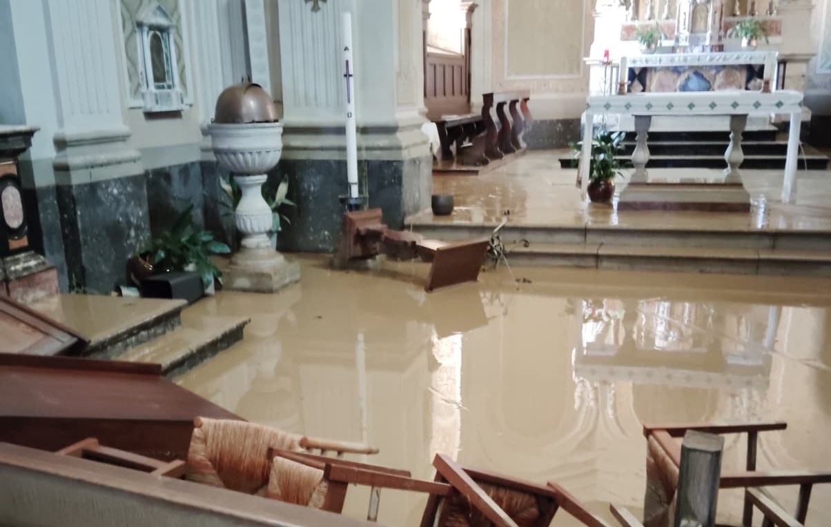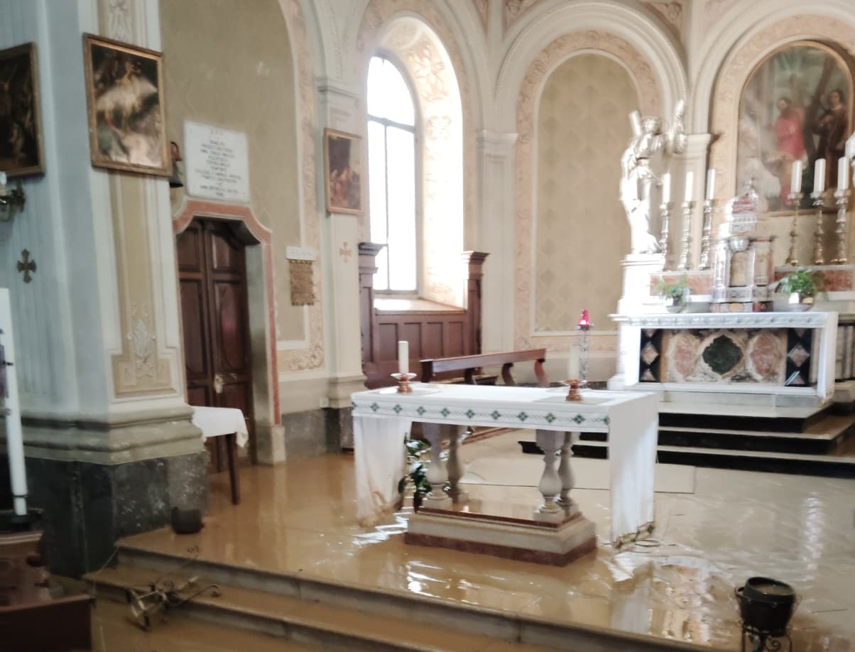 I banchi rovesciati, il leggio a terra tra il fango, i vecchi stendardi da processione a terra gonfi d’acqua: è stato uno spettacolo a dir poco spettrale, come per ogni abitazione della frazione di Versa, quello che si è presentato di fronte ai volontari della parrocchia di Sant’Andrea apostolo quando, questa mattina, hanno aperto la porta principale per contare i danni da esondazione.
