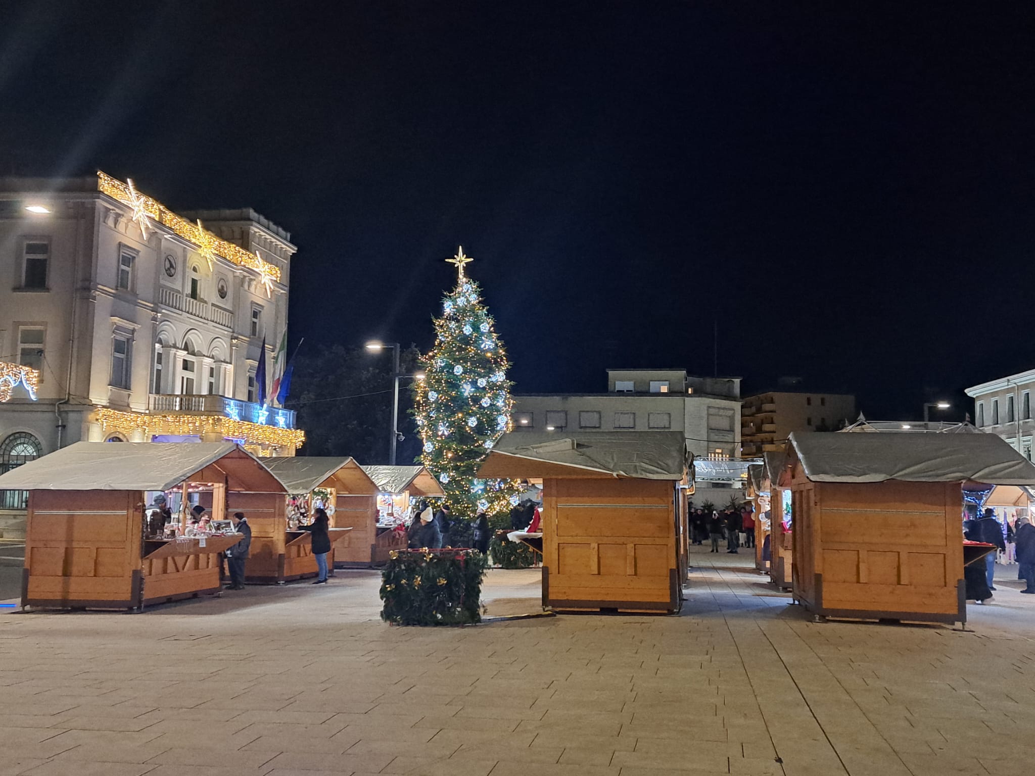 Le 14 casette del “Villaggio di Natale” e la pista di pattinaggio sul ghiaccio - ora ufficialmente aperte - accolgono chi arriva in piazza, mentre volgendo lo sguardo verso l’alto si notano le tre figure di luce della Natività sulla facciata della Rocca; completa il quadro anche il presepe in piazza, anch’esso illuminato a festa.