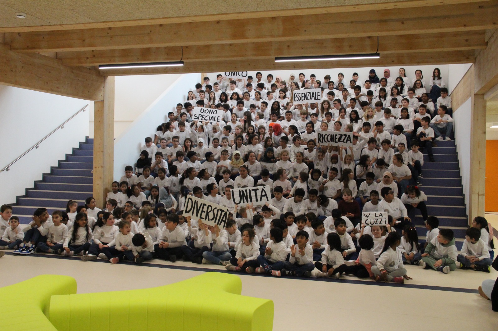 È stata apposta proprio sul cancello azzurro la targa datata 2015 della scuola elementare Amelio Cuzzi di Monfalcone, che da stamane, venerdì 23 gennaio, può finalmente mostrarsi al pubblico nella sua rinnovata veste. La targa commemorativa, che in precedenza campeggiava sulla facciata del vecchio istituto, rappresenta oggi l’unico elemento rimasto a testimonianza della storica scuola, completamente ricostruita ex novo. Tanti gli alunni presenti all’inaugurazione che, nell’atrio principale, hanno accolto le autorità sedendosi sulla grande nicchia con spalti dedicata, tutti indossando la maglia bianca con il simbolo dell’istituto e intonando canzoni dedicate ai valori della pace, della diversità e dell’unità.