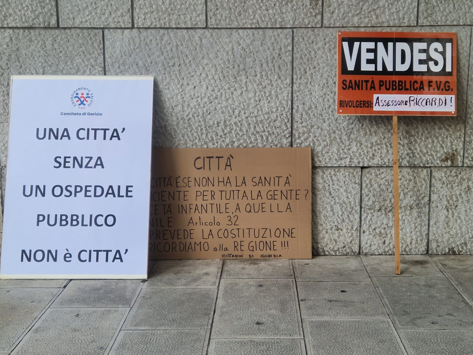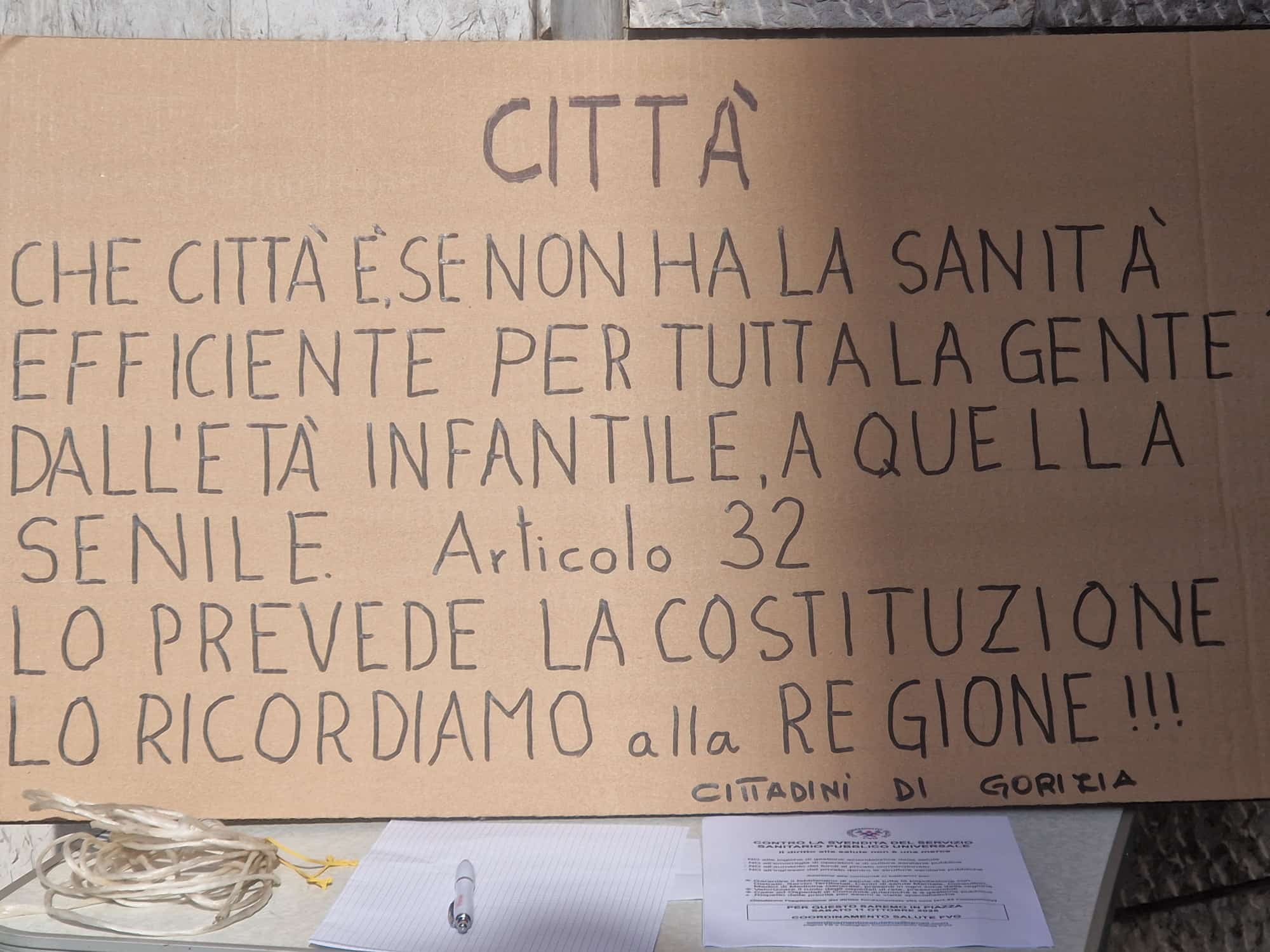 «Vendesi la sanità pubblica del Friuli Venezia Giulia, per informazioni rivolgersi all’assessore Riccardi». Un cartello rosso realizzato dal Comitato di Salute Pubblica di Gorizia che riflette con amara ironia la tragicità della sanità italiana. Il presidio organizzato nella mattinata di oggi – 11 ottobre – in Corso Verdi si è prefisso il duplice obiettivo di risvegliare la cittadinanza dal torpore della rassegnazione, per informarla in merito alla situazione locale e regionale. «Questa giornata è stata scelta dal Coordinamento Regionale Salute FVG – spiega il presidente del Comitato Daniela Careddu – un’organizzazione civica di cittadini che segue quanto accade in Regione in ambito sanitario, battendosi per la salvaguardia del servizio pubblico». Una manifestazione che unisce tutte le piazze della Regione, da Trieste a Pordenone, in un grande abbraccio corale che possa scuotere anche le coscienze delle amministrazioni. «Vogliamo informare i cittadini – prosegue – e dare risalto a quanto viene poco seguito dagli organi di stampa, per fornire un’informazione corretta. La sanità pubblica sta attraversando una grave crisi, in quanto da decenni si procede verso la privatizzazione». Il rischio sempre più reale è la trasformazione del vecchio ente in una “struttura d’élite” accessibile solo a pagamento, esclusiva per quanti dispongono del denaro necessario a visite ed esami.