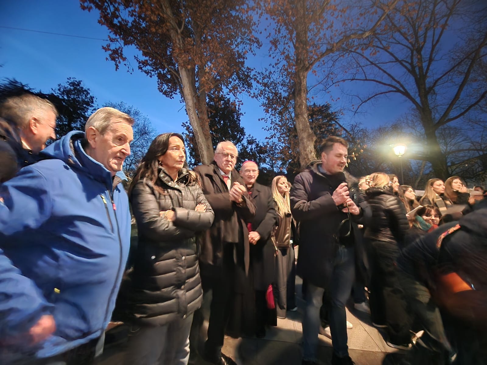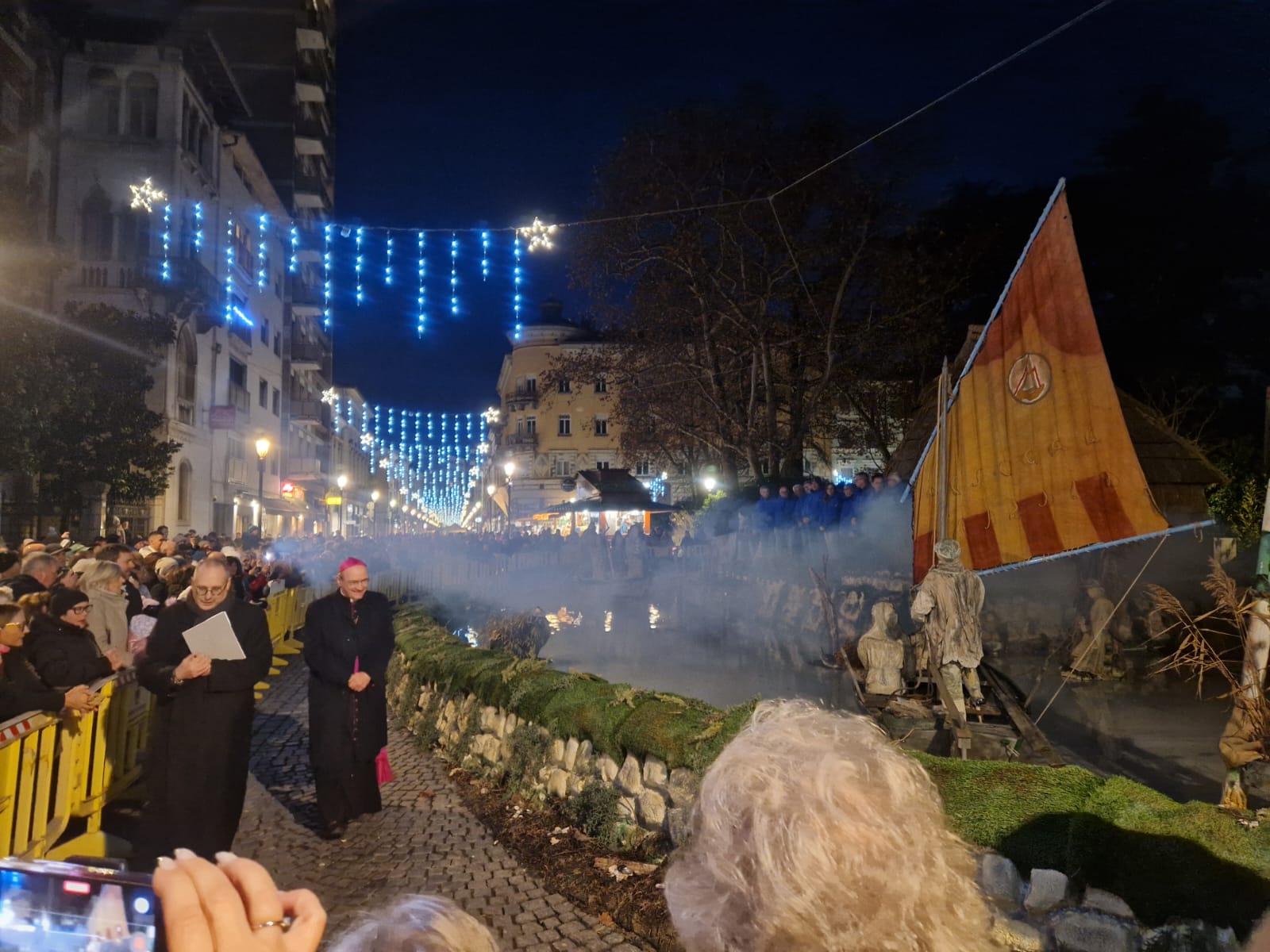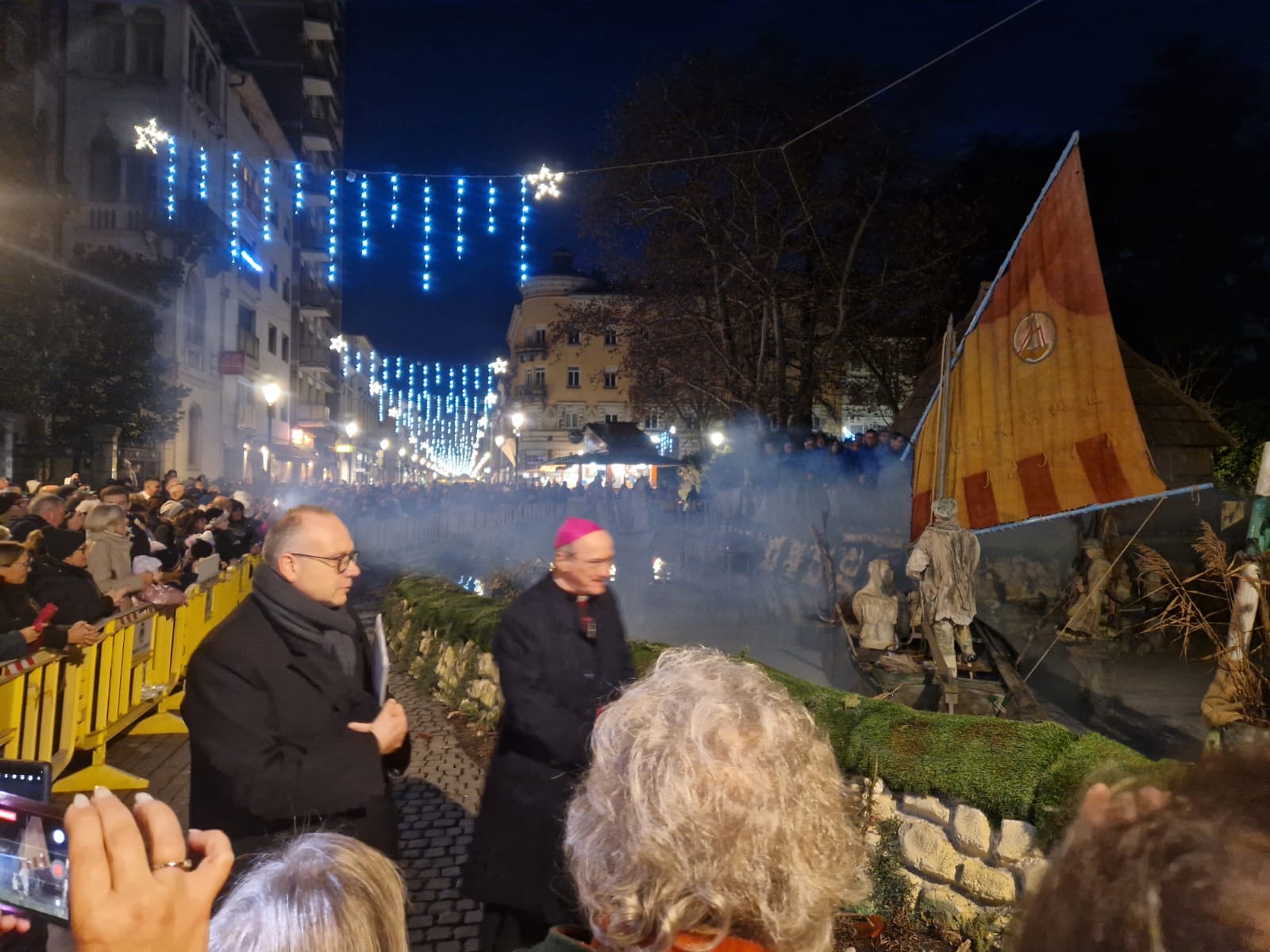 Nel complesso sono 102 blocchi di polistirolo assemblati a semicerchio, che prima di trovare la forma attuale hanno avuto una gestazione di varianti diverse. «La cosa bella – riflette - è aver coinvolto tutte le associazioni dell’isola, perché il presepe è di Grado, e Antonio ha voluto coinvolgere l’intera comunità». Dalle “batele” alla canna palustre, fino alle “bricole” e agli uccelli di laguna che popolano lo specchio d’acqua, la teatralità balza sulla carreggiata portando alla ribalta su corso Verdi – con il traffico a senso alternato – tutta la meraviglia della Natività. «Sono elementi abbastanza leggeri - aggiunge - di canna o polistirolo. L’unica cosa pesante è l’argine che contiene cordonate stradali per bilanciare la spinta dell’acqua, in quanto all’interno se ne trovano circa 30 metri cubi». A prendere la parola - dopo la dolce introduzione del coro di bambini dell’istituto comprensivo “Locchi Perco” e “Ascoli” e di un piccolo gruppo dello “Slataper” – è stato il primo cittadino Rodolfo Ziberna, che ha ringraziato l’associazione dei Portatori della Madonna di Barbana: «Sono tante le iniziative – sottolinea – del Dicembre Goriziano, ma questo che vediamo è “il” presepe allestito davanti alla basilica di San Pietro, io stesso ho potuto ammirarlo in piazza».