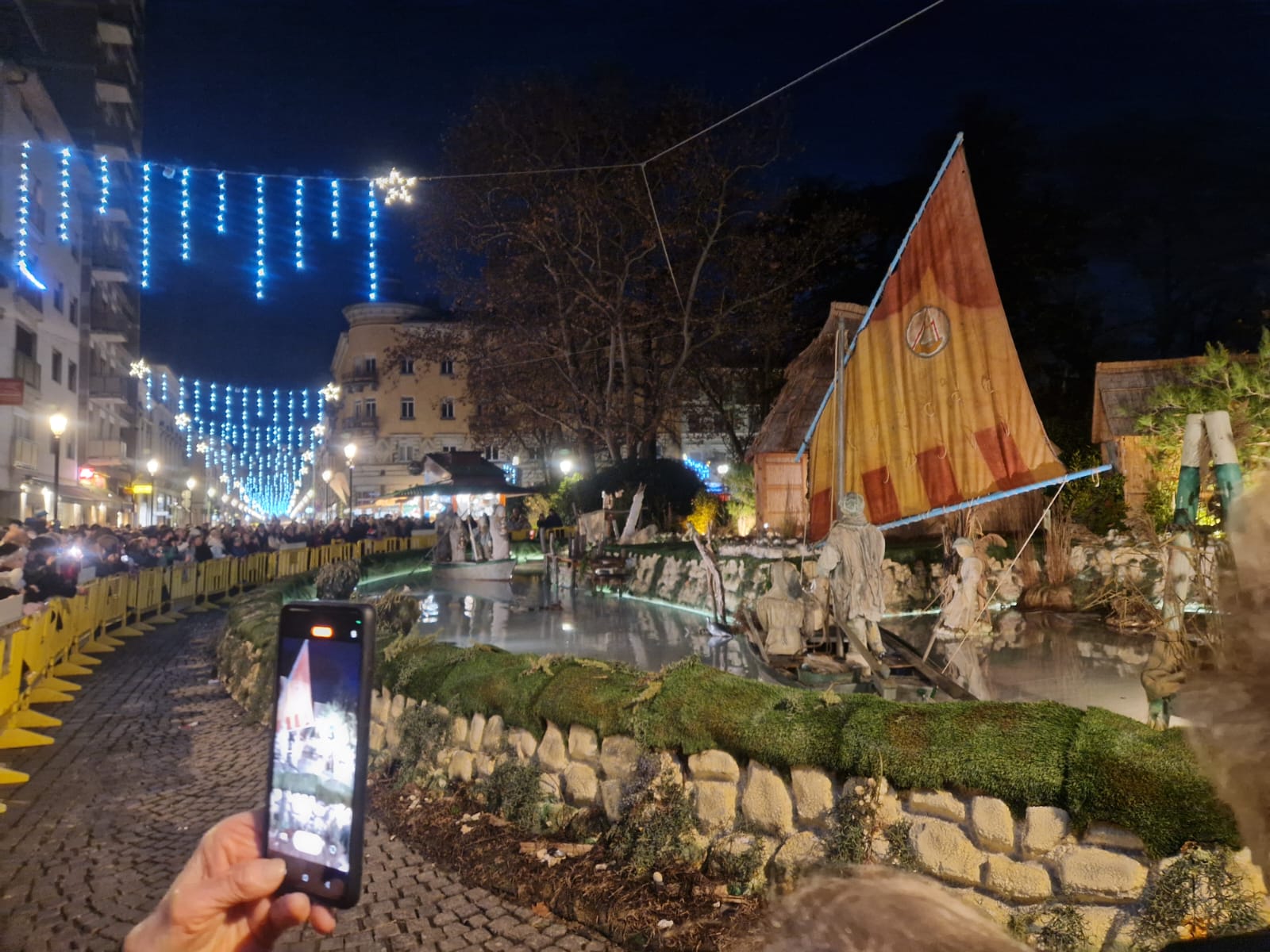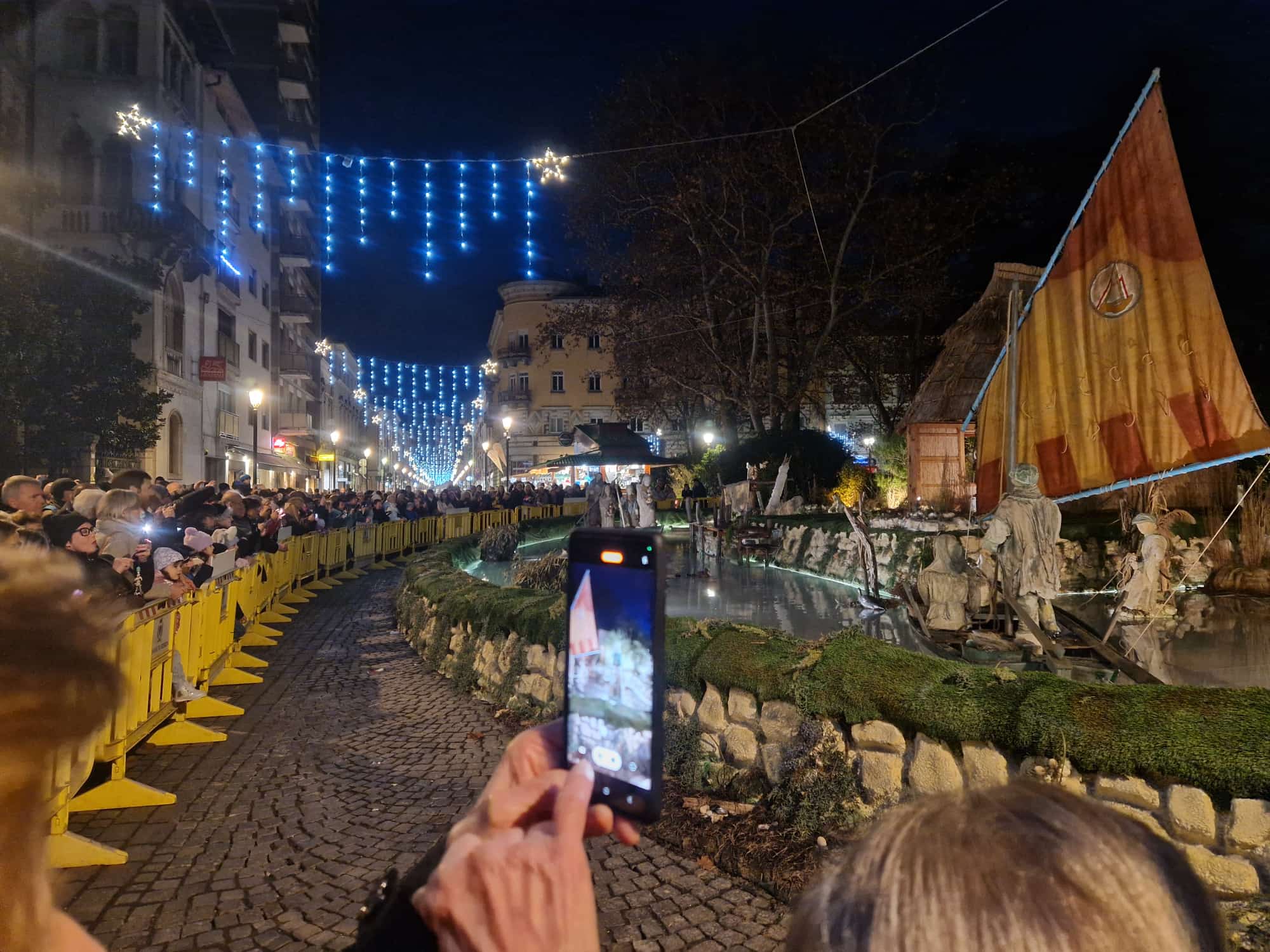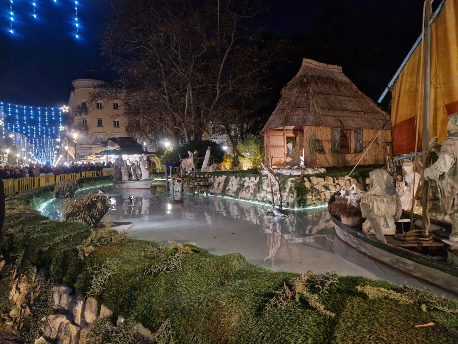 Esposto ai Giardini Pubblici vi rimarrà esposto per un mese. L’opera di 14 metri per 30 riproduce il mare dell’isola con imbarcazioni, casoni e personaggi quasi a grandezza naturale. Acceso anche l’albero e aperta la pista di ghiaccio in piazza Vittoria.