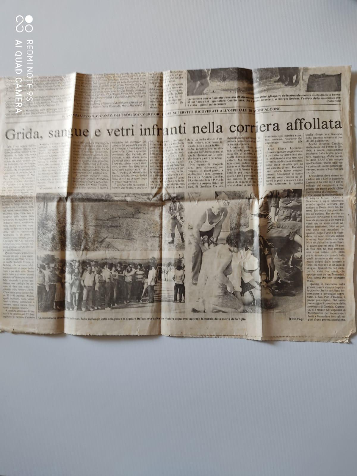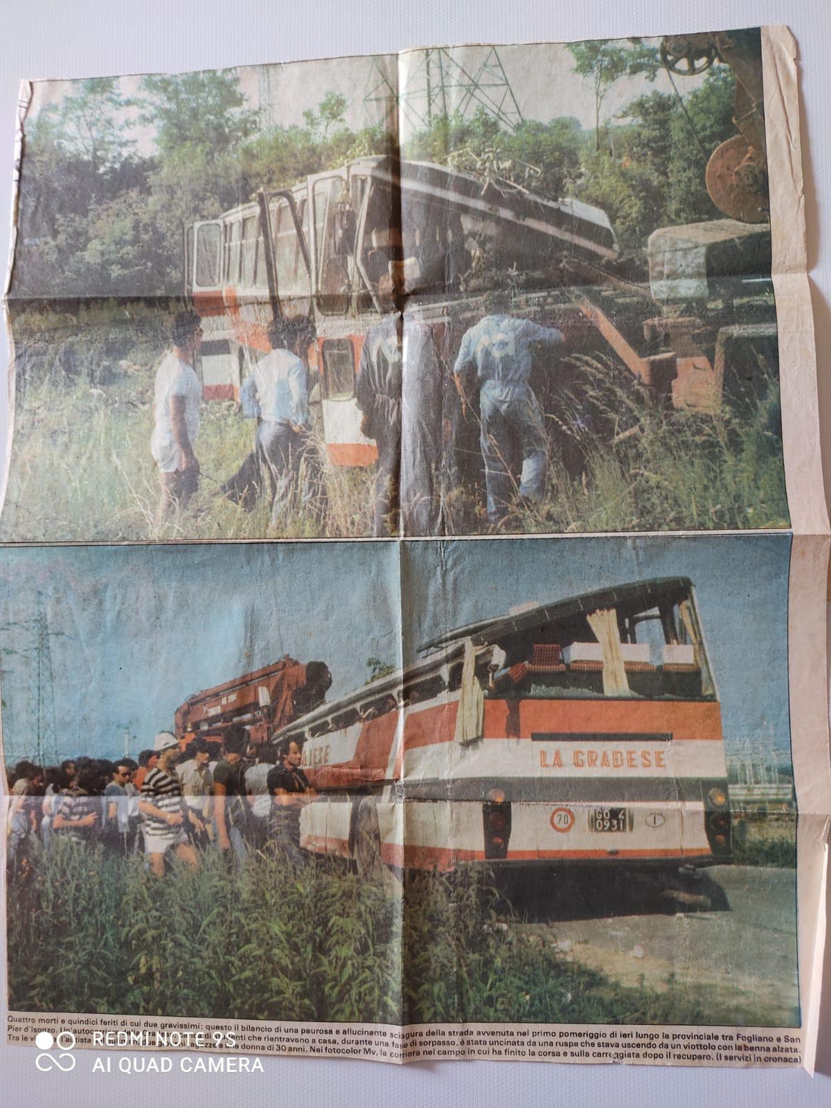 Donatella Zamarian, all’epoca sedicenne, ricorda con emozione i fatti. “Stavamo rientrando da Gorizia – racconta – ed eravamo quasi arrivati. La corriera era piena di studenti, soprattutto di San Pier d’Isonzo. L’autista è sempre stato famoso per la guida un po’ vivace. Ha sorpassato il pulmino degli alunni delle scuole medie di Fogliano, era vuoto perché aveva già fatto il suo giro. È fuoriuscita la ruspa, con la benna alzata, dalla zona del Sant’Elia e l’autista non ha fatto in tempo ad accorgersi che tutto il lato dei finestrini era stato tranciato. Dopo duecento metri di corsa per inerzia la corriera è finita in un campo a lato della strada”.