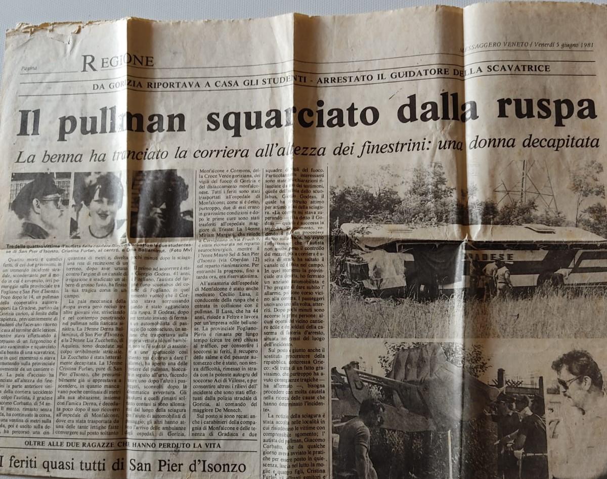 A quarant’anni dalla tragedia, San Pier d’Isonzo ricorda il tragico pomeriggio del 4 giugno 1981. In paese è ancora vivo il ricordo della corriera che quel giorno, rientrando con un nutrito gruppo di studenti da Gorizia, si scontrò con la benna alzata di una ruspa. Uno scontro costato la vita a quattro persone, alle giovani Derna Ballaminut e Cristina Furlan, all’autista Giacomo Corbatto e a Lia Zucchetto di Aquileia. Quindici i feriti, di cui due furono dichiarati immediatamente gravi, mentre per i quattro fatale fu lo scontro. Cristina, come ricordano le pagine dei quotidiani di allora, si spense, invece, all’ospedale di Monfalcone. Derna e Cristina, di fatto, si apprestavano a scendere dalla corriera in quanto vicine alla loro fermata.