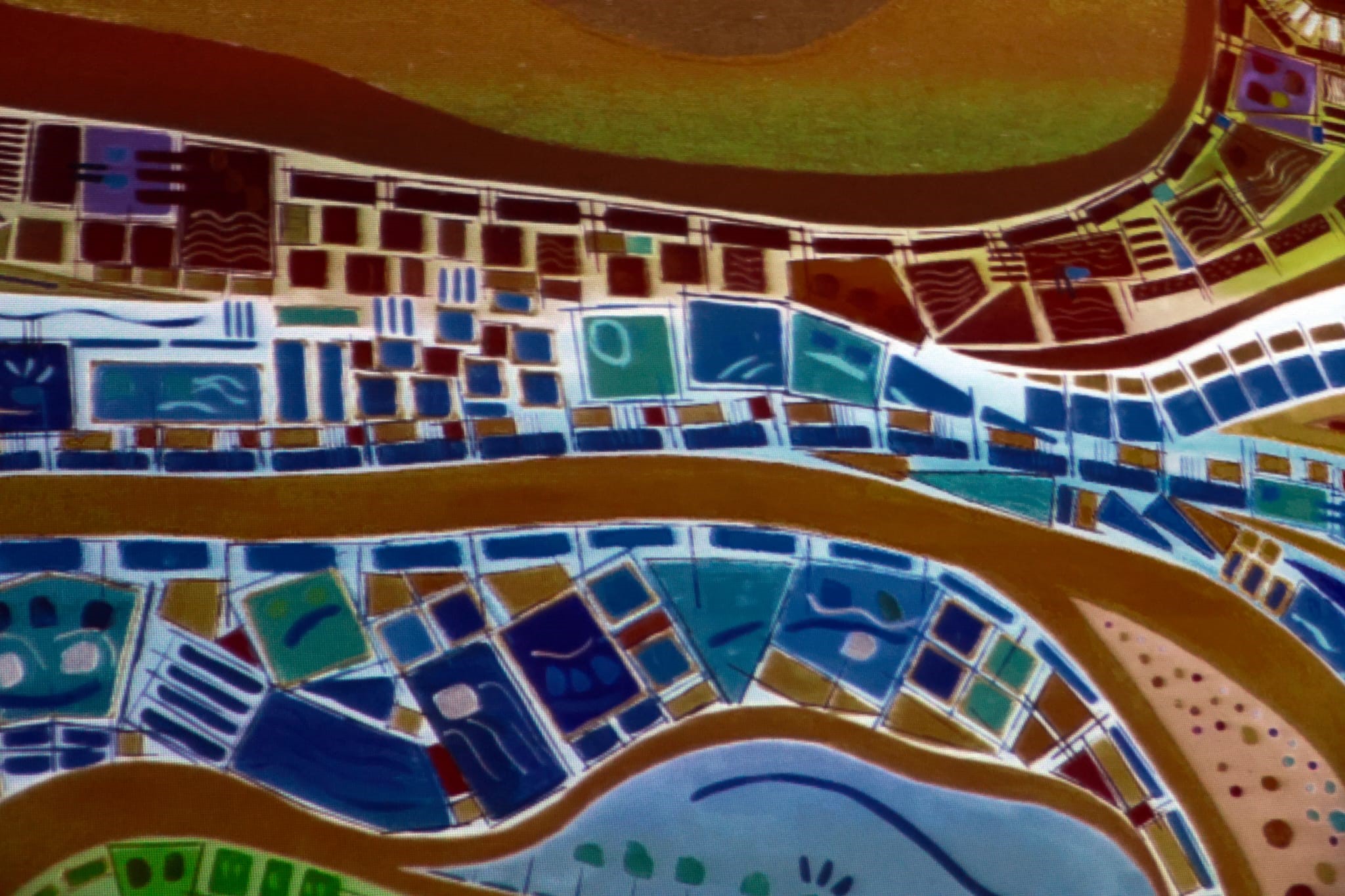 I quadri di Dijust ricercano l’emozione nei colori e rappresentano la trasposizione della realtà vista da una prospettiva dall’alto, alternata a segni intuitivi e a una ricerca di regolarità d’insieme. Ne deriva un effetto ottico di spaesamento, frutto di una ricerca stilistica che richiama Miró, ma in modo del tutto personale.