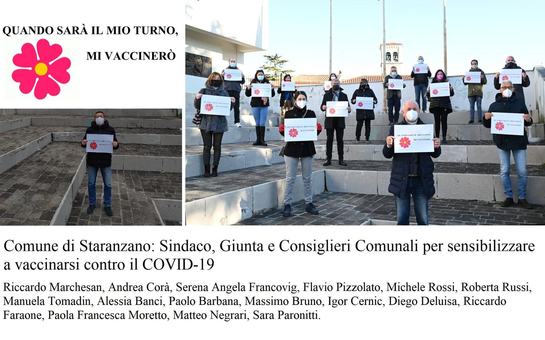 “Quando sarà il mio turno, mi vaccinerò”. Con questa frase, unita alla primula viola ideata dall’architetto Boeri e ormai divenuta il simbolo della campagna vaccinale, è partito un forte messaggio a favore della vaccinazione da parte dell’amministrazione comunale di Staranzano. Sindaco, giunta e consiglieri comunali hanno posato all’esterno del Municipio con in mano un cartello. Idea partita dal gruppo Sinistra per Staranzano e poi condivisa dalla maggioranza e dal consigliere Bruno.