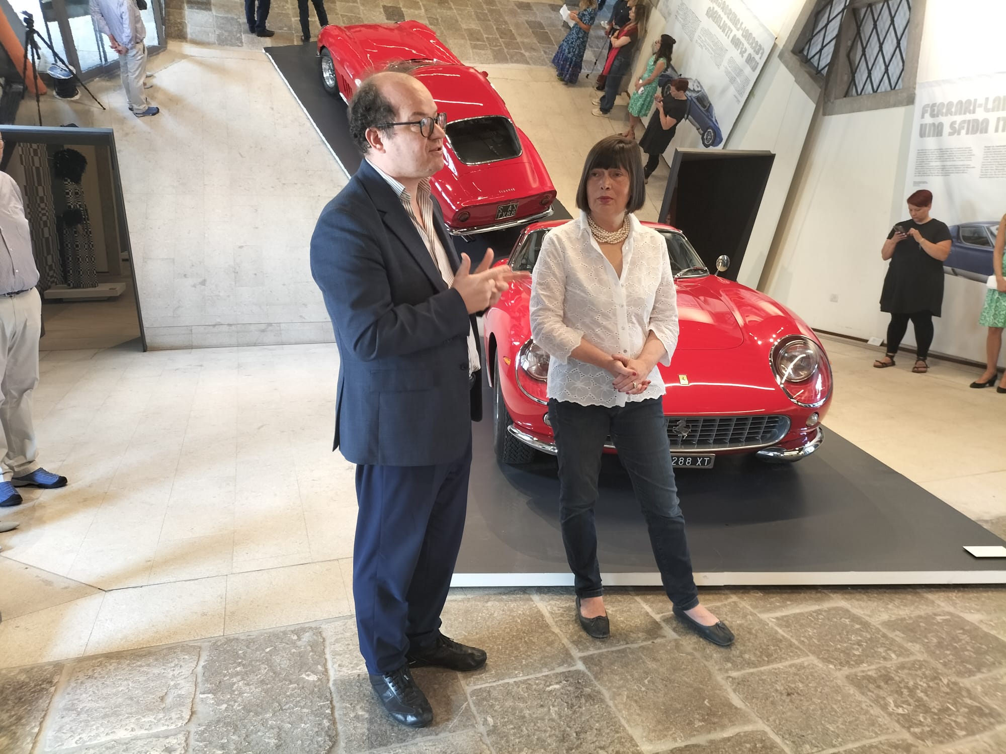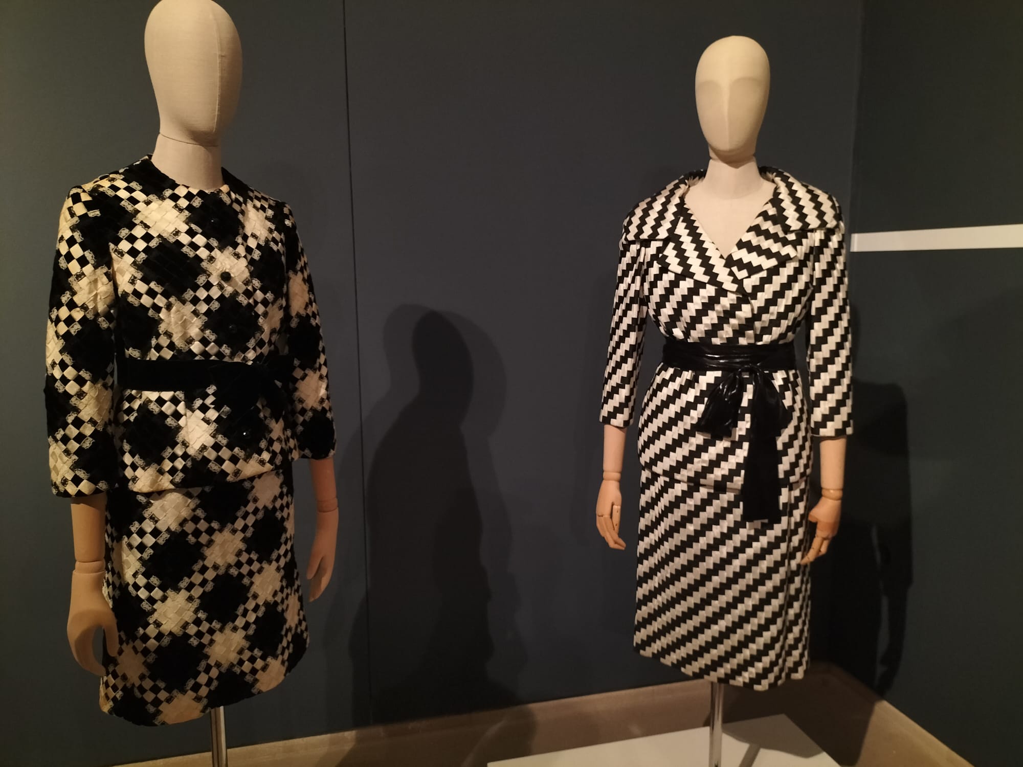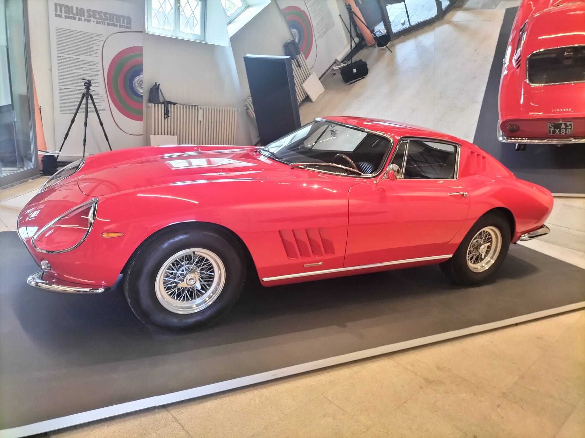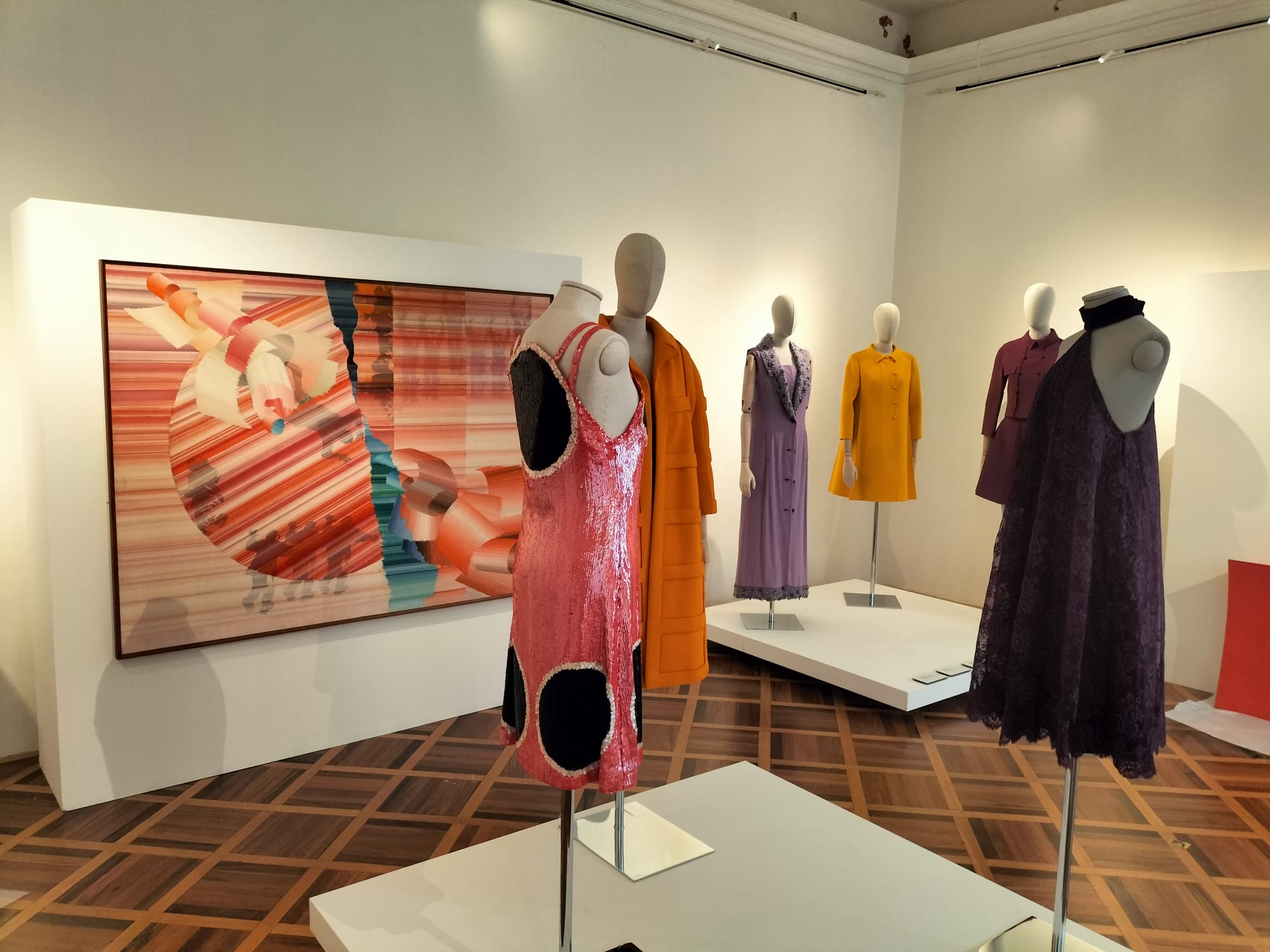La società di massa, con la ricerca di beni di consumo e la corsa delle industrie a produrli, sono ben testimoniati nel percorso espositivo che si apre nel salone al pianoterra, con la lucentezza della Ferrari 275 GTB del 1965 giunta in sede solo nel pomeriggio di ieri. Procedendo dal lato sinistro rispetto all'ingresso, le sale vedono affiancarsi abiti, opere d’arte e oggetti di design secondo una scelta per temi intenzionata a dimostrare come il gusto fluisse liberamente condizionando arredamento, abbigliamento, scultura e pittura. L’optical art domina le prime due sale con gli abiti di Capucci e Germana Marucelli accanto ai lavori di Getullio Alviani e a opere decorative come le piastrelle di Gio’ Ponti per l'Hotel Parco dei Principi.
