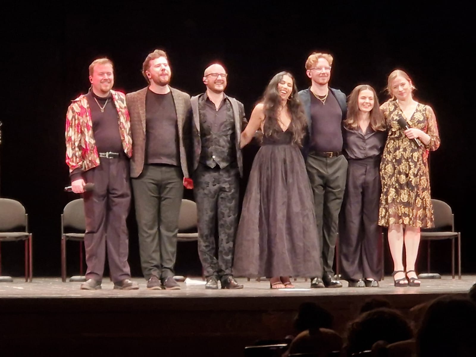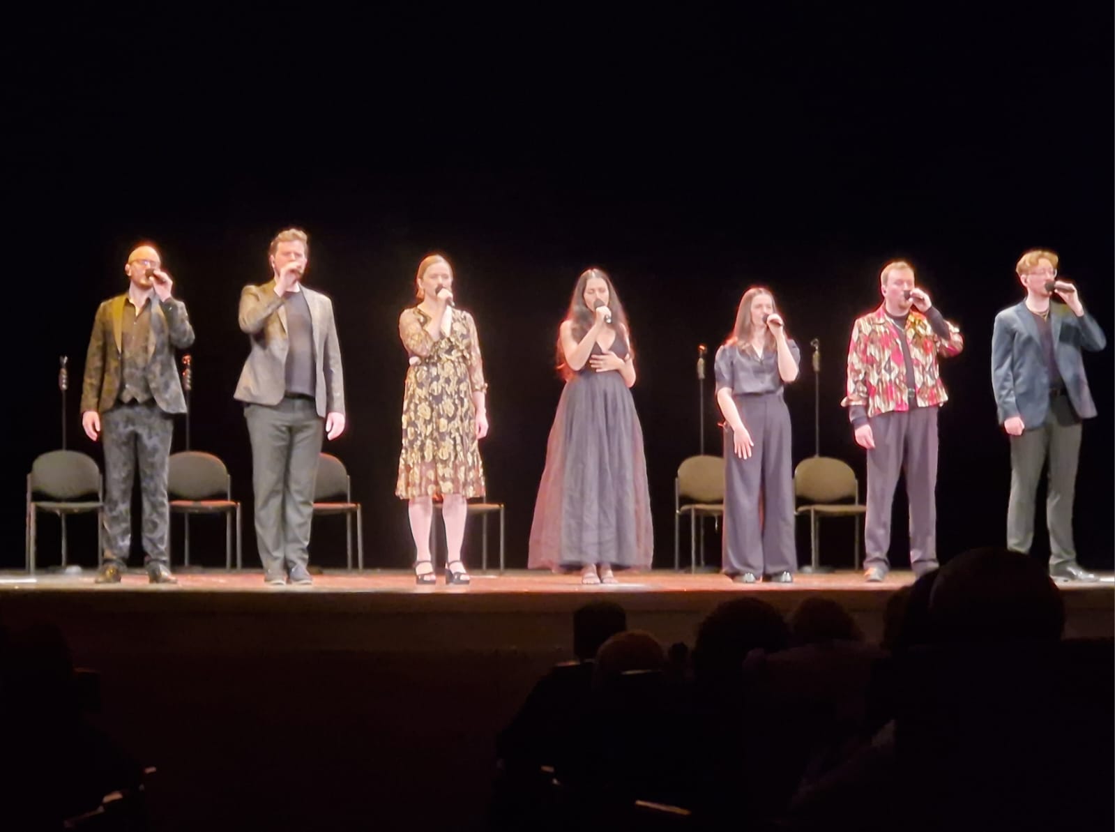 Variopinta la carrellata di canzoni dedicate al Natale, fra cui non poteva mancare la dolcezza di “Silent Night” – in italiano “Astro del ciel” – tradotta in oltre 300 lingue a celebrare il mistero della nascita di Gesù. «Un brano – rimarcano in inglese al microfono - in origine intitolato “Stille Nacht”, scritto nel 1816 dal salisburghese Joseph Mohr» e poi trasposto in musica dal compositore Franz Xaver Gruber. Dall’Ottocento al nostro Duemila, non c’è Natale senza la ninna nanna che nella notte silenziosa inneggia al Cristo rinato: a interpretarla è stato prima il gruppo femminile, quindi quello maschile, uniti infine in un corale abbraccio. Sette sedie contro un fondale scuro e solo la voce possente intercalata al battito delle mani o allo schiocco delle labbra, per riproporre poi l’allegria di “Jingle Bells”, scritta da James Lord Pierpont nel 1857 e negli anni cantata dalle stelle Louis Armstrong, Frank Sinatra o Luciano Pavarotti. È battendo le mani sulle ginocchia che prende invece vita “Tidings (The Hampton Court Carol)”, rivisitazione del canto tradizionale inglese attraverso ritmi swing, influenze folk e virtuosismi. Potente e grandioso s’innalza a seguire il noto ritornello di “Carol of the Bells” – brano conosciuto anche come “Ukrainian Bell Carol” - composto da Peter Wilhousky sulla melodia di Mykola Leontovyč.